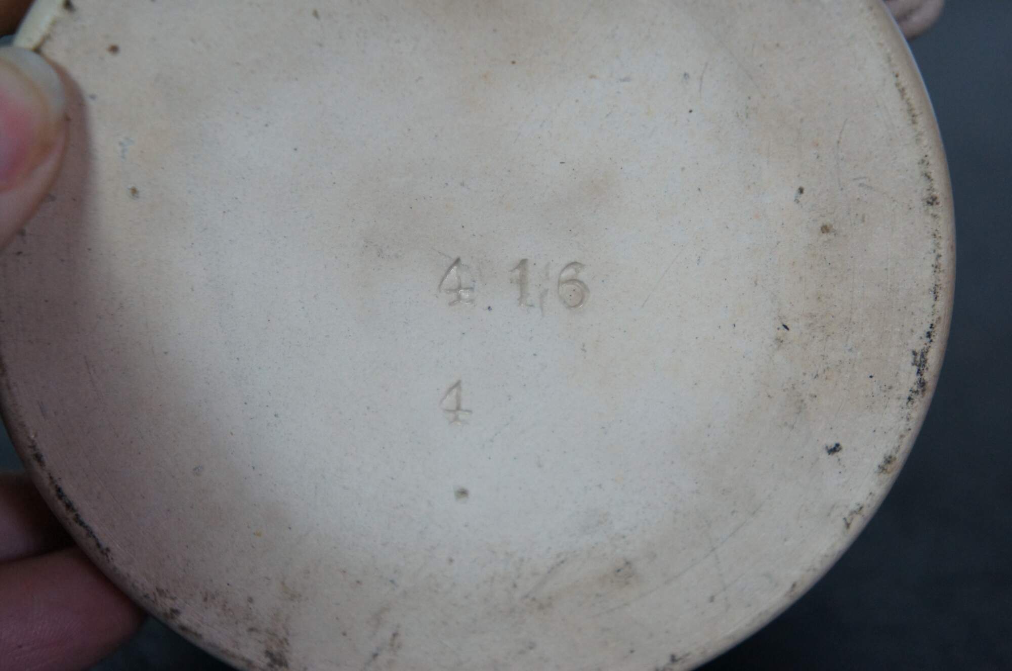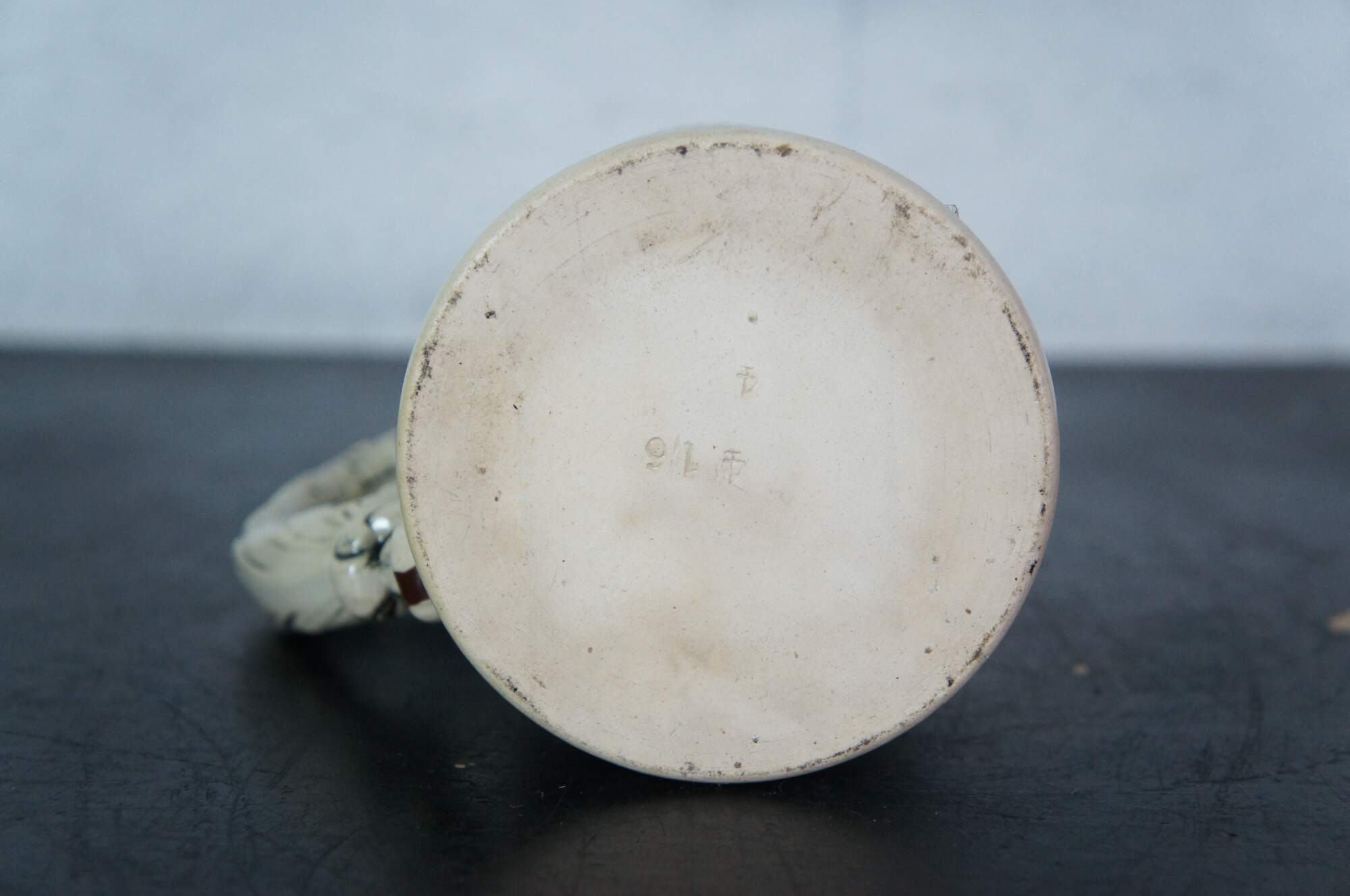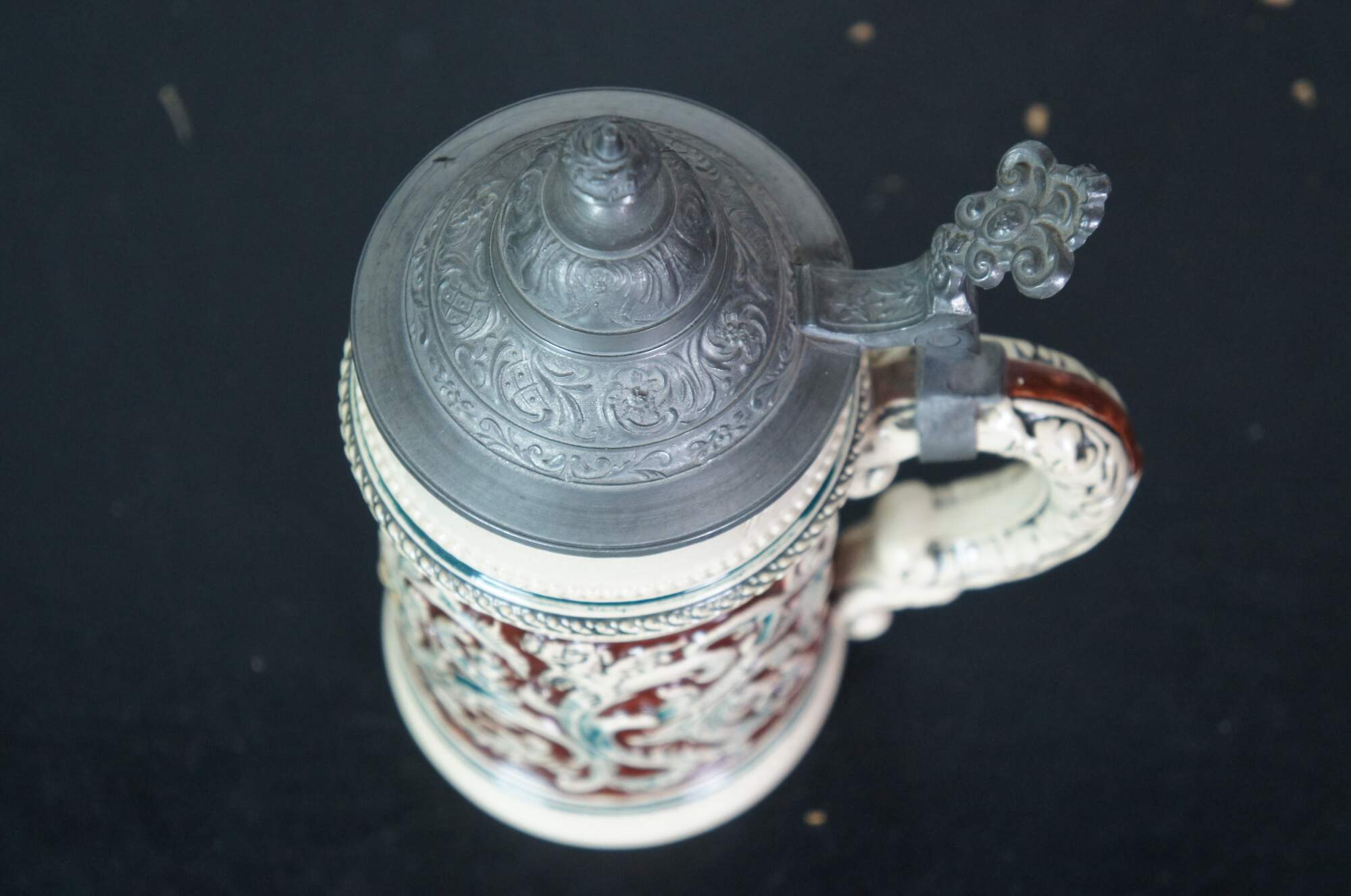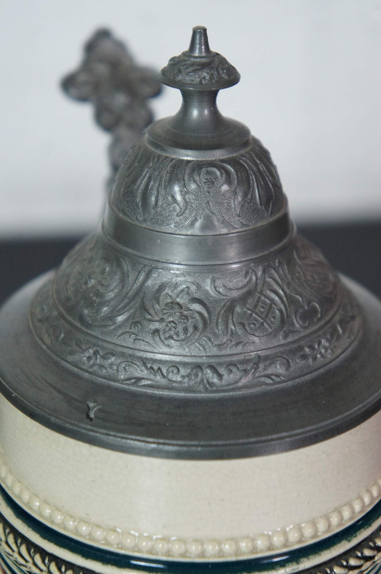 Early to mid 20th century German beer stein / tankard - cream colored stoneware glazed in red and green, featuring a scrolling foliate and floral design with winged cherubs flanking the portrait of an 18th century Colonial gentleman in a tricorn hat. Stamped tin flip top lid. Marked 416 on side and base.