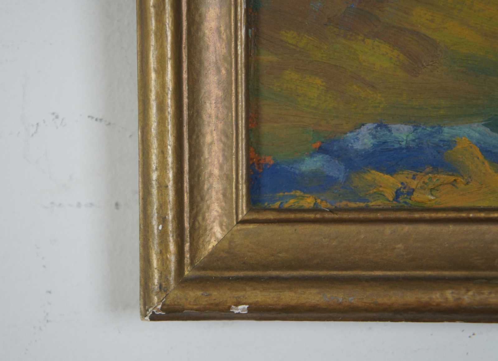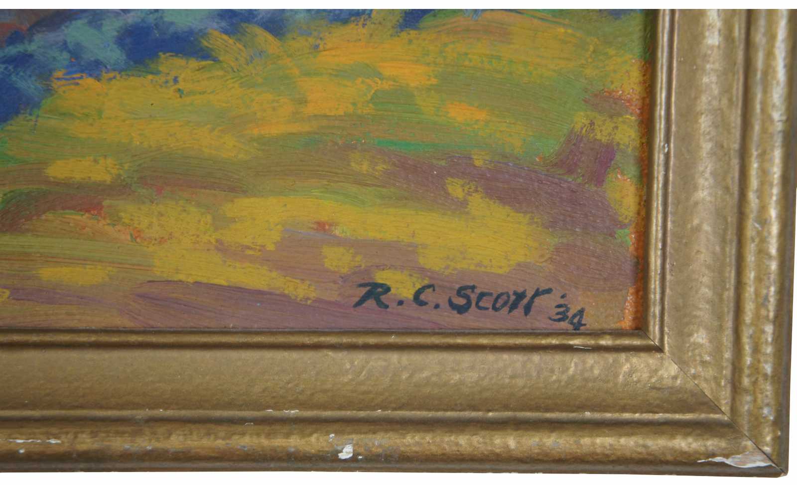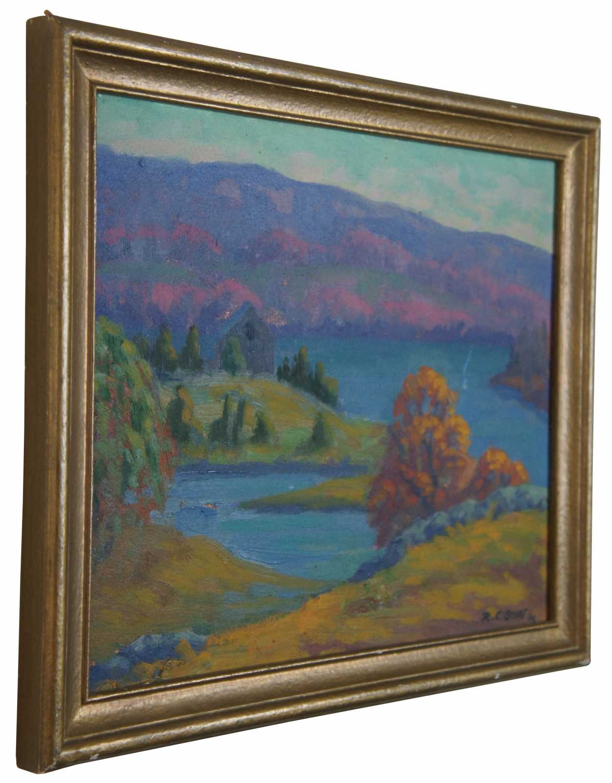 Antique 1934 impressionist oil on board landscape painting titled Smithfield Reservoir, R.I. by Ralph C. Scott. Personalized by the artist for his friend. Ralph C. Scott (Born 1896) was active/lived in Massachusetts. Ralph Scott is known for Town-landscape, coastal views.