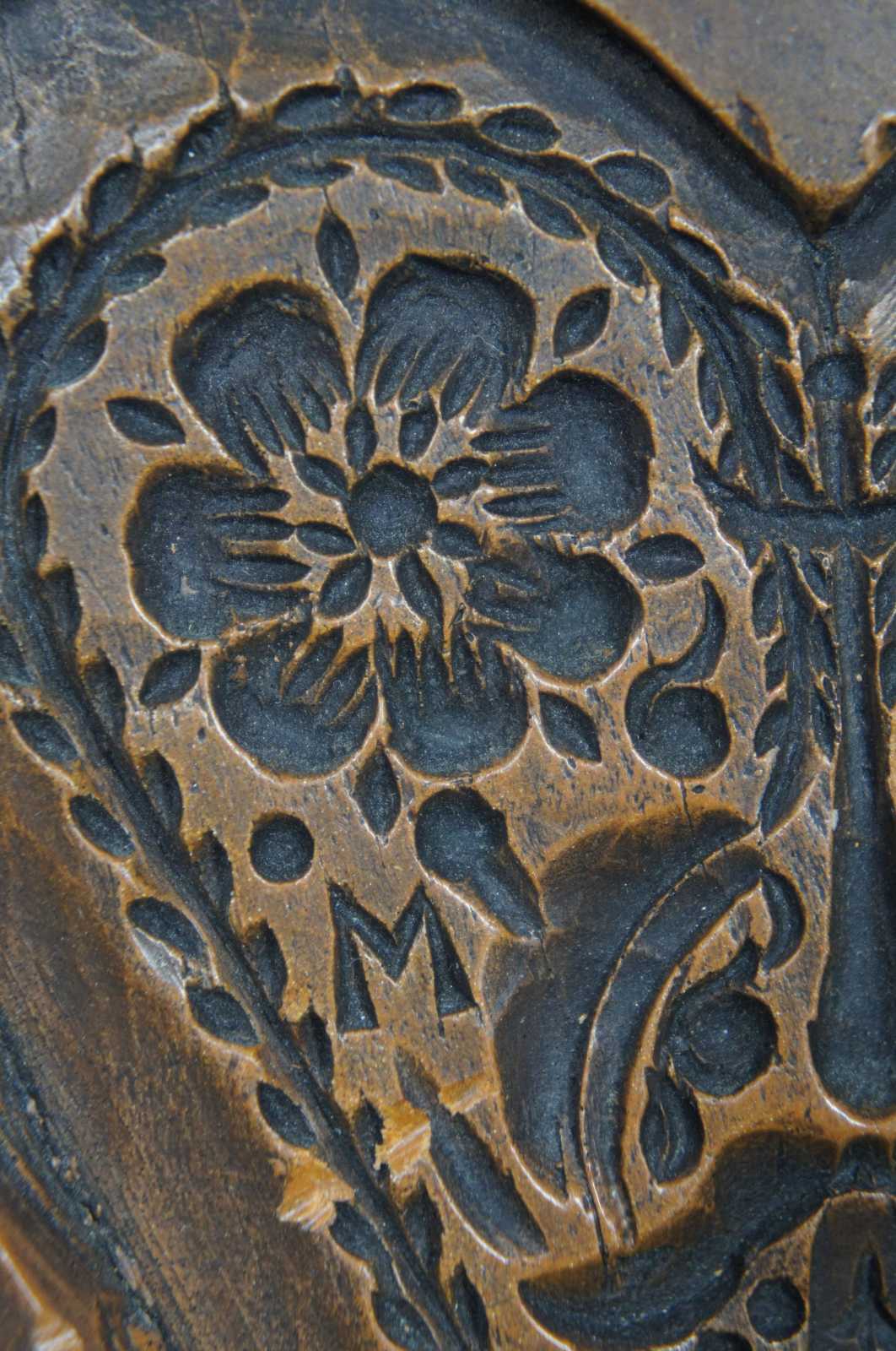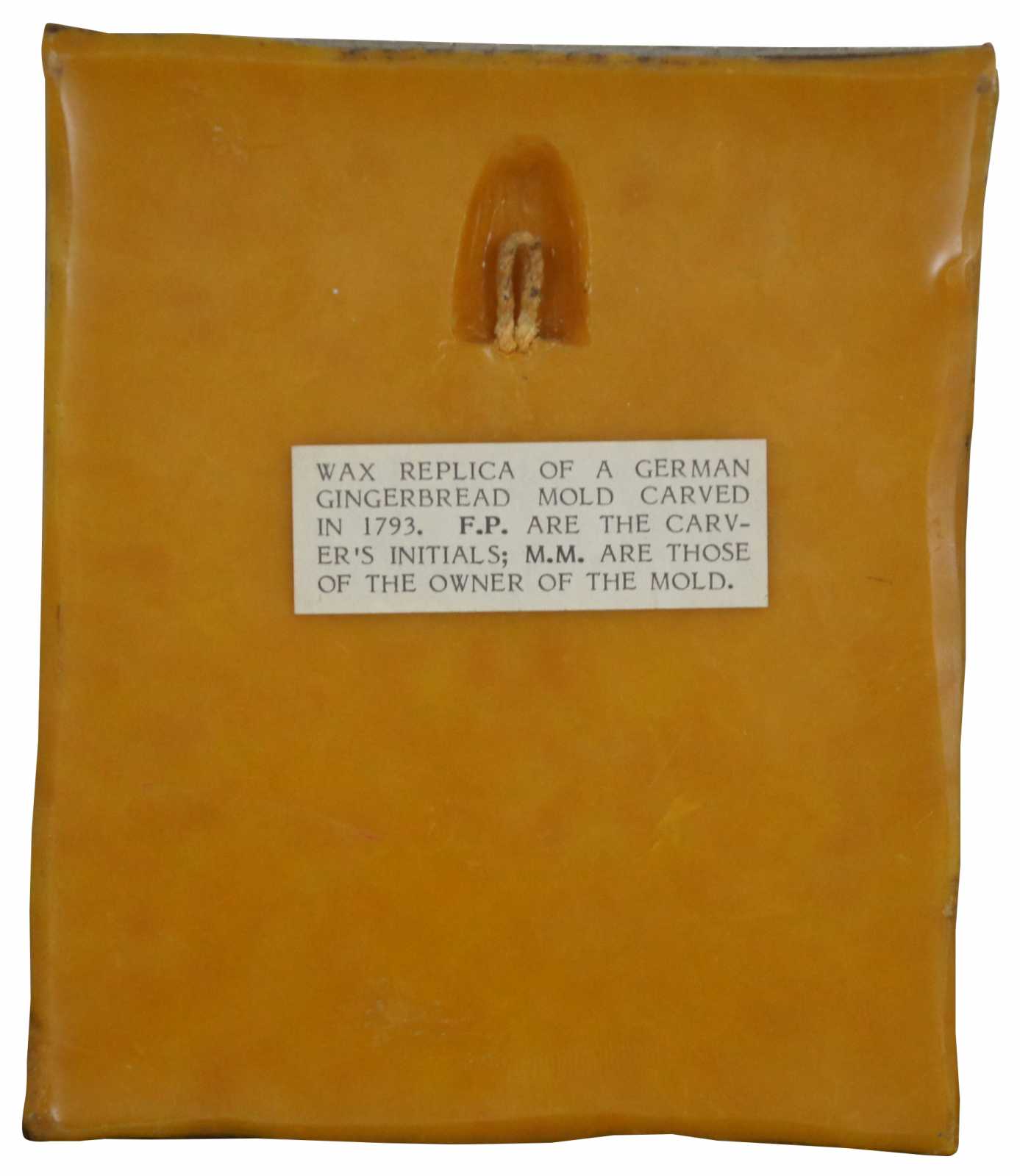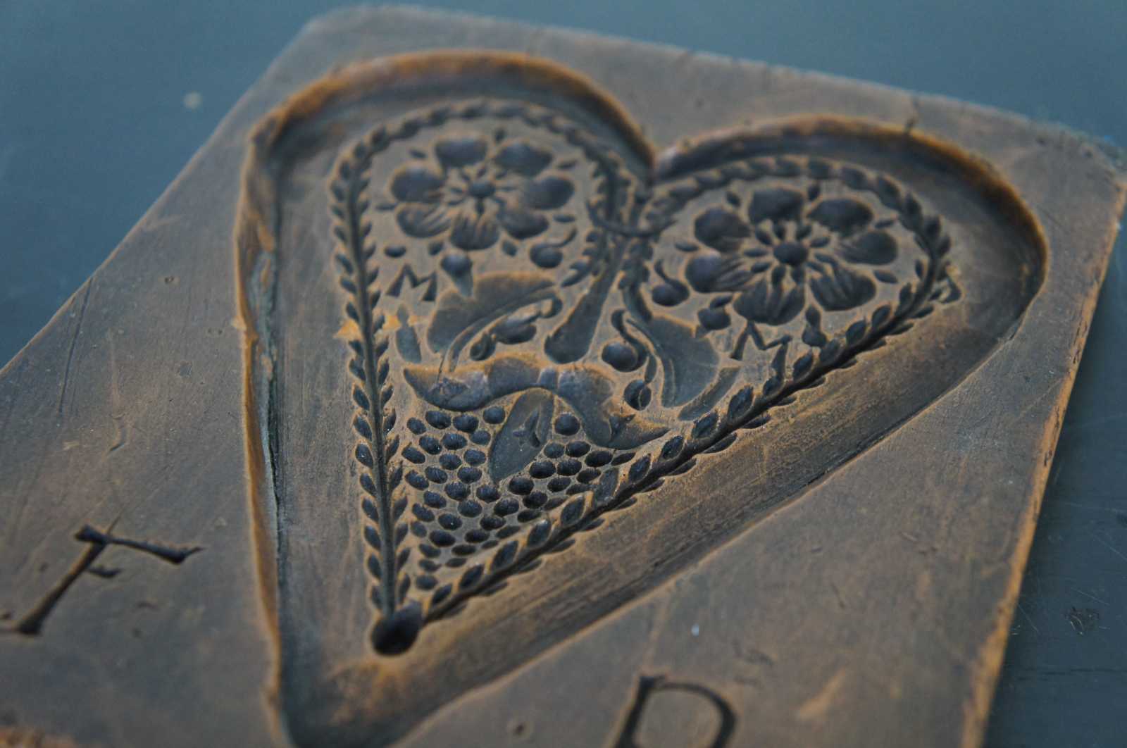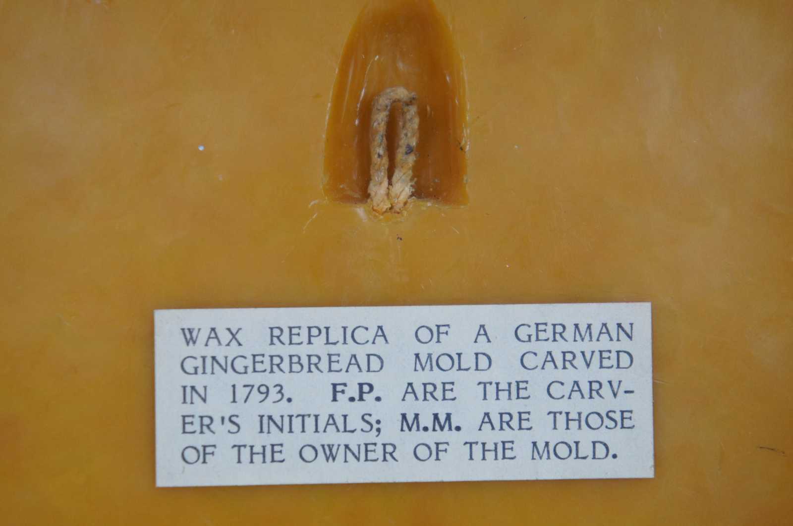 Vintage wax replica of a 1793 German gingerbread mold featuring a floral heart; string loop on the back allows for hanging as a kitchen decoration.