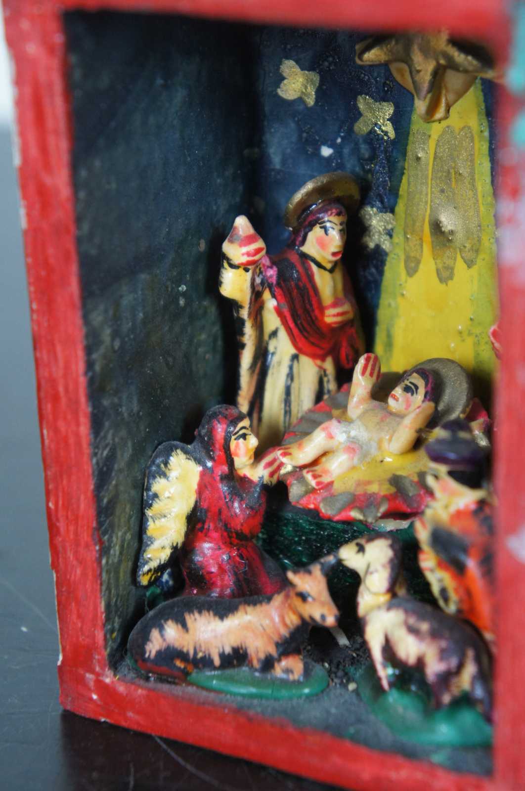 Vintage South American folk art, hand painted Christmas Nativity or Creche in a house shaped box. Features baby Jesus, angel figures, animal figures.