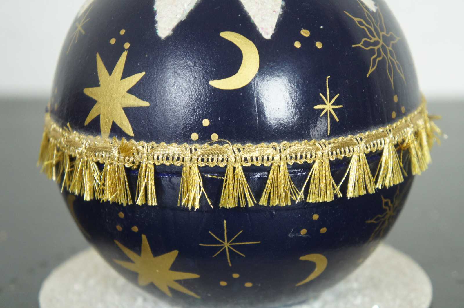Stellar Santa” limited edition paper mache and plaster candy container featuring Santa Claus in a purple robe and holding a Christmas tree, perched on the top of a star spangled blue globe box with gold tassel fringe. Numbered 64/600, made for Chistopher Radko from Ino Schaller 19th century molds.
