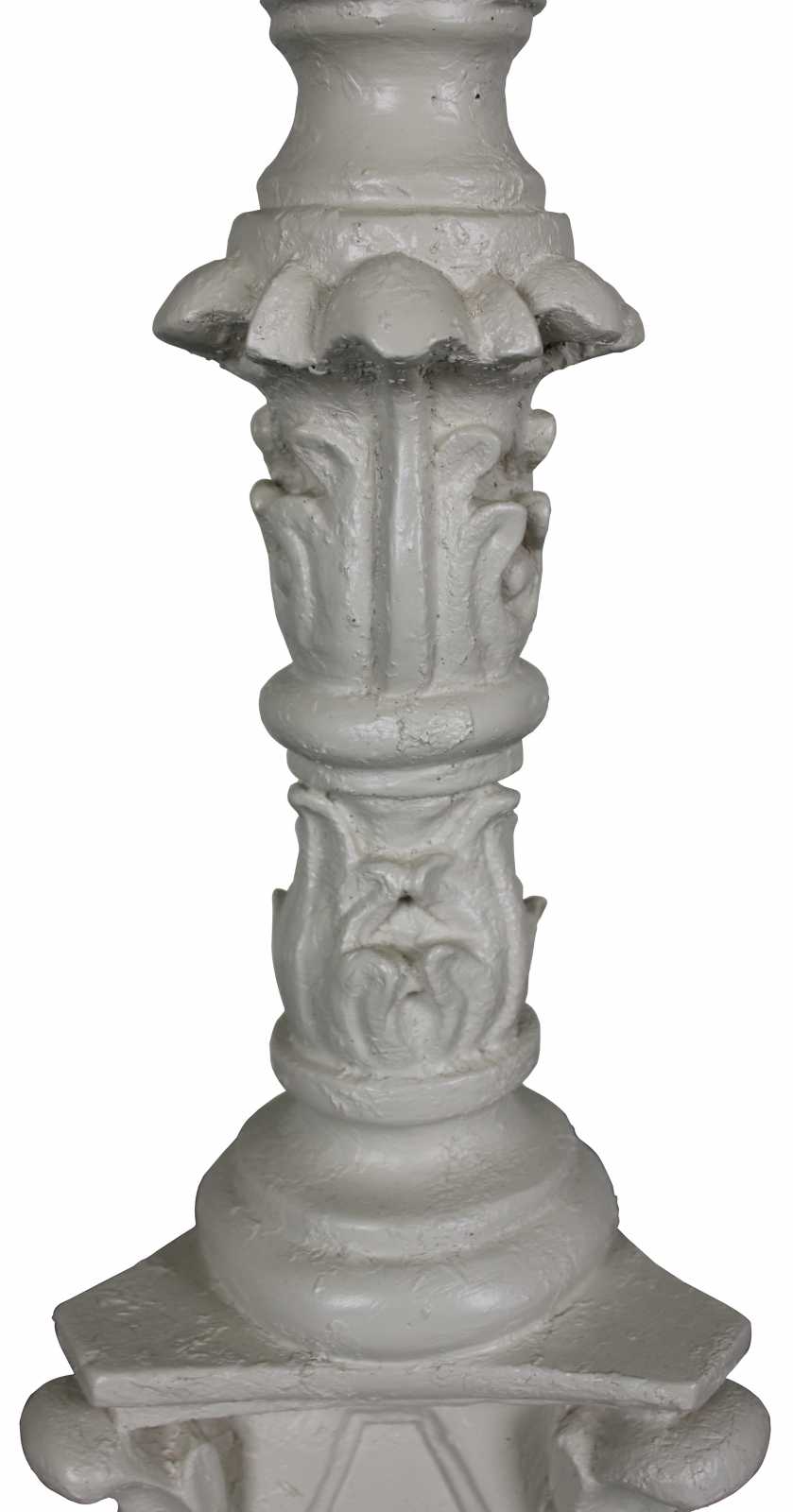 Vintage Barbara Cosgrove lamp. Features a baroque styling with white painted finish, footed tripod base and black shade.