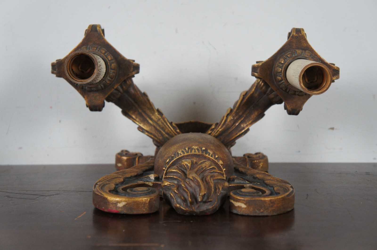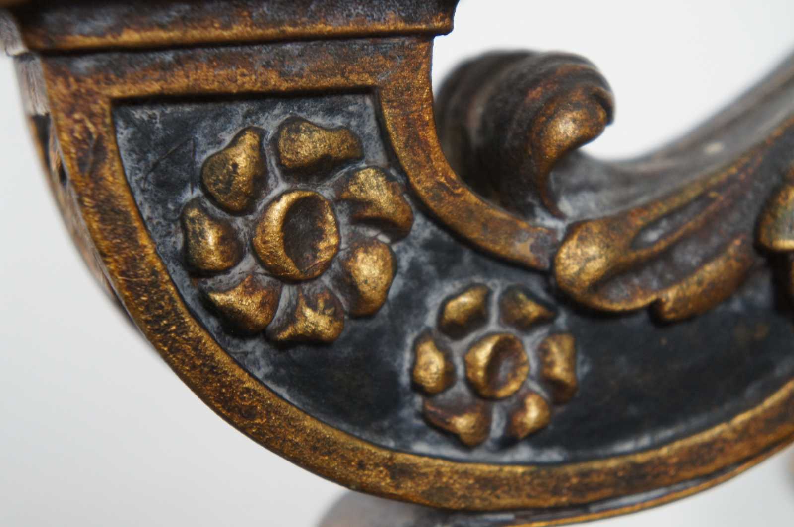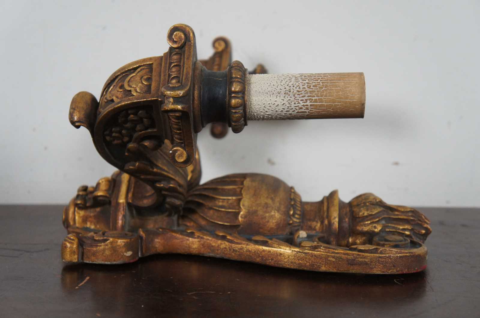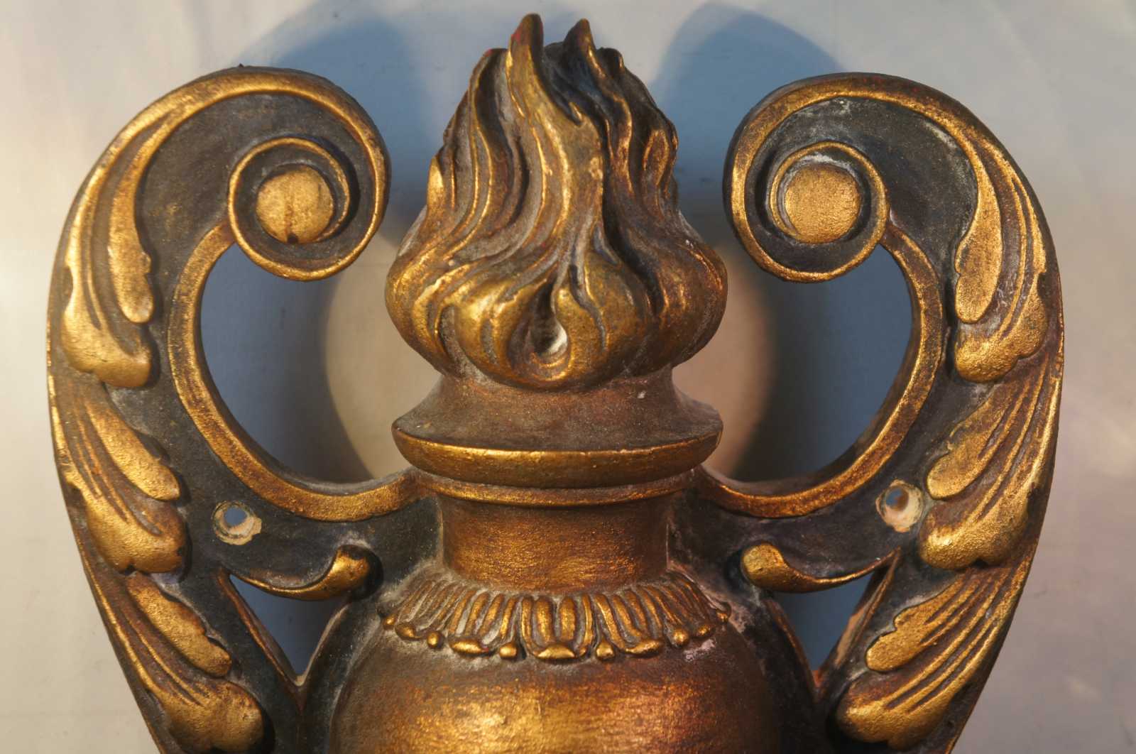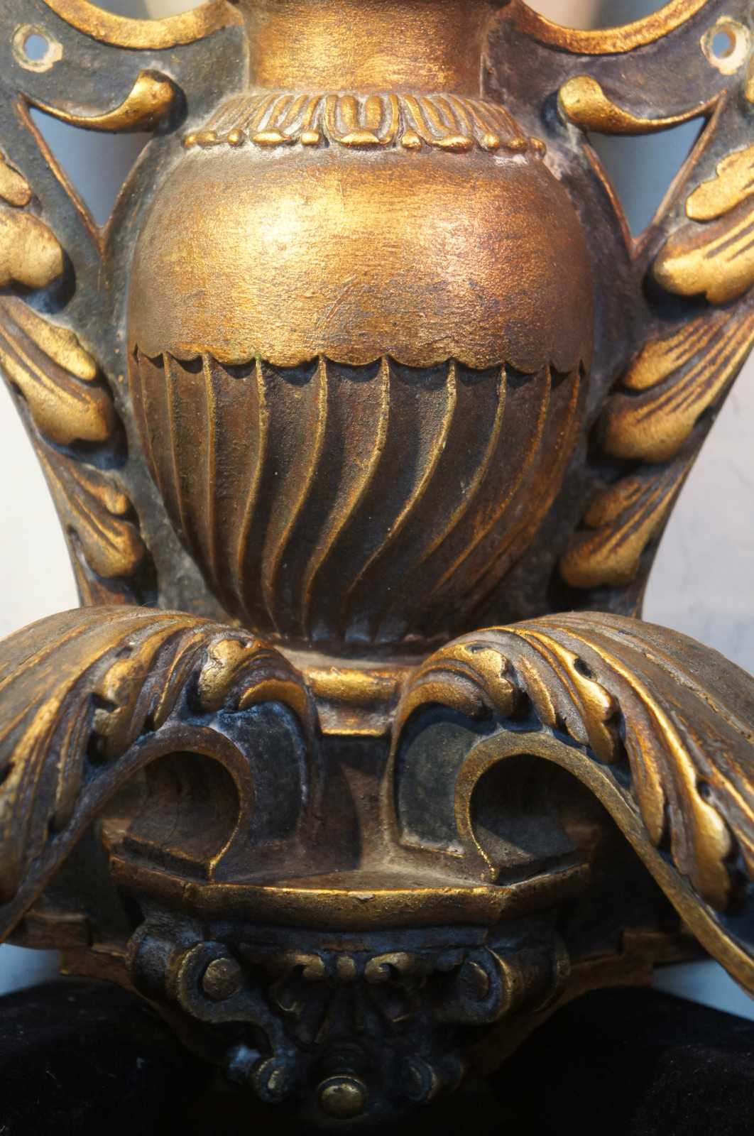 Circa 1910 baroque revival electric wall sconces in the shape of black and gold (Dore) wall mounted candlesticks decorated with leaves, flowers and a flaming urn.