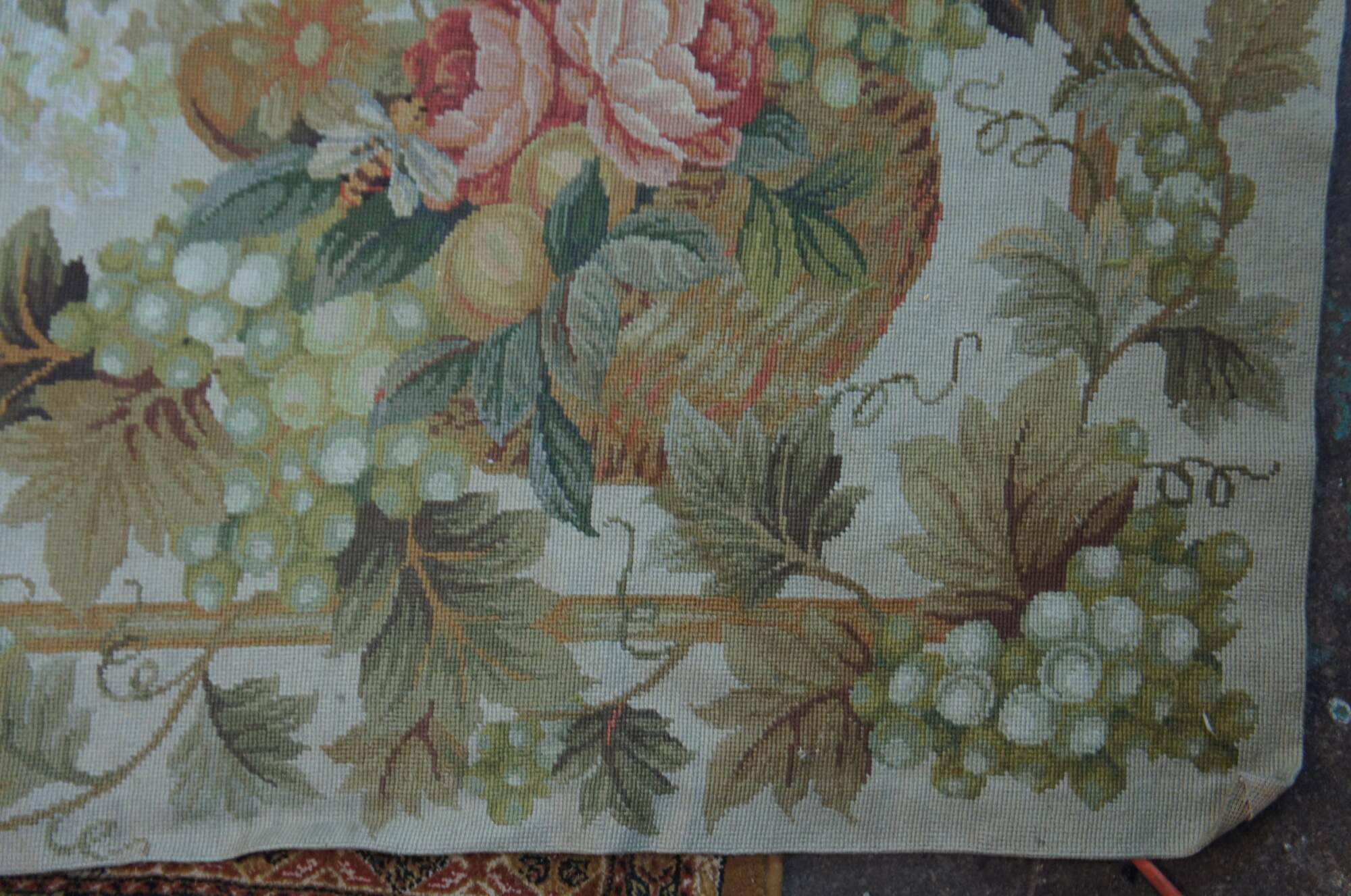 Large antique French aubusson needlepoint tapestry featuring a design of grape vines and leaves, with bees buzzing among the foliage and baskets of roses at the corners.