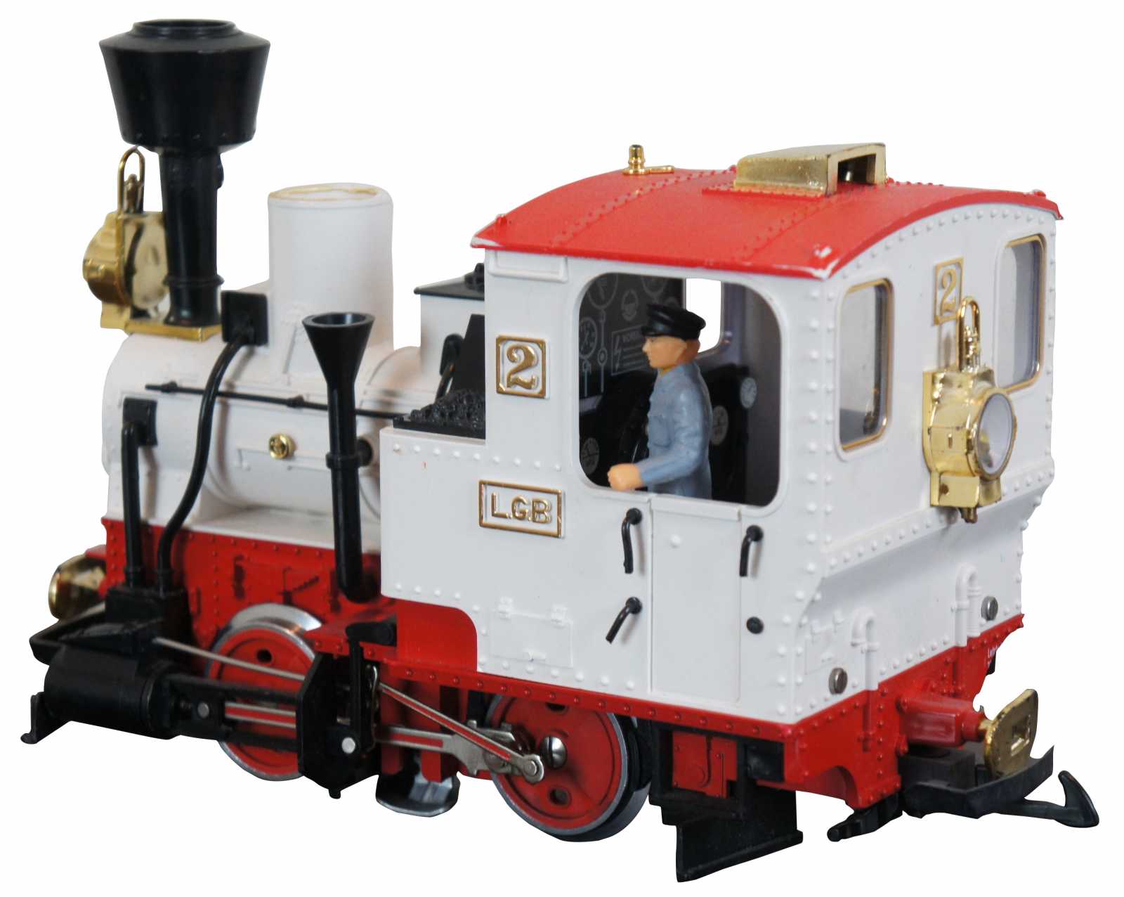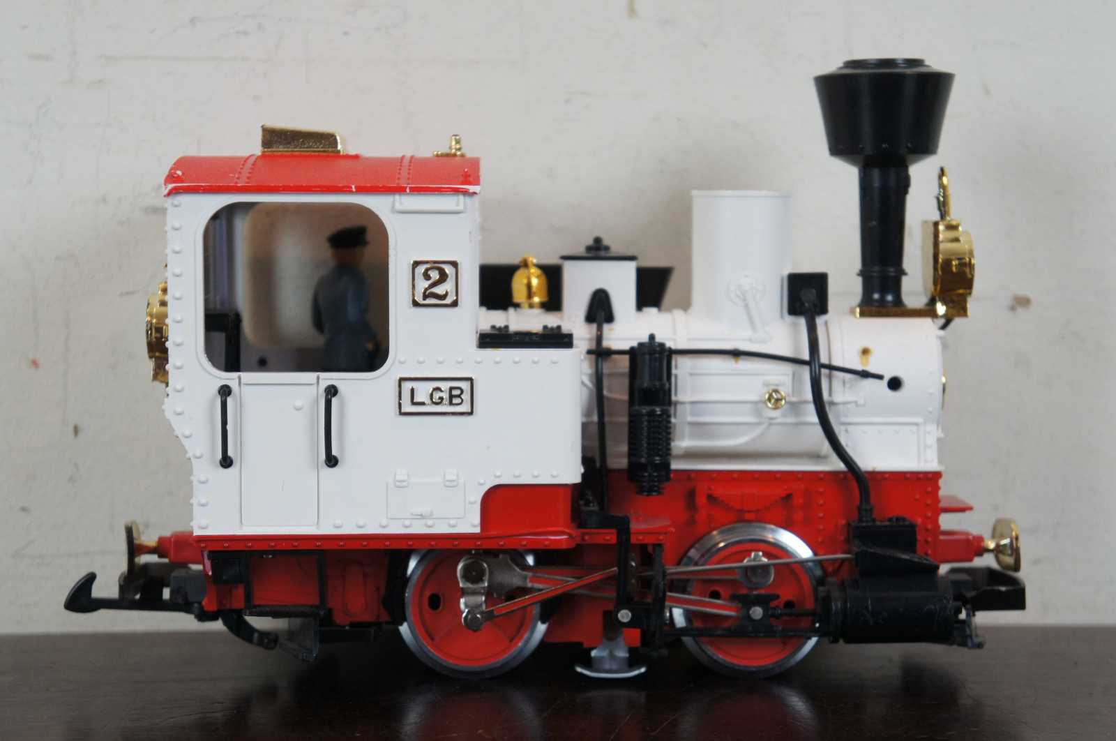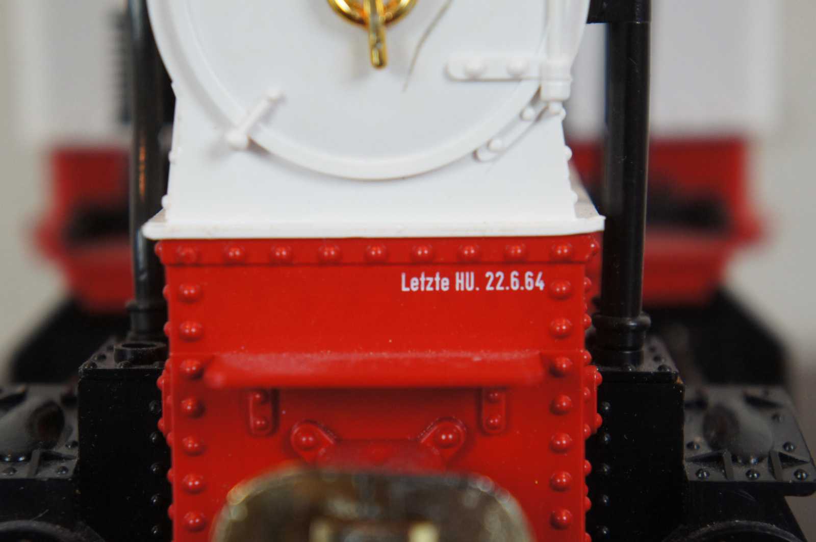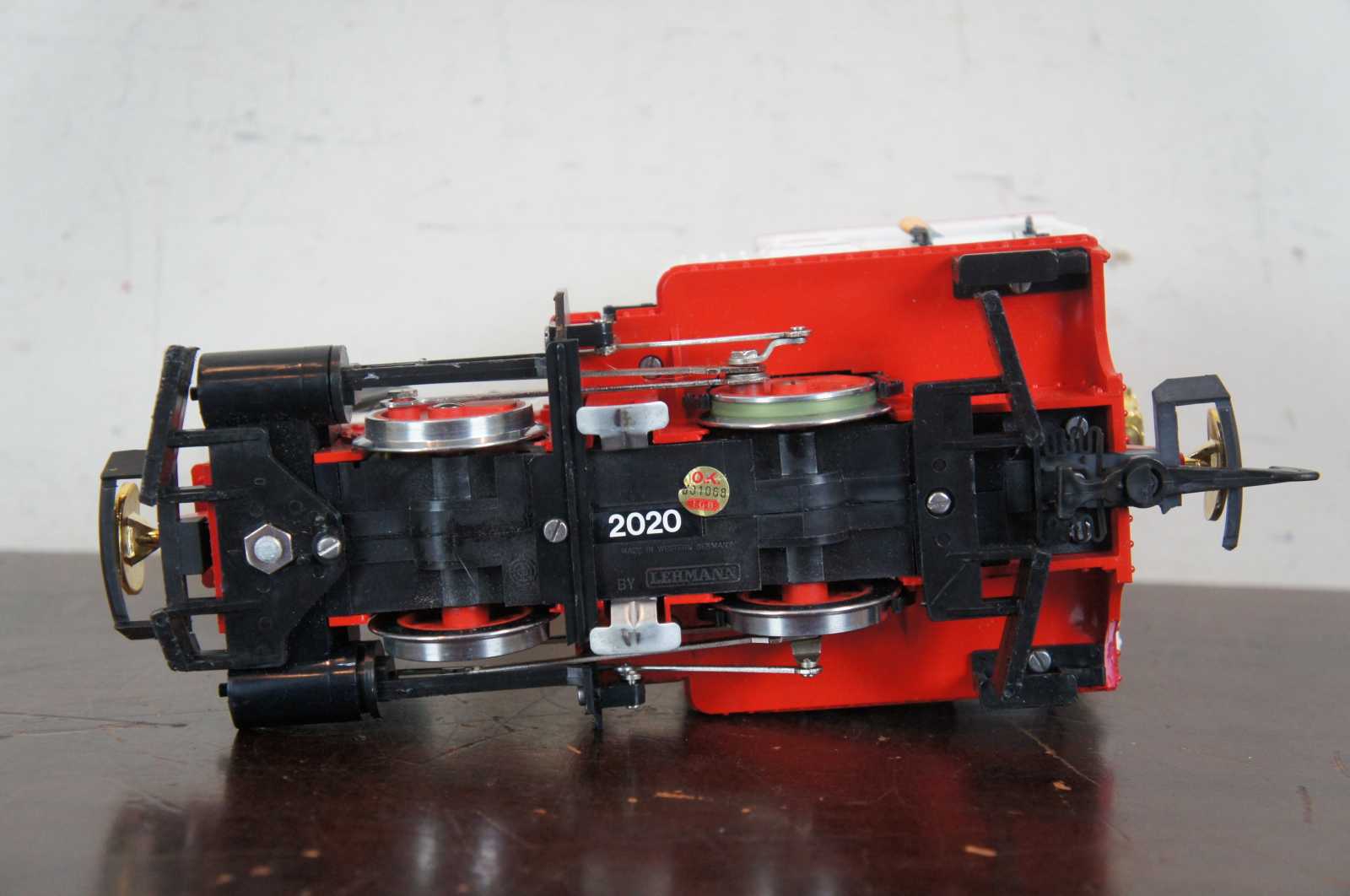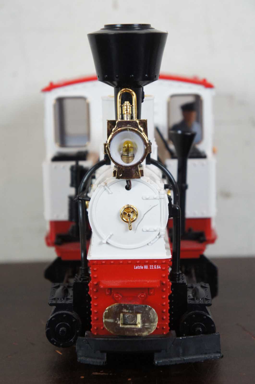 1980’s Lehmann-Gross-Bahn 2020 Stainz 2 steam locomotive for the G scale 21988 Circus Train. Letzte HU 22.6.64 chassis painted in red and white with conductor driving.