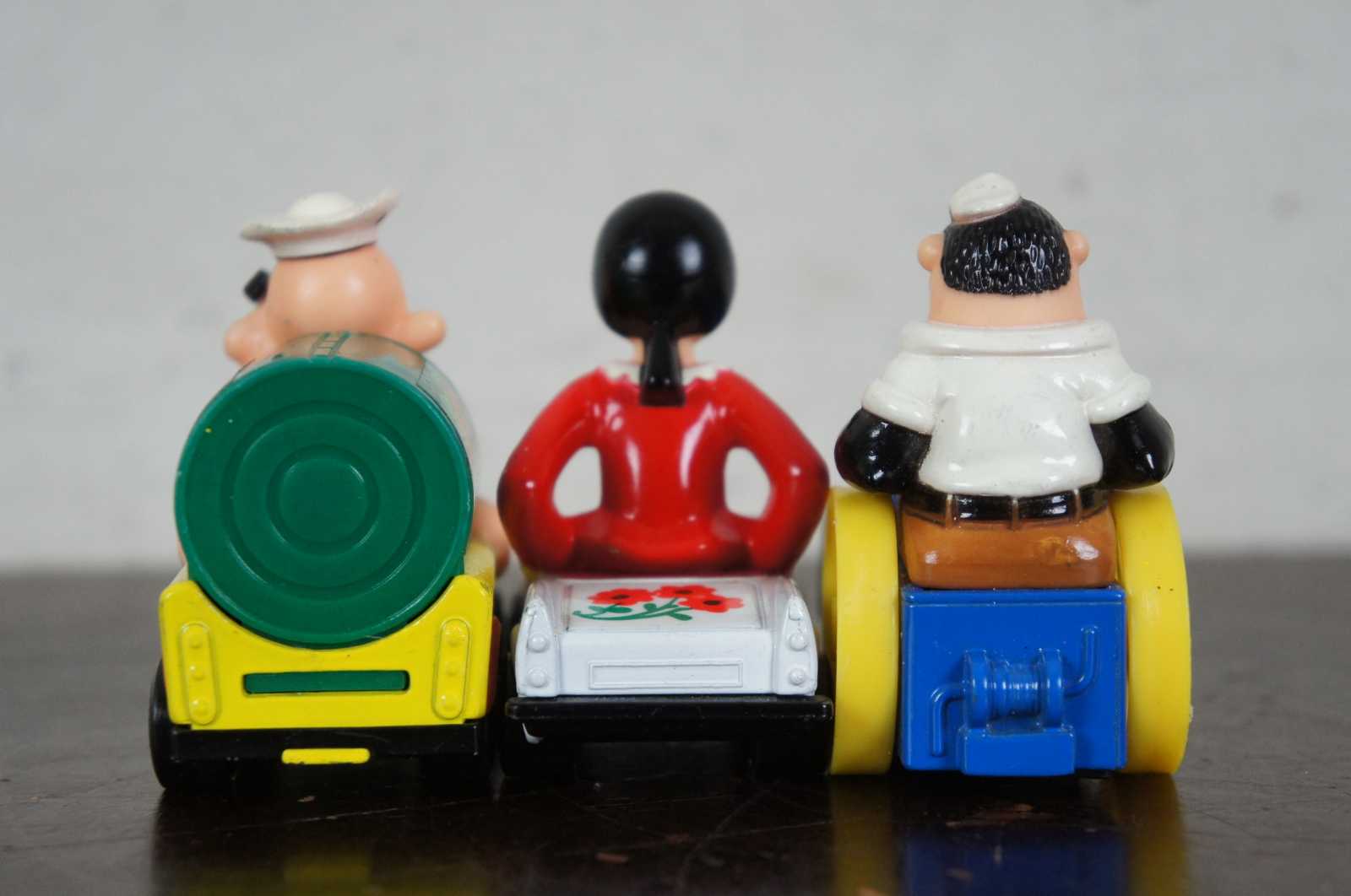 Vintage 1980 Matchbox character series die cast cars by Lesney, featuring No. 13 Popeye the Sailor Man and his spinach wagon, No. 14 Bluto and his road roller, and No. 15 Olive Oyl in her convertivle sports car.