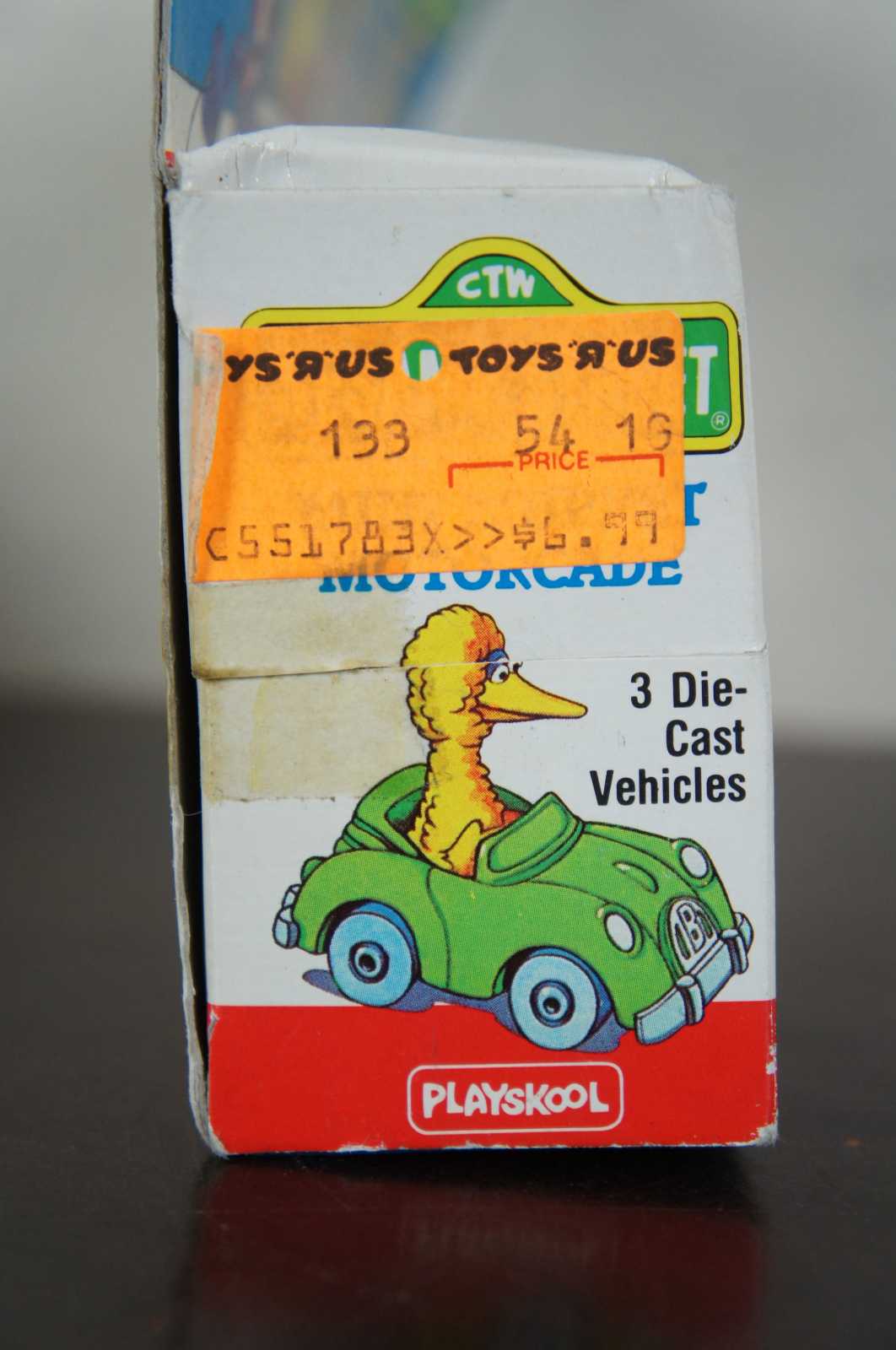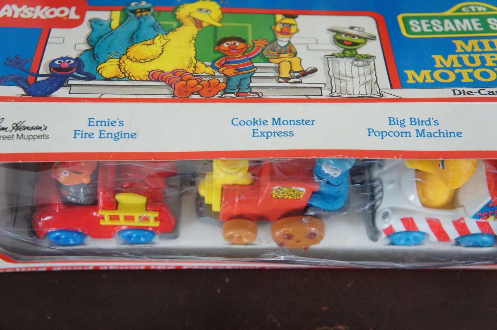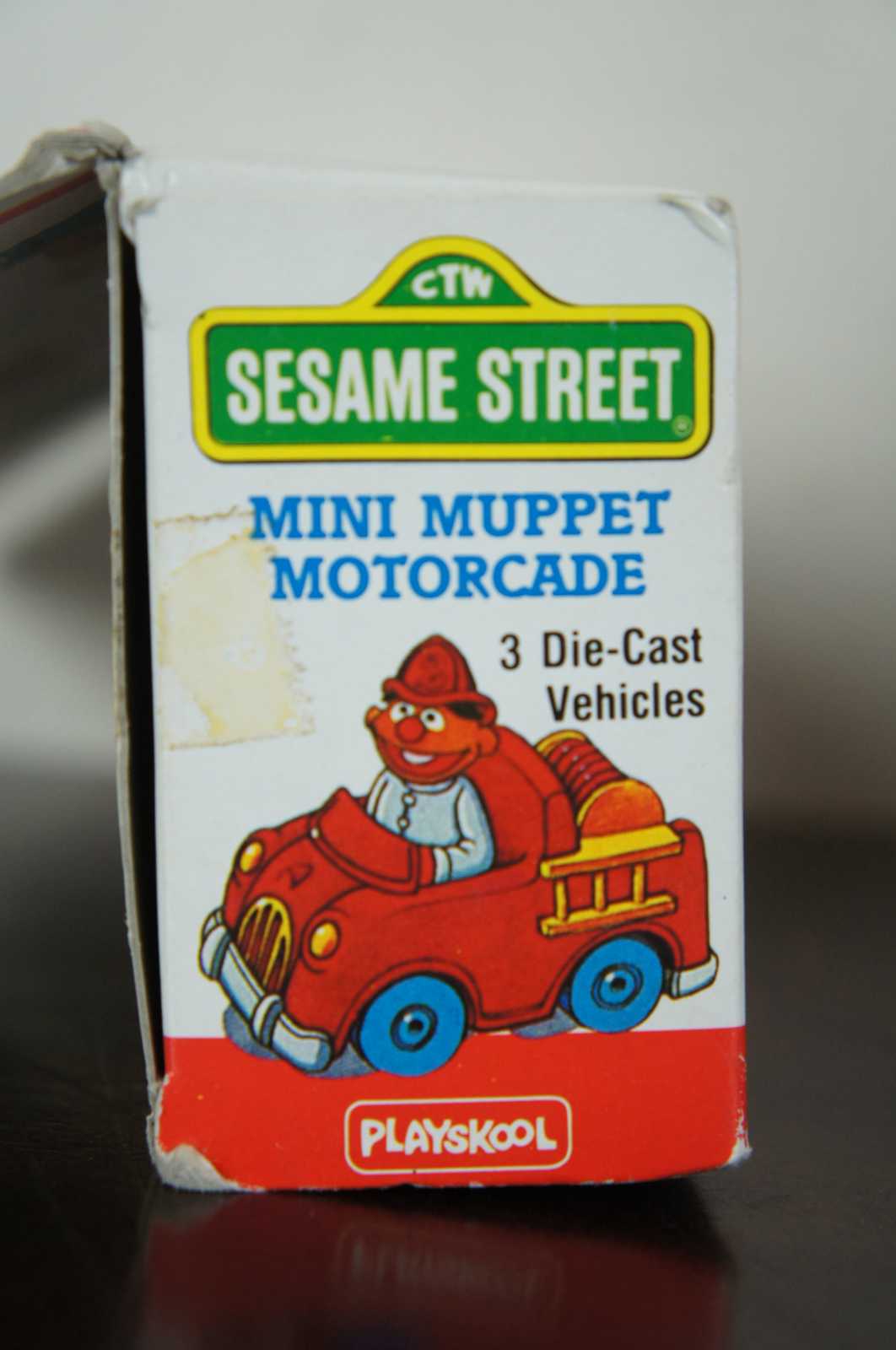 3 Playskool Sesame Street Mini Muppet Motorcade die cast vehicle sets from 1985; includes two sets with Big Bird Convertible, Bert’s Taxicab and Oscar the Grouch Trash Delivery and one set of Ernie’s Fire Engine, Cookie Monster Express and Big Bird’s Popcorn Machine.