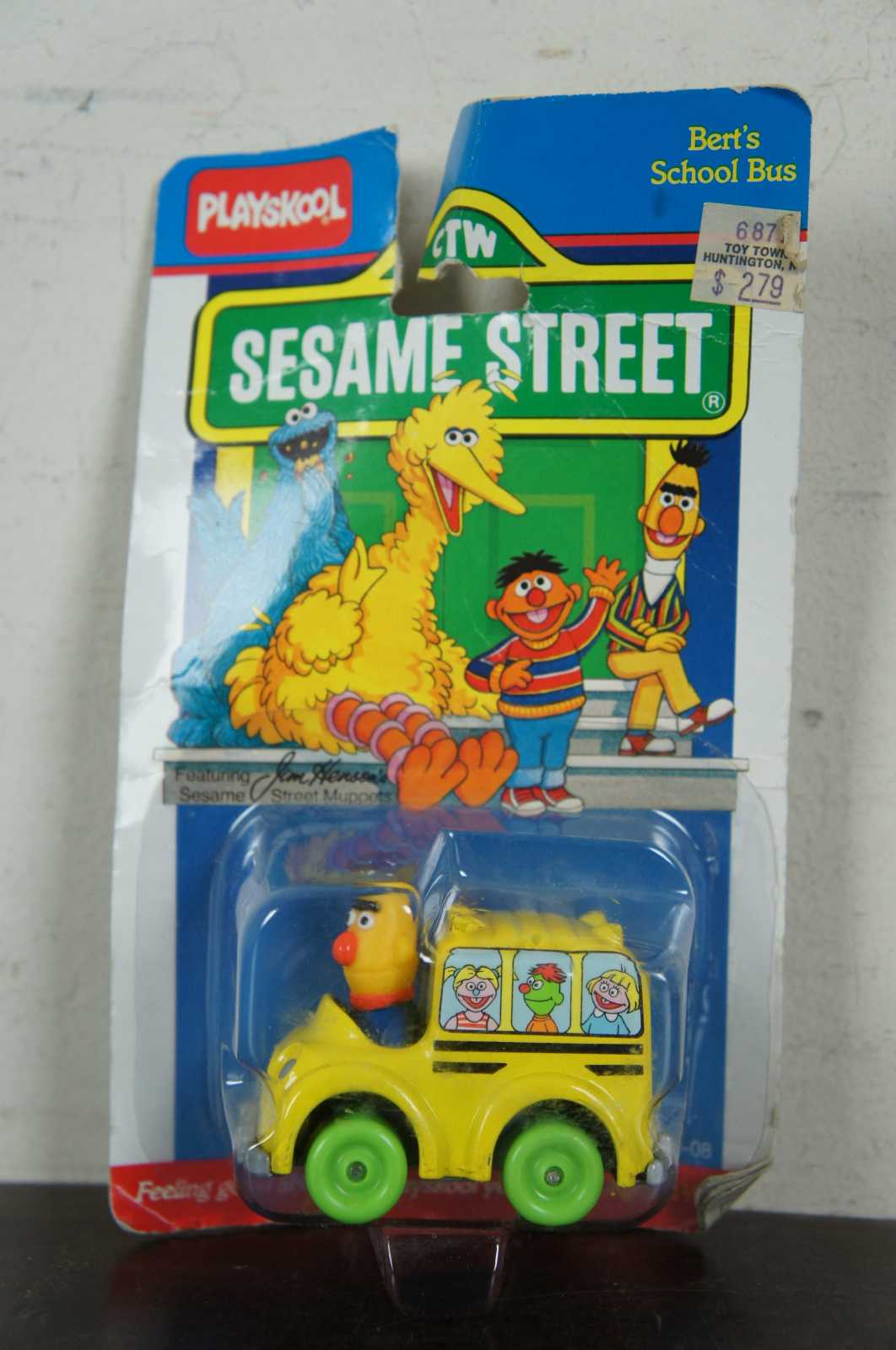 Lot of six unopened 1986 Playskool Sesame Street cars including Oscar the Grouch’s Bulldozer, Cookie Monster’s Cookie Mixer, Bert’s School Bus, Bert’s Taxicab, Big Bird’s Dump Truck, and the Count’s Countmobile.