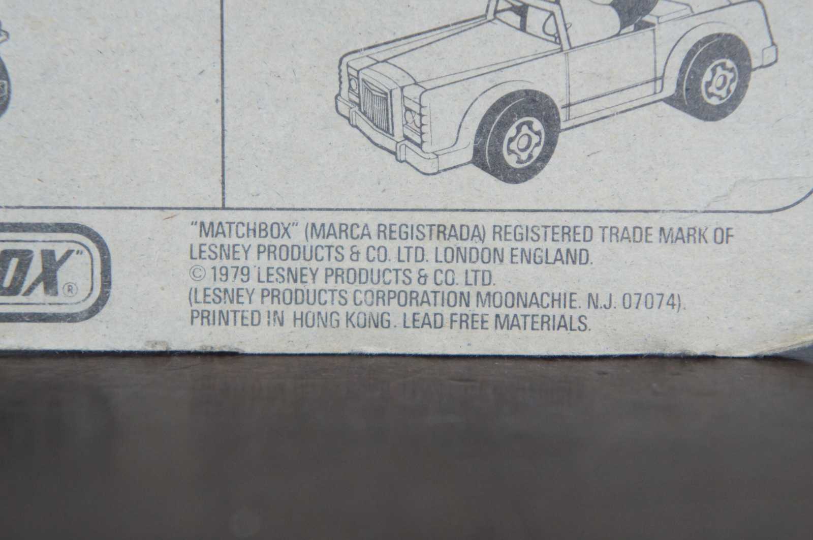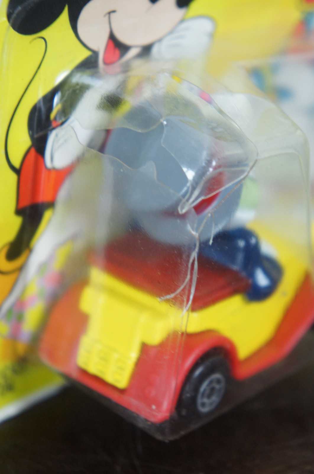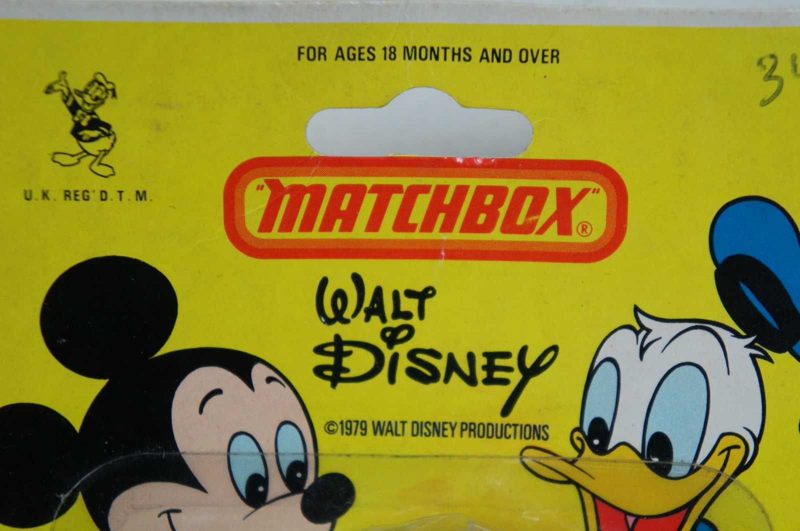 Set of four vintage 1979 die cast metal cars by Matchbox with Walt Disney characters driving. Set includes (unopened) Jiminy Cricket, Mickey Mouse, and Goofy in a green hat plus (without packaging) Goofy in a leather helmet.