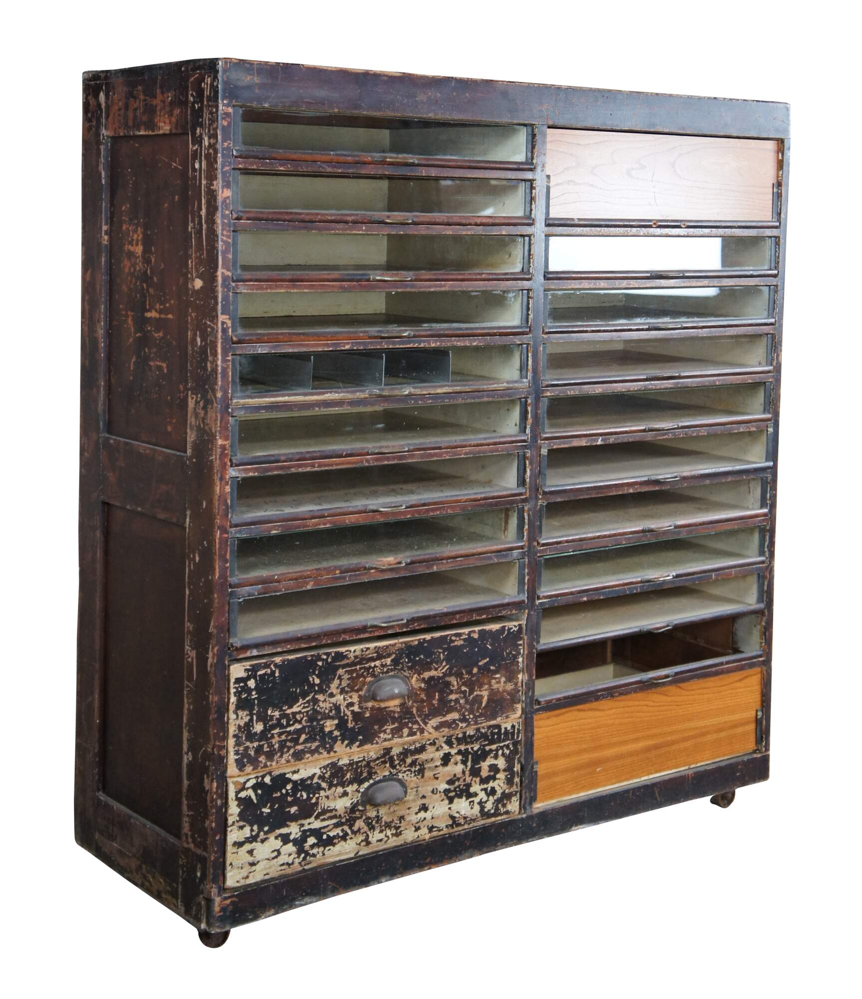 Antique apothecary cabinet, circa first half 20th century. Features a unique file system with clear plexi windows along the front. Includes 2 lower drawers along the left.