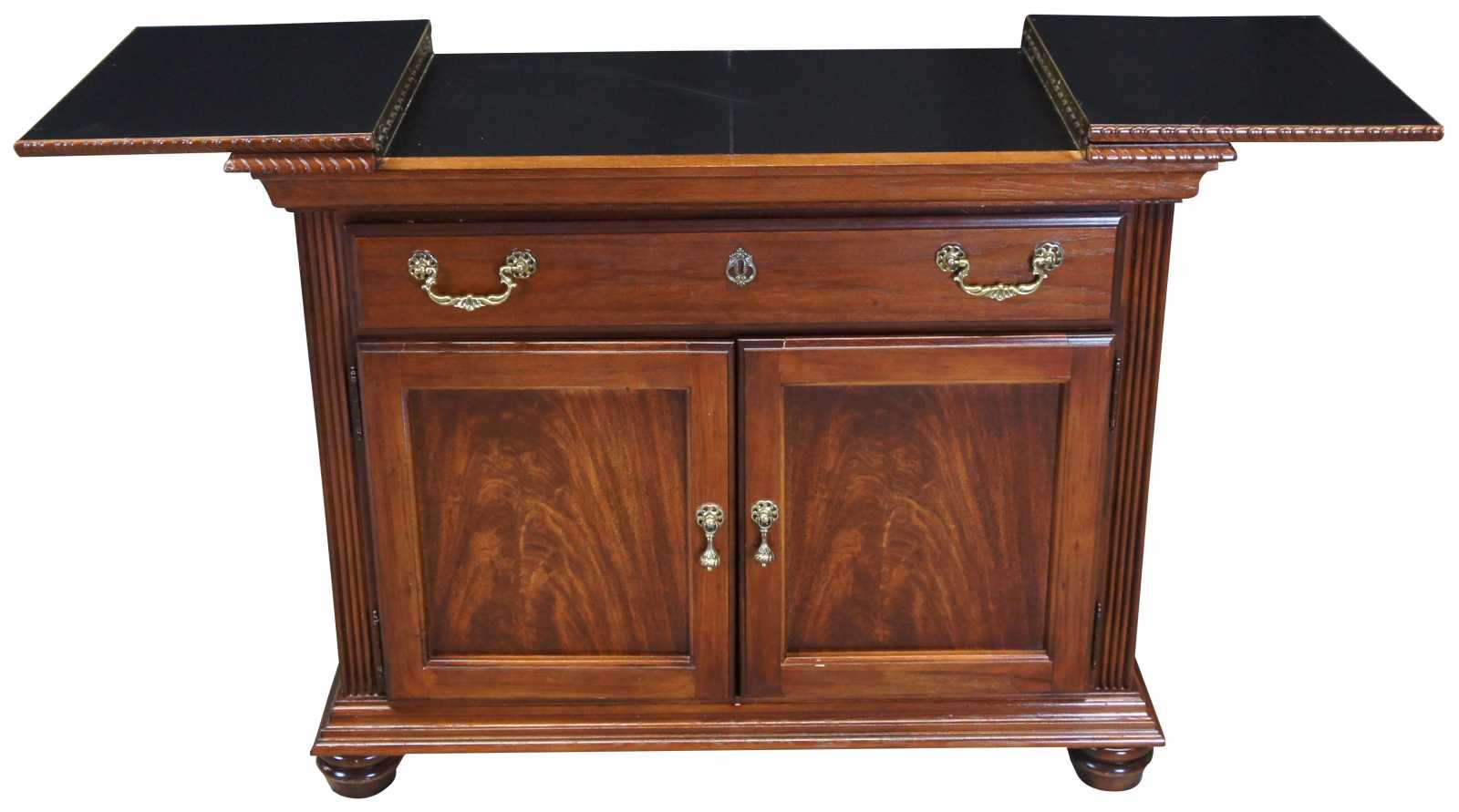 Chippendale style server by Broyhill Furniture, 512-5265-13. Made from mahogany with flame mahogany cabinet doors. Features a flip top with laminant surface, gadrooning, reeded siding and bun feet. Opens to a lower shelf. Upper drawer is felt lined.