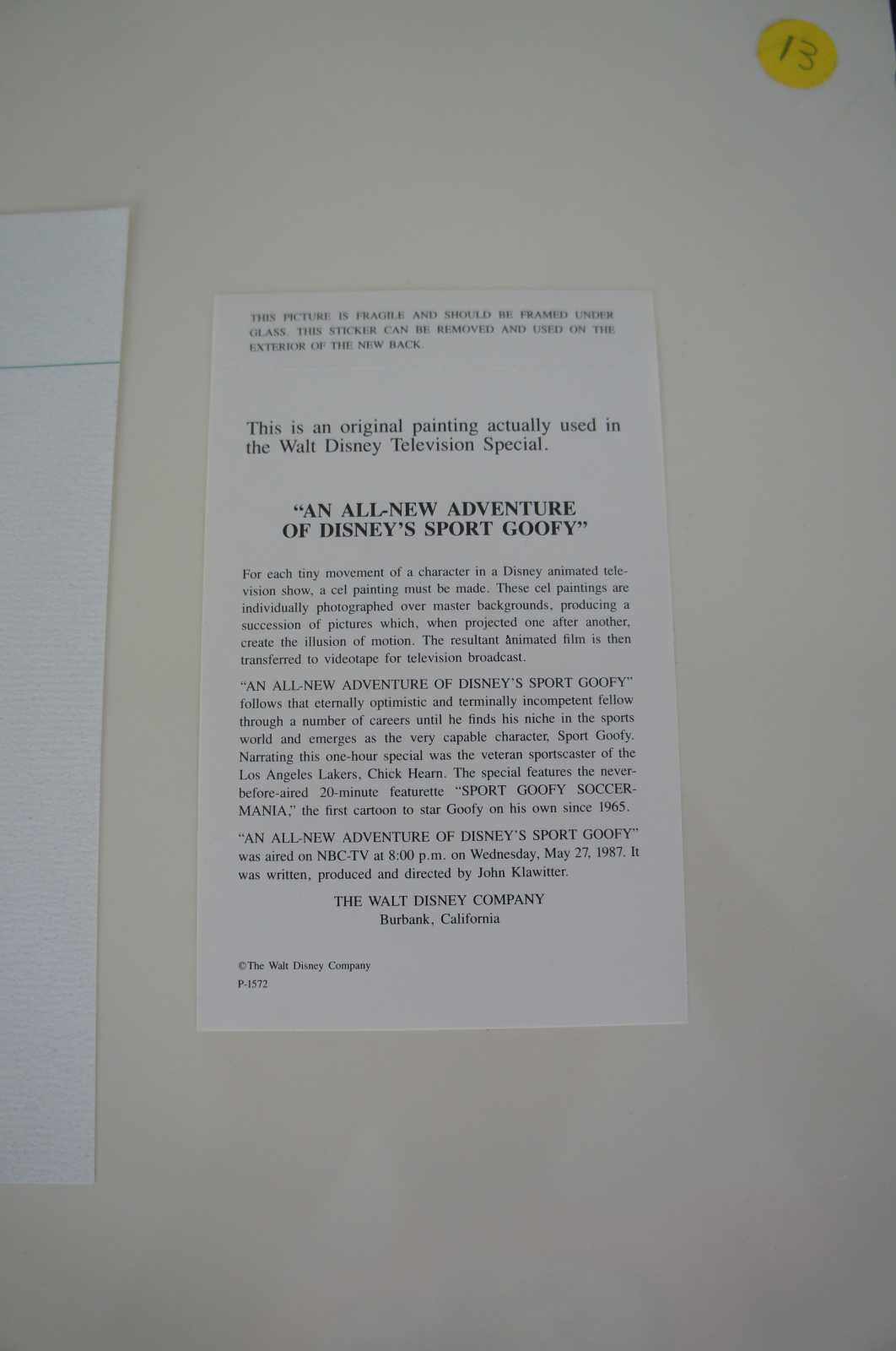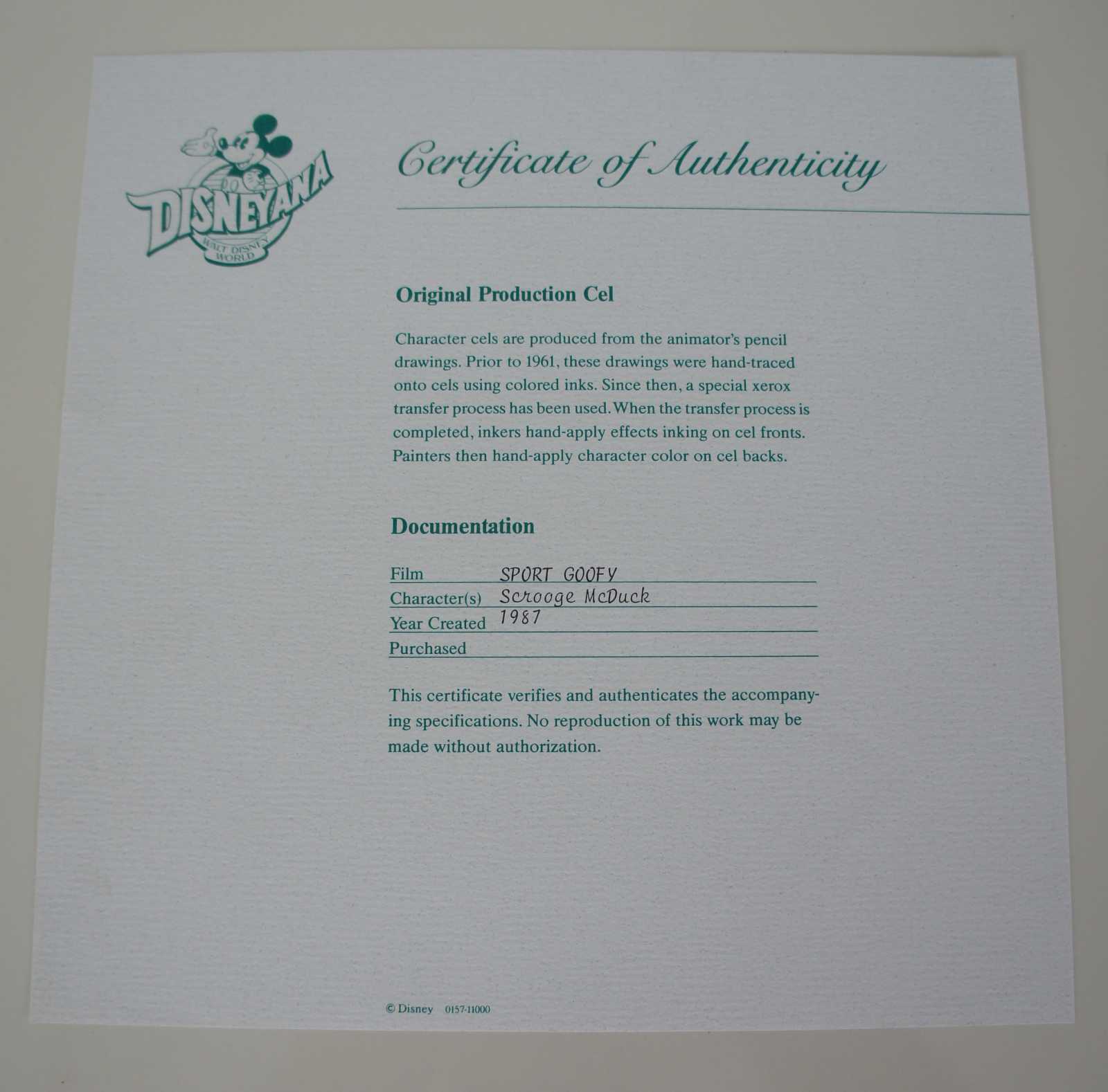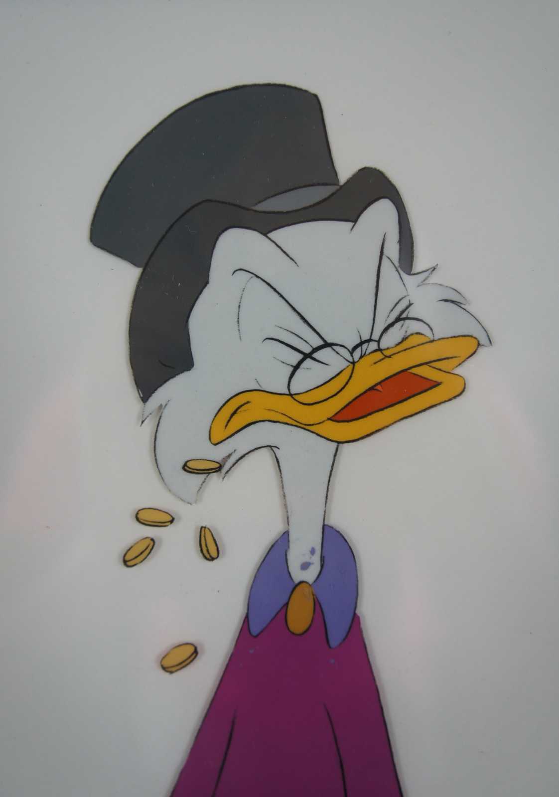 Walt Disney 1987 original production animation cel from the film Sport Goofy featuring Scrooge McDuck of DuckTales fame being hit in the face with a handful of coins. Includes certificate of authenticity.