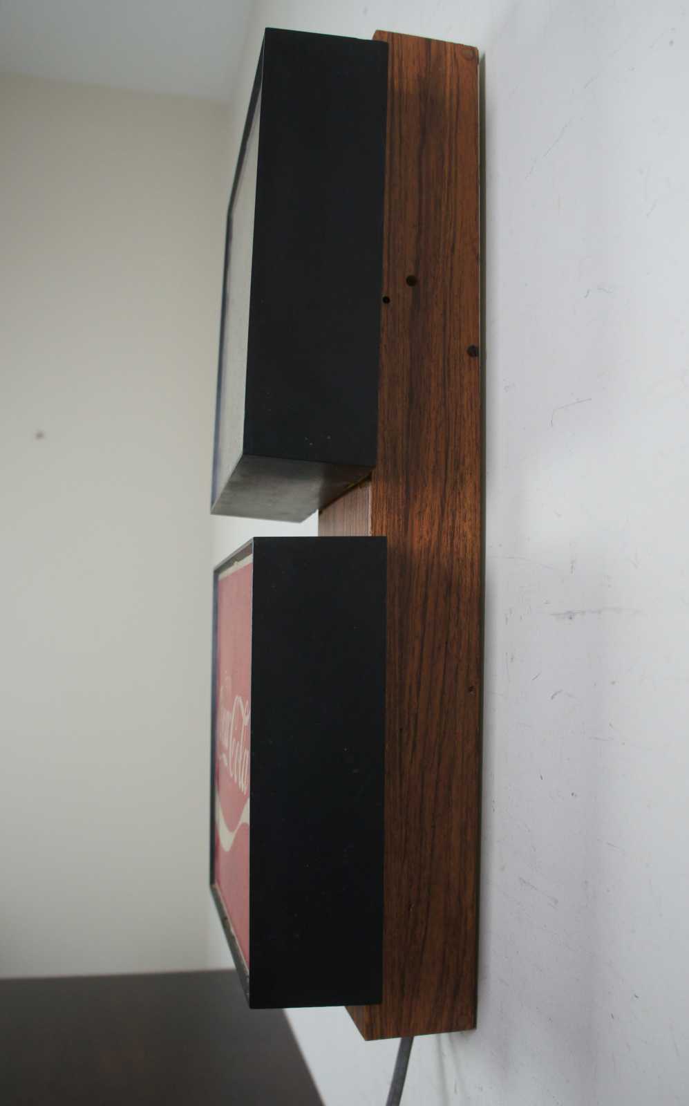 Vintage 1970’s Coca-Cola wall clock with light up clock face and brand logo mounted on a wood block; manufactured by Ingress-Plastene Division, Model G017.