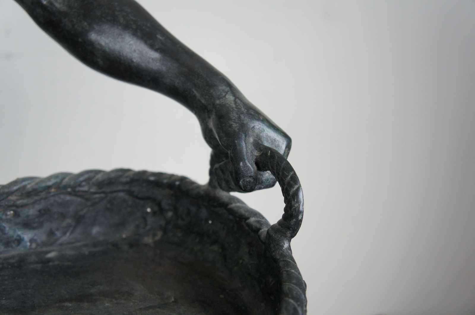 Maitland Smith figural bronze statue, late 20th Century. Features a toned African man in ancient greek inspired lower garment holding a woven basket. Marked along underside. Perfect for use as dumbwaiter, stand or to hold your curiosities.