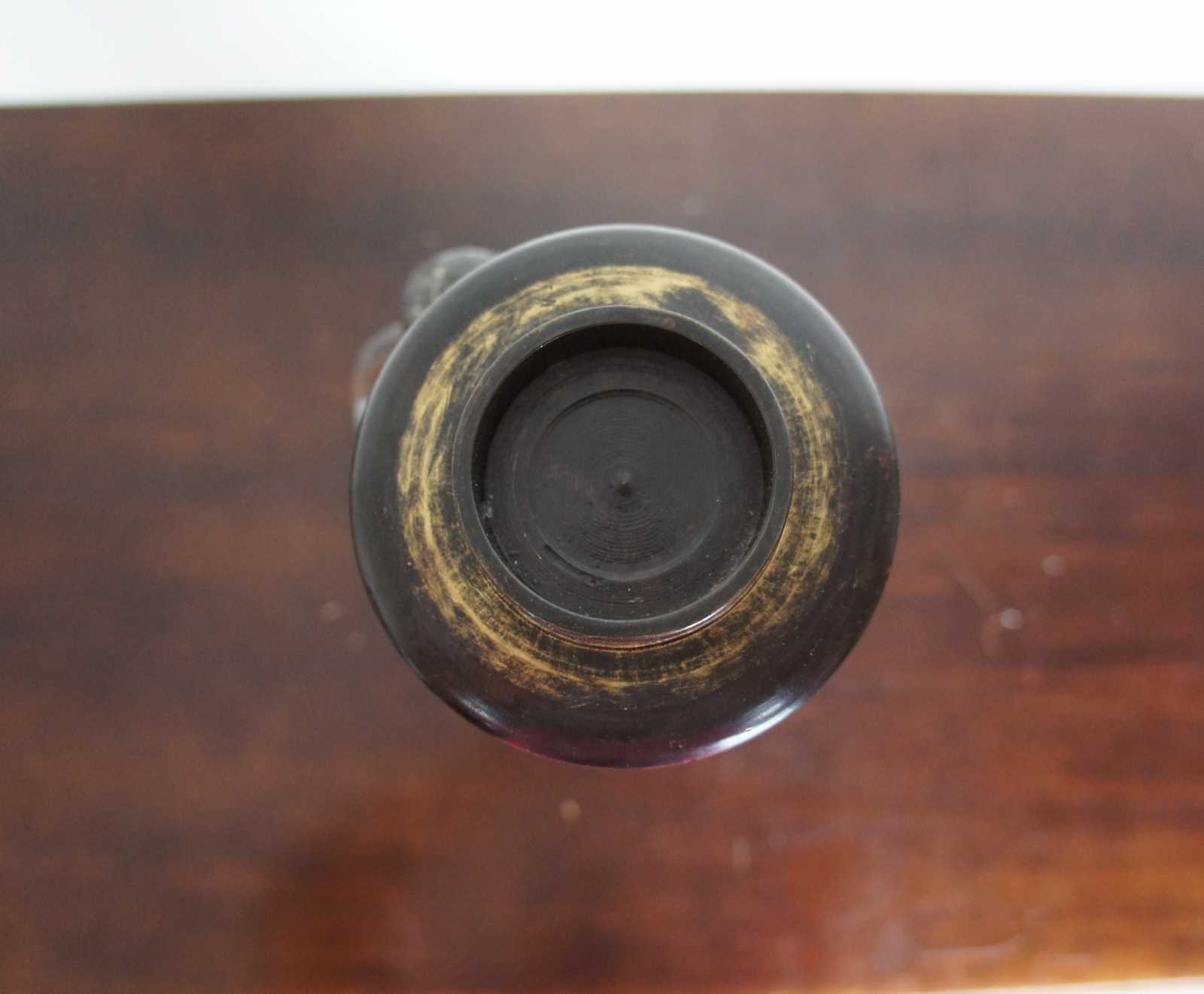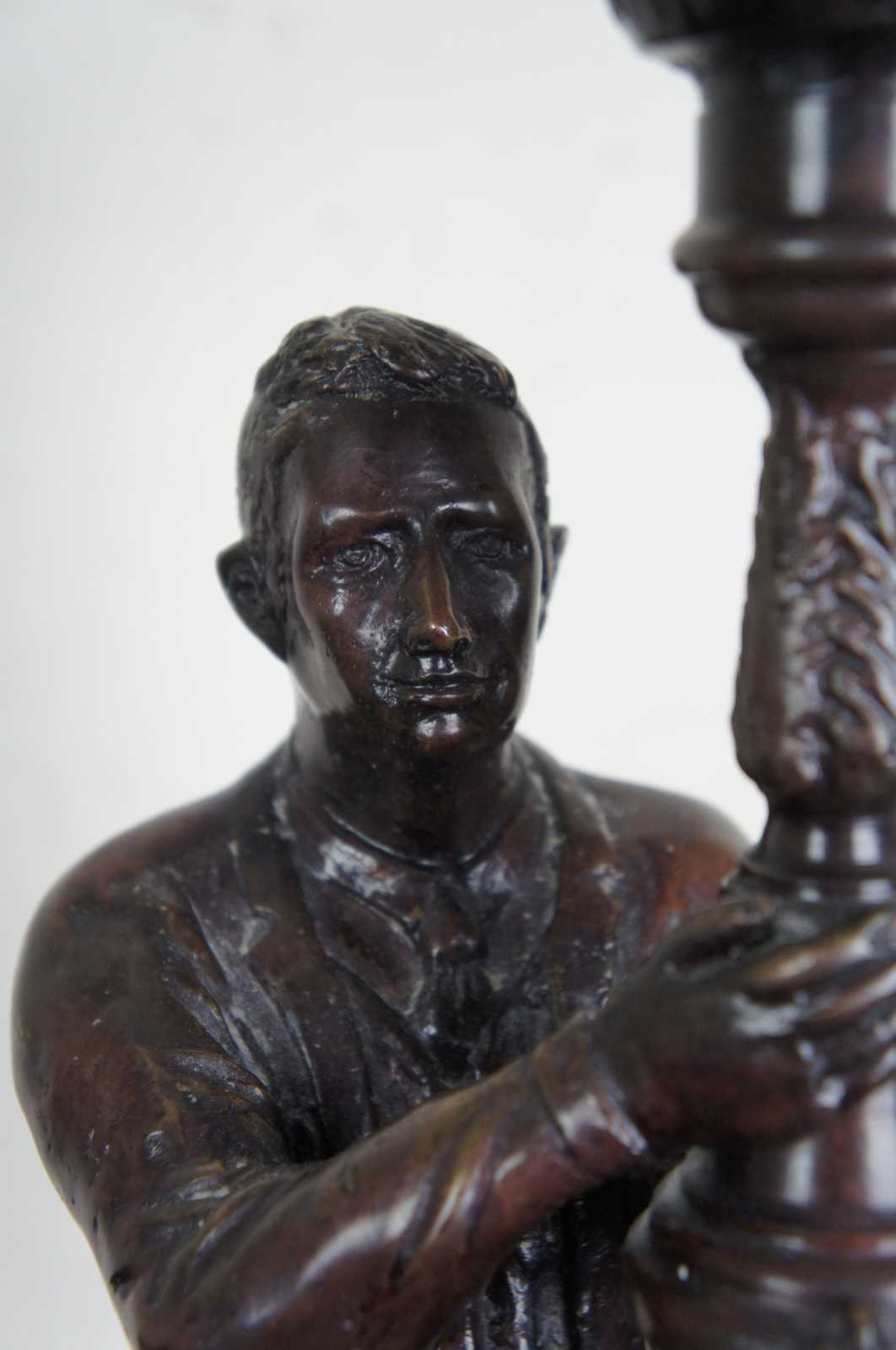 Maitland Smith sculptural bronze candlestick, late 20th Century. Features a colonial man kneeling with torch, 18". Marked along underside.