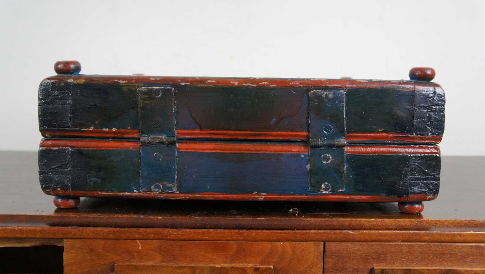 Primitive 19th Century antique game board featuring chess, checkers, backgammon and nine man morris. The board is hand painted and detailed anno 1817, footed on both sides with bun feet and opens to backgammon playing surface.