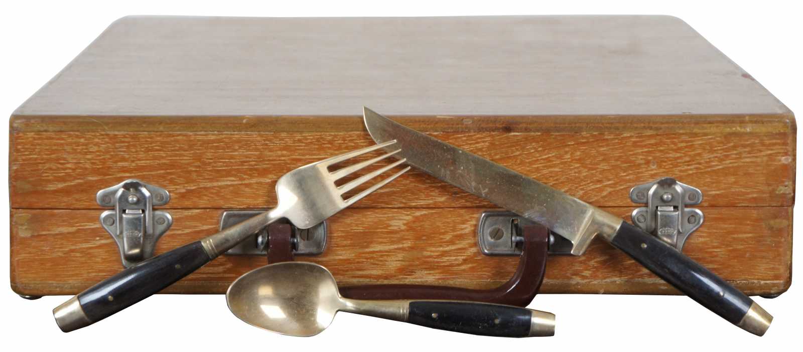 Vintage mid century 30 piece set of bronzeware cutlery and serving pieces with dark rosewood handles and velvet lined storage case.