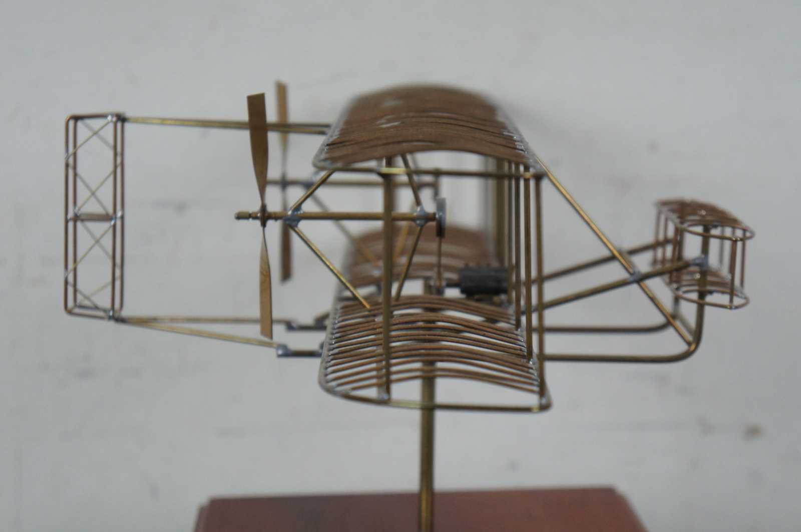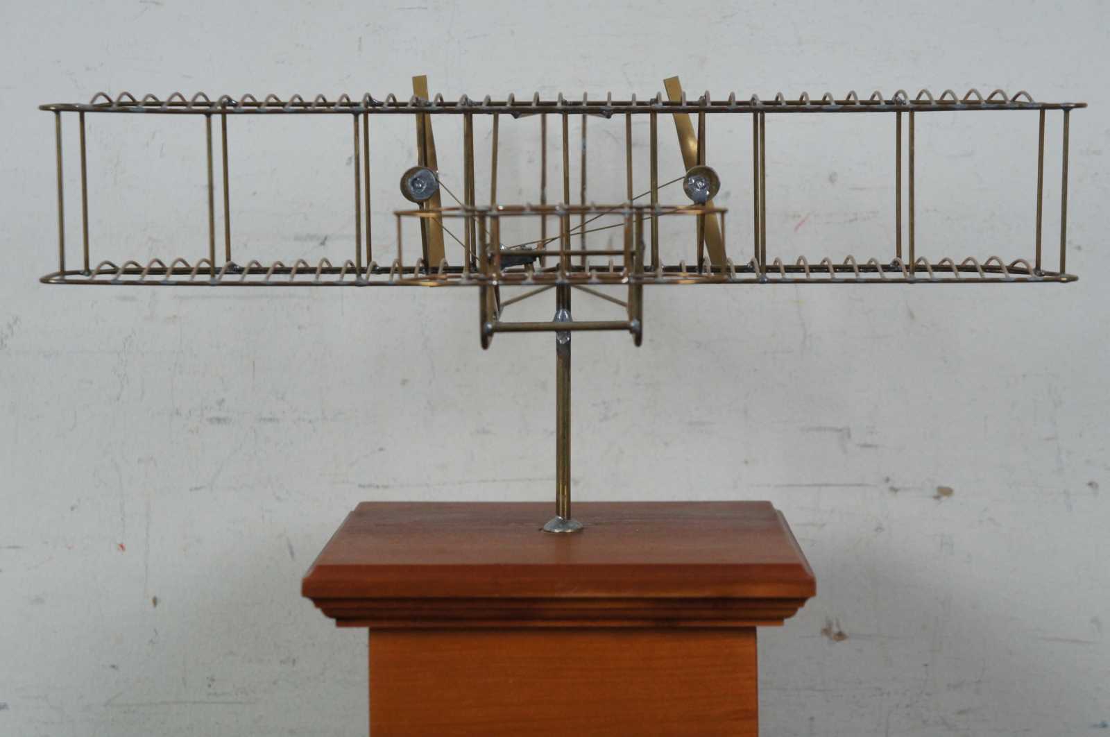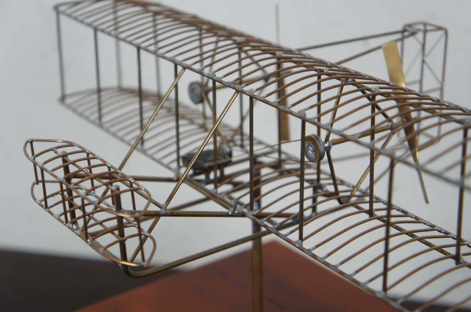 Vintage desktop sculpture in brass wire of the Wright Flyer airplane suspended above a wood base. This plane was originally made famous by the Wright Brothers of Dayton Ohio, which made first flight in Kitty Hawk North Carolina.