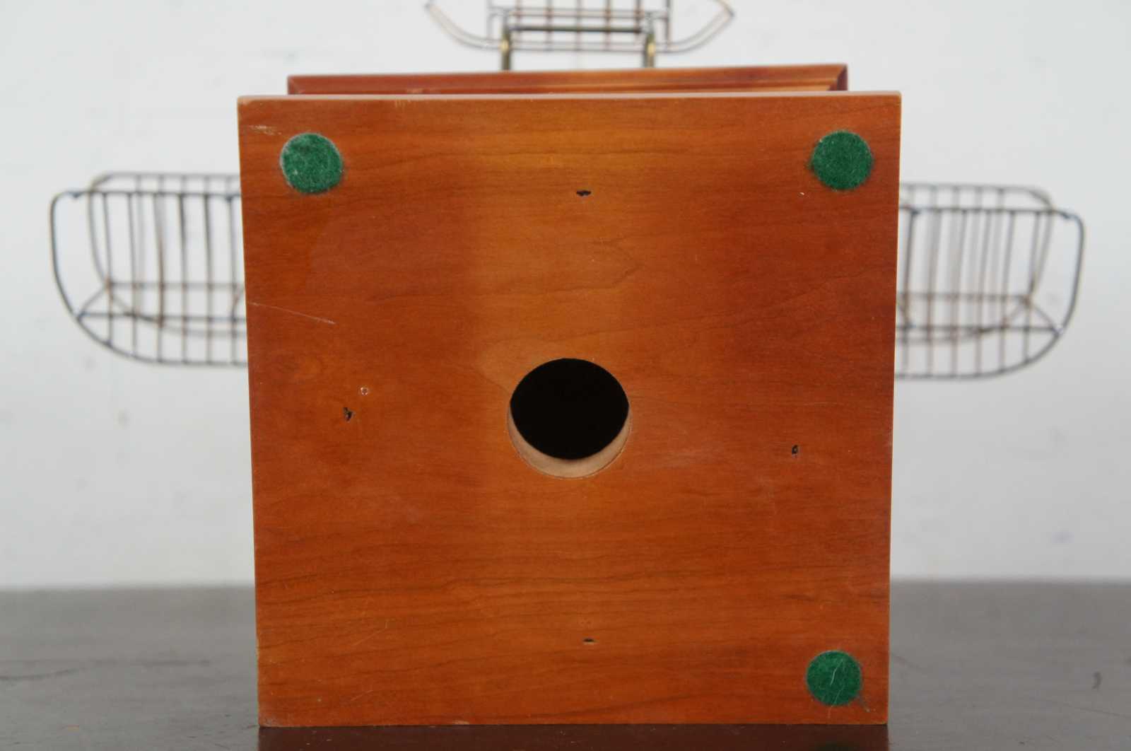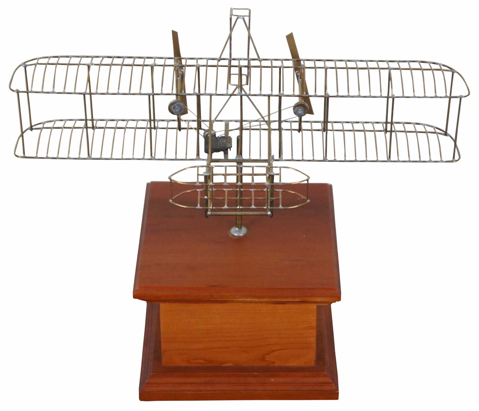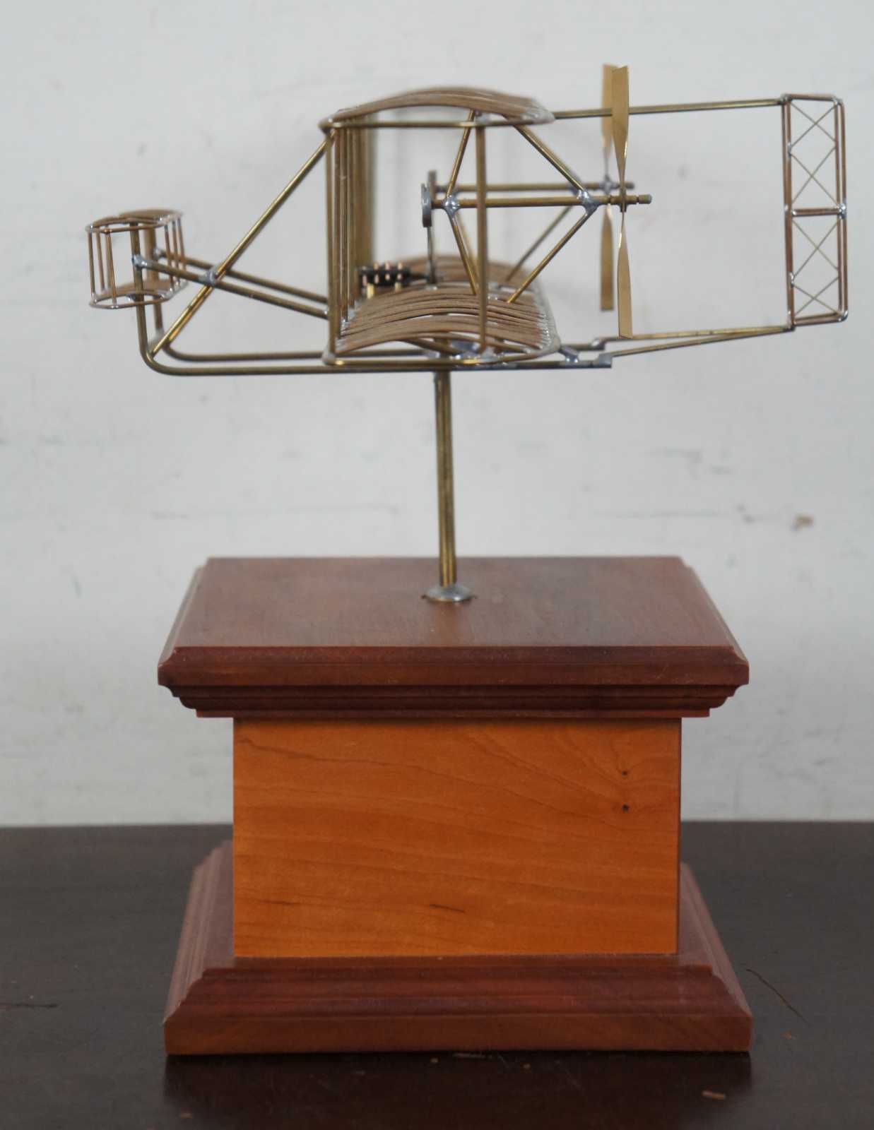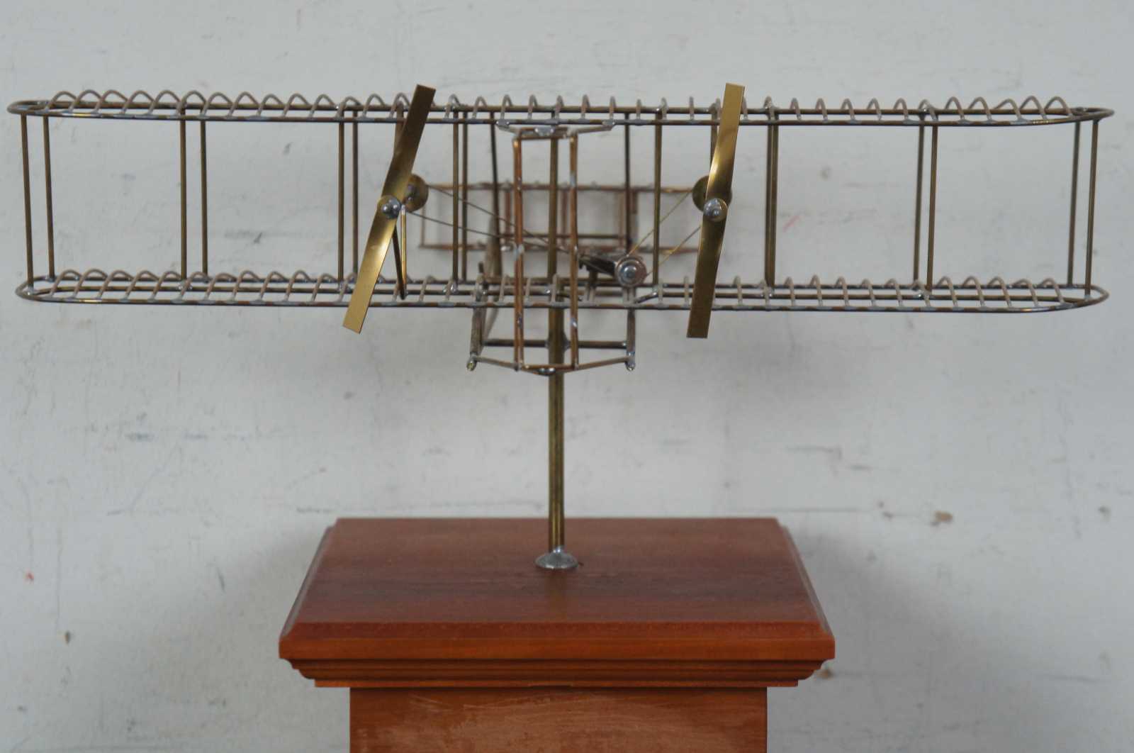 Vintage desktop sculpture in brass wire of the Wright Flyer airplane suspended above a wood base. This plane was originally made famous by the Wright Brothers of Dayton Ohio, which made first flight in Kitty Hawk North Carolina.
