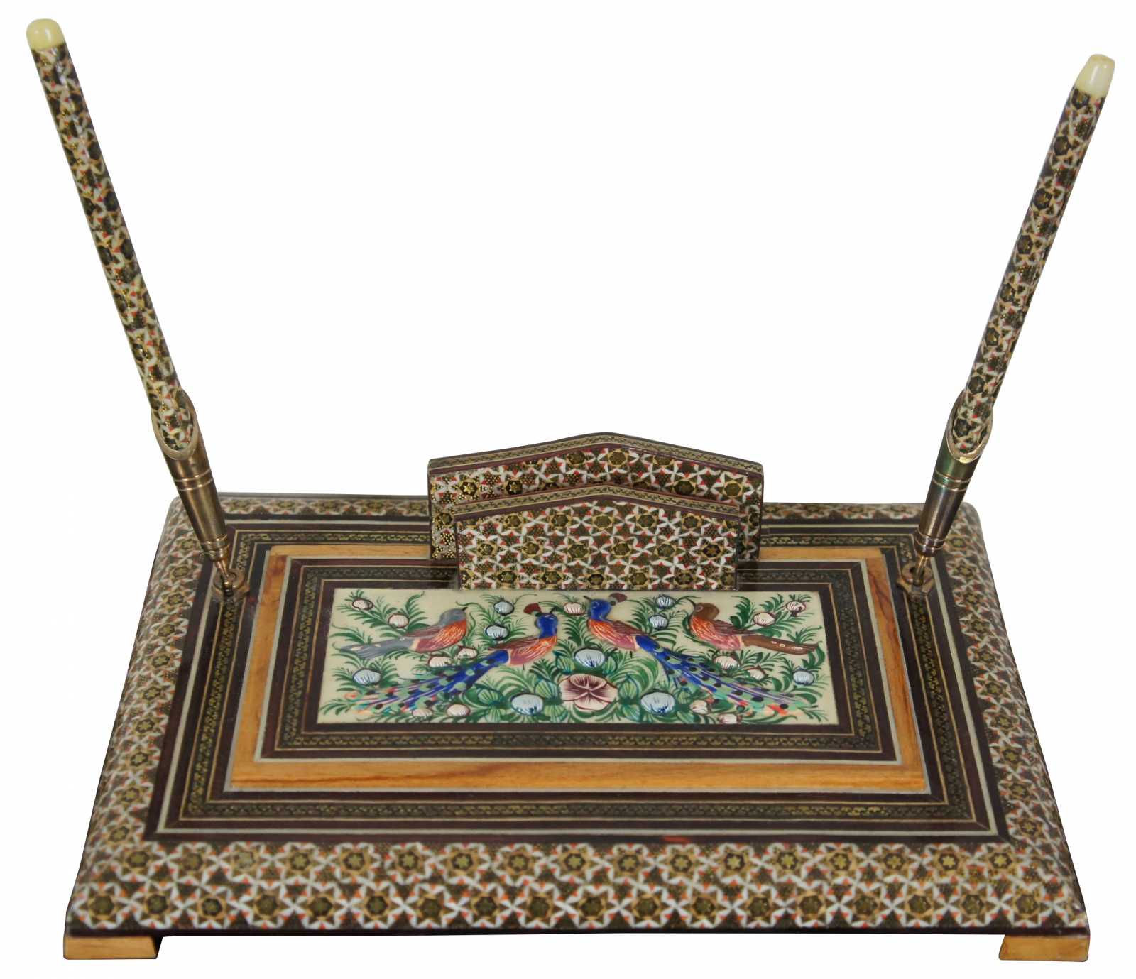 Vintage painted lacquer desk set with an intricate micro mosaic style pattern and a central scene of birds and peacocks with flowers and stars. Base includes a standing note holder and two brass pen holders with refillable matching pens (fits a standard ball point insert, pictured but not included).