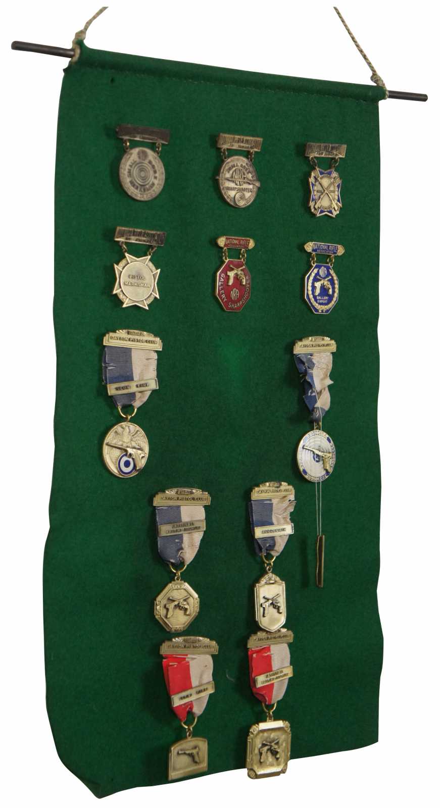Set of 12 National Rifle Association of America and Dayton Pistol Club marksman and sharpshooting medals from the 1940’s displayed on a simple green baize banner.