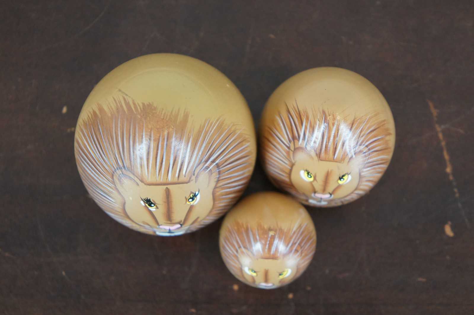 Vintage three piece hand painted folk art egg shaped Russian Matryoshka lion nesting dolls. Features the King of the Jungle, with his lioness and cub.