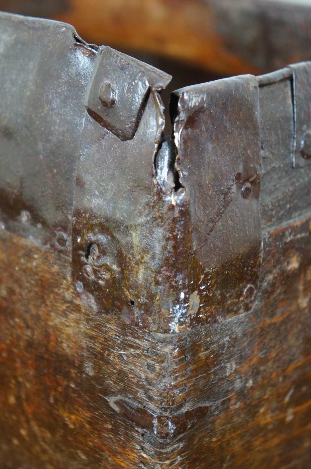 Antique wooden grain or rice measure / harvesting bucket with handle across the middle and primitive iron accents.
