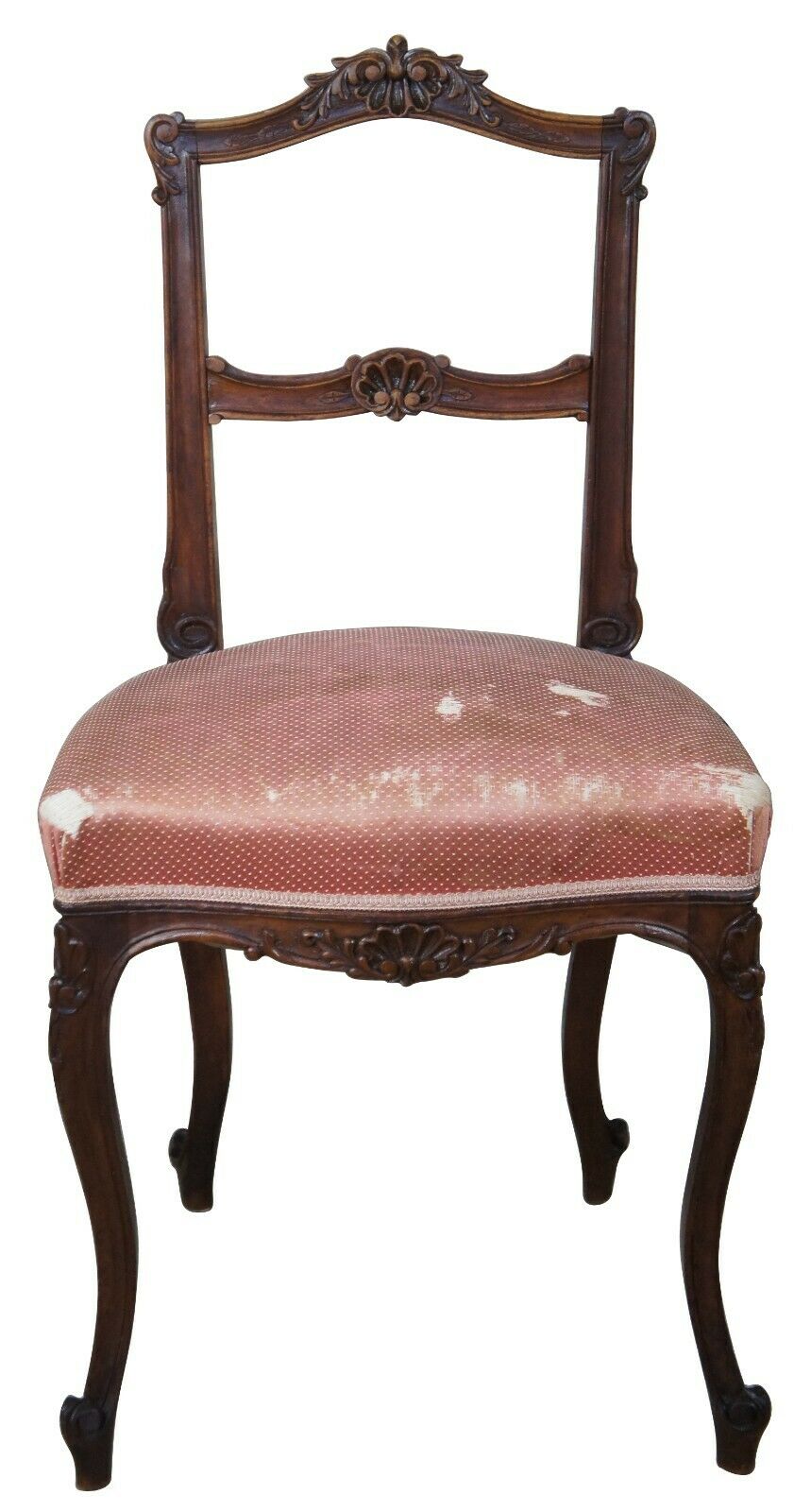 Antique French Provincial side chair. Made from walnut with ornate shell and cartouche carvings. Features a pink upholstery over cabriole legs ans scrolled deet.