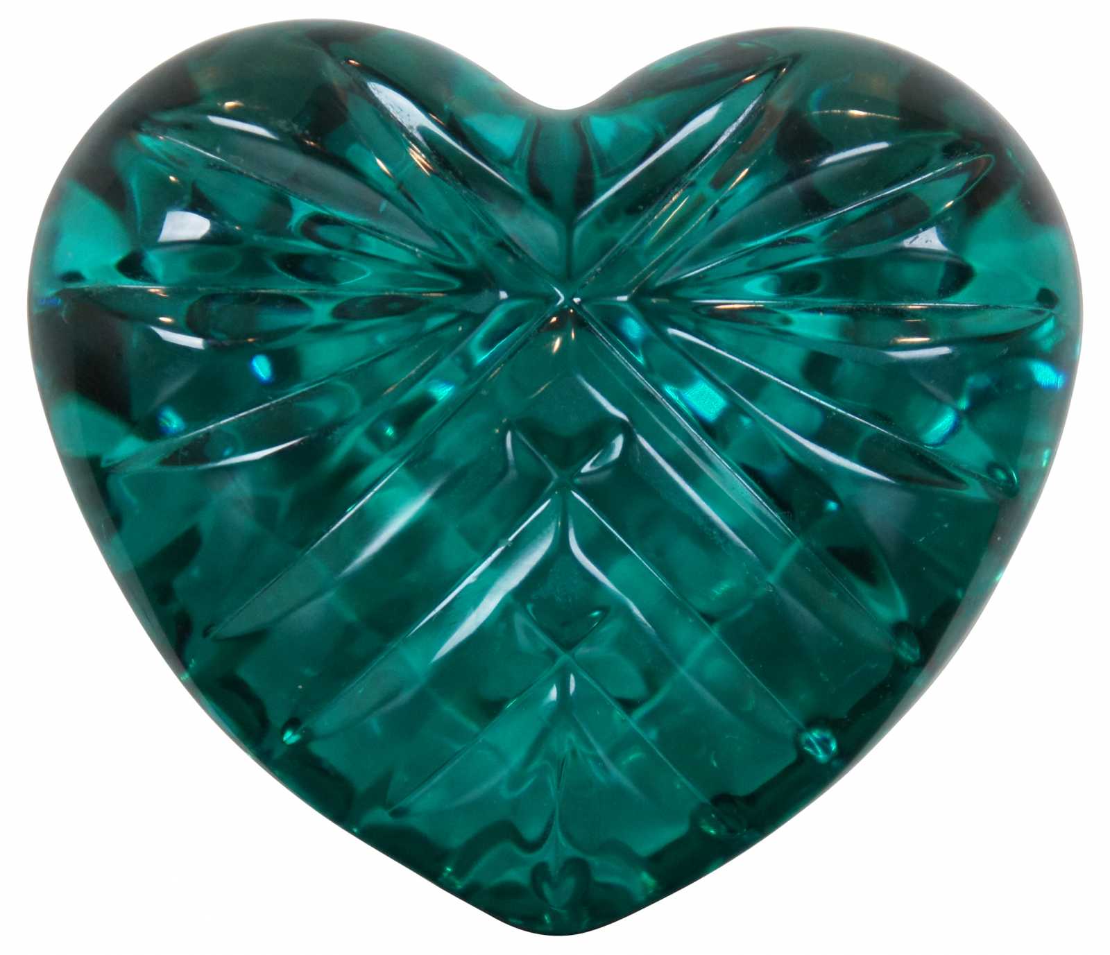 Waterford teal / clear emerald green cut crystal paperweight or hand cooler in the shape of a faceted heart. Officially titled the Wedding Heir. Heart Hand Cooler, made in Ireland, 3347834800. Hard to find in green.
