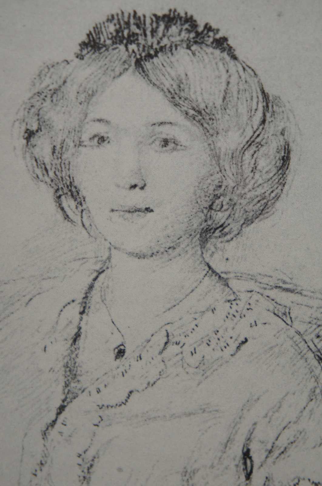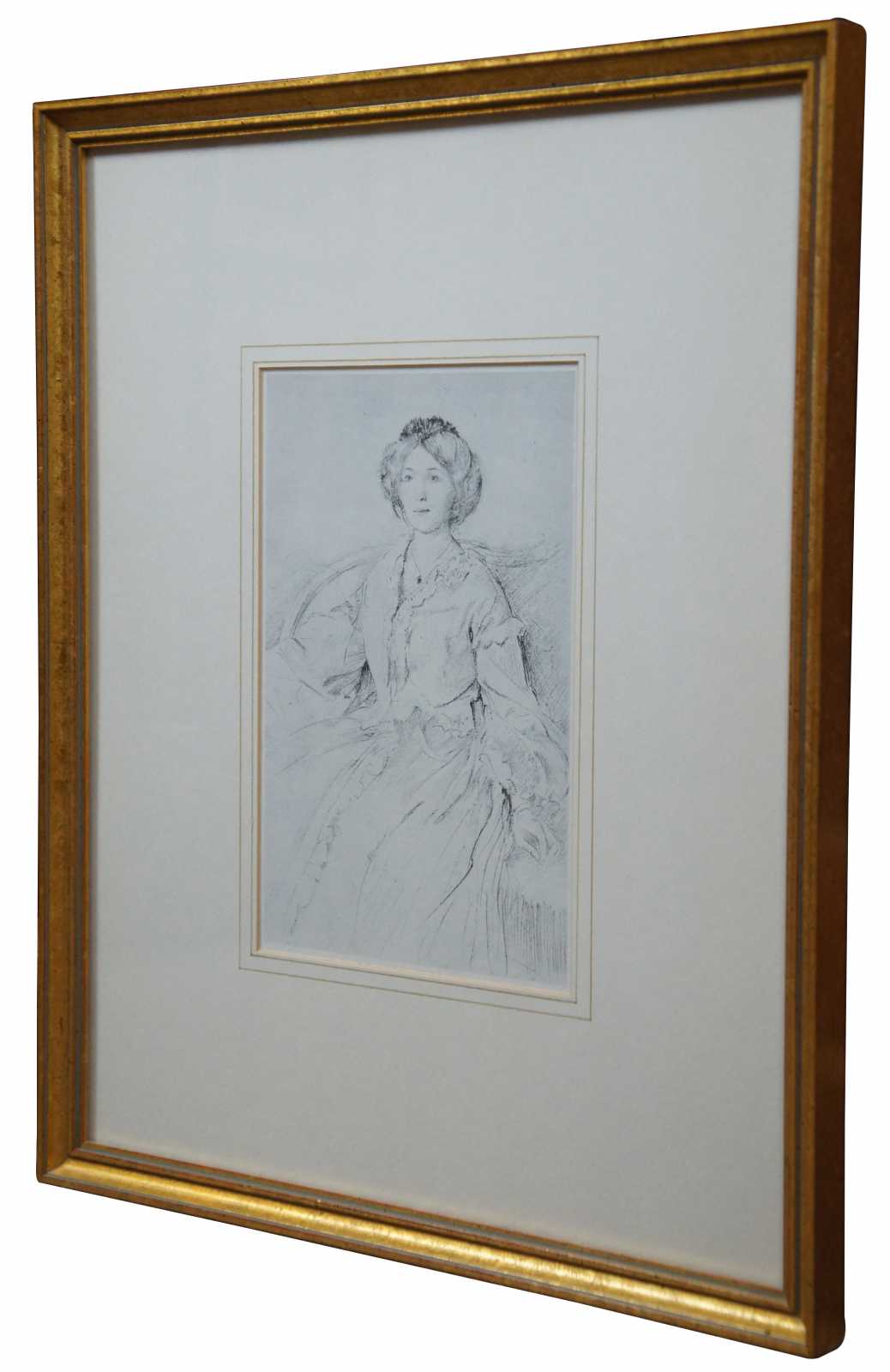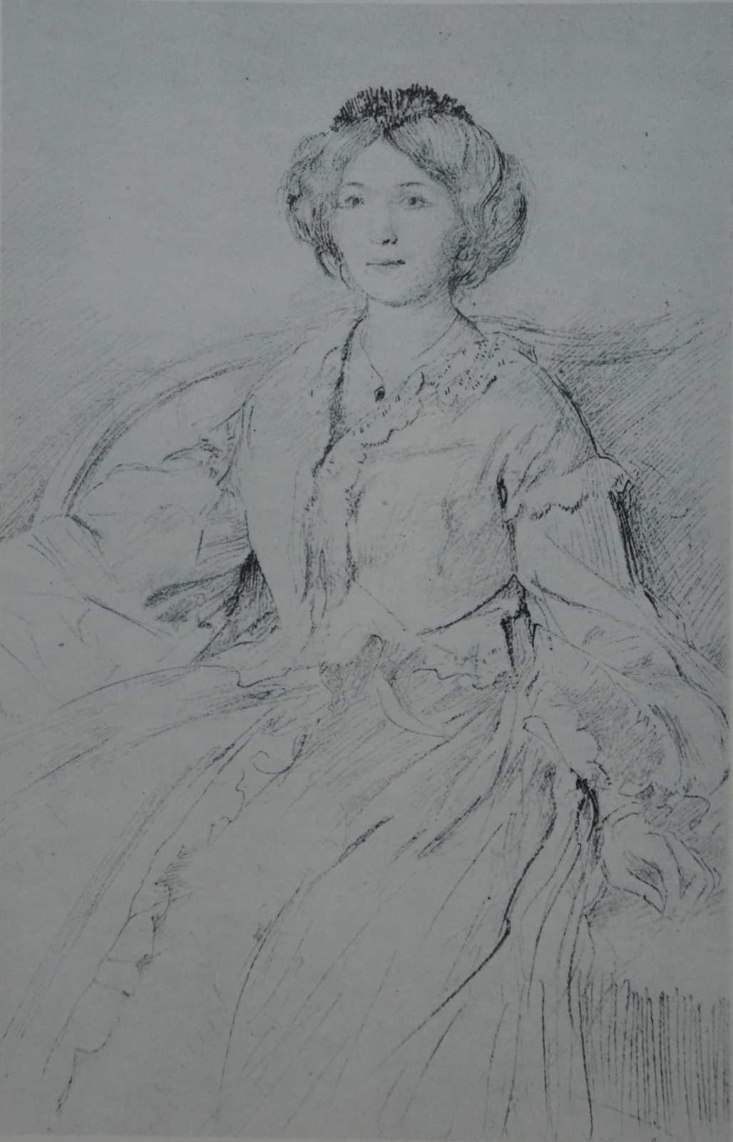 Vintage lithograph print of a sketch by Edgar Degas of a seated Victorian woman in a lace trimmed gown on a camel back couch. Edgar Degas was born on July 10, 1834 in Paris and died there on September 27, 1917. He was the only 19th century French painter to have direct family ties with America. His mother, the former Marie-Celestine Musson, was born in New Orleans and his brothers Rene and Achille worked for a time in New Orleans with their uncle, Michel Musson. Edgar was the oldest of five children; they were raised in the comfort of a well-to-do family. His father was a banker (The original spelling of their name was de Gas). Young Degas had the usual scholastic training but he was exposed to art early by his father, who often took him to museums, etc. When he graduated from the Lycee Louis le Grand in 1852, winning first prize in drawing, he already had a deep interest in art. A friend of his father's took him to the studio of Ingres, who was seventy-five at the time. The meeting was a high point in the life of young Degas. He entered the Ecole des Beaux-Arts in 1855; from 1856 through 1857 he made a study of Quattrocento painting while in Rome, Naples and Florence. His early work comprised history paintings and primarily portraits, influenced by Ingres. In 1864 he executed several portraits of his friend Manet. Degas soon lost interest in historical subjects and his avid curiosity swiftly led him to explore the world of theatre and the dance. These, together with scenes of the racecourse, were to become his favorite subjects. Degas accompanied his brother to the United States in 1872 and returned the following year. The artist suddenly acquired an intense feeling for the modern, a taste for unconventional composition, and for themes, forms and rhythms taken from everyday life. He took an active role in the first Impressionist show of 1874 and several others in the following years, He also tried his hand at engraving, as did Mary Cassatt and Pissaro. In 1881 he showed his first sculpture, a small wax figure of a dancer, for he was now beginning to compensate for his weakening sight by his sense of touch. Actually, that thesis, on second thought, is nonsense. easily disproved by the chronology. What is true is that Degas seems to have had serious eye problems as early as in his thirties, including a hypersensitivity to light that compelled him to wear dark glasses. His vision later deteriorated (he apparently lost the sight in one eye and was understandably frightened of becoming blind), but he continued to work until his late seventies. The special talent of Edgar Degas lay in his ability to find unfamiliar beauty in the passing scene. He isolated, with a sharp eye, the significant gestures and movements of people at work, and presented them with dramatic force. What we now regard as Degas' unique sense of composition - the subtle placement of his figures within the frame of his canvas stems from several sources: the drawings of Giovanni Bellini which he had seen and studied in Italy, the Japanese woodcuts which he enjoyed and collected, and the new art of photography. A curious contradiction existed in Degas between the penetrating warmth of his observation, as revealed in his painting, and the ill-tempered disposition by which he made enemies as naturally as others make friends. He never married, nor had a mistress, but he did have a circle of female friends and confidants. Stubborn, aristocratic, solitary and bitter; he was feared for his biting sarcasm. He was a famous mimic with a rapier wit, terrorizing and fascinating the crowd at the Cafe Guerbois with lethal insight. To Monet he commented "I remained only a second at your exhibition. Your pictures gave me vertigo." He seemed to use the protective armor of suspicion and hostility in his social contacts to guard against any possible interference with his work, which he pursued during his long life with tireless devotion. Though he was associated for a short period with the Impressionist painters, his own views were so inflexible that he found it impossible to follow anyone. Edgar Degas died in 1917.