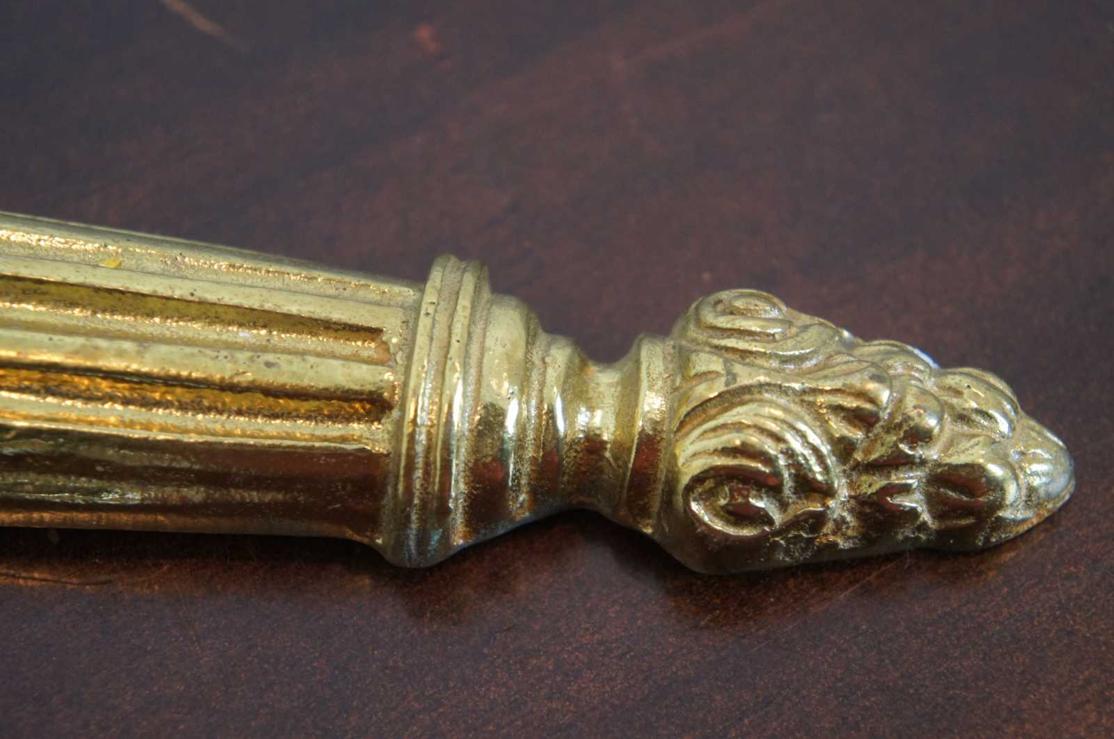 3 Available - Vintage Necoclassical style brass wall sconce. Features a torchiere at the center splitting off into three scrolled candelabra lights.