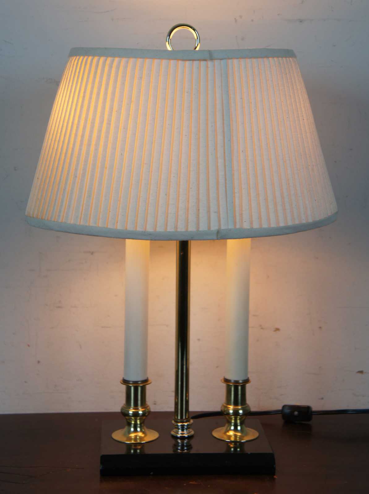 Vintage brass and black marble base table lamp with a two bulb socket in the center flanked by two faux candlesticks.