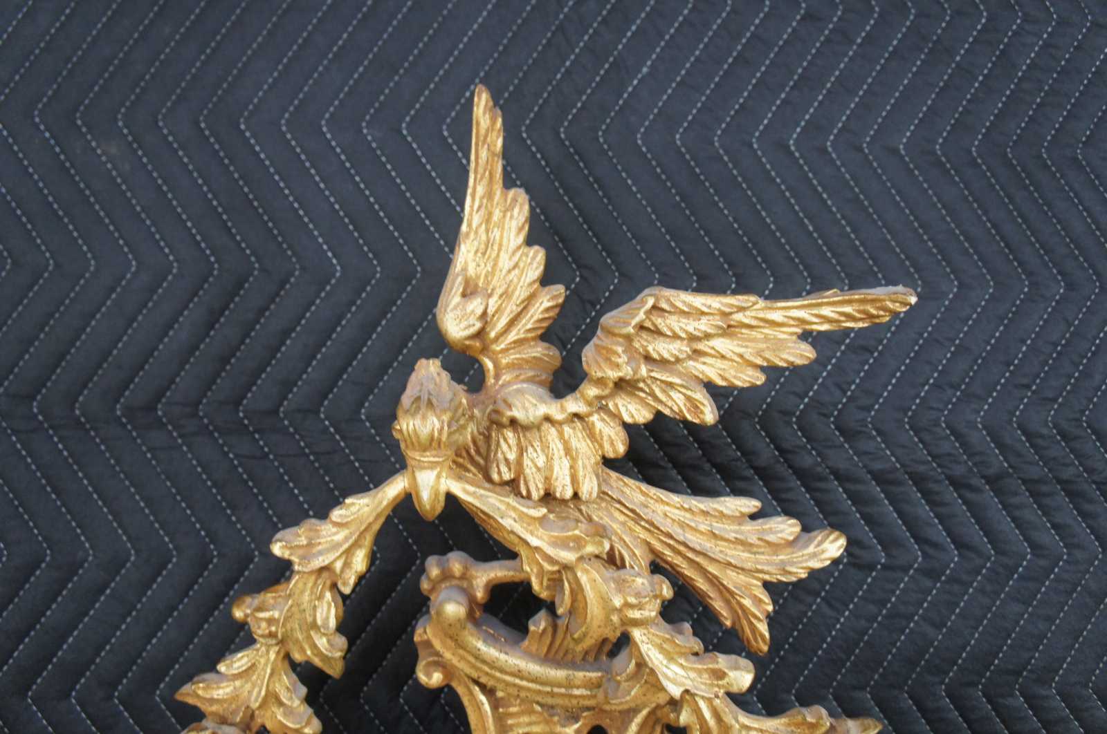 Vintage circa 1980s Baroque / Rococo / Chinese Chippendale inspired wall mirror by Carvers Guild. Made of wood, painted with antique gold leaf finish. Features ornate scalloped Italian design with florals, a wreath and dove / bird topper.