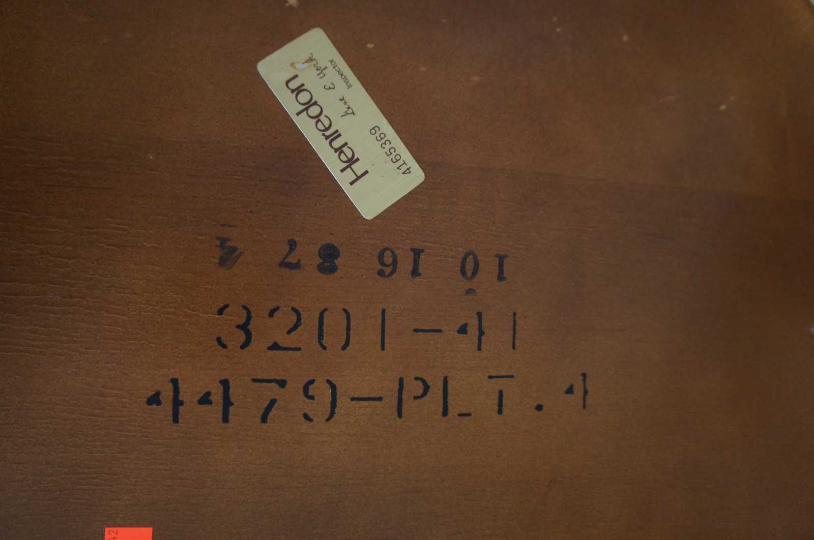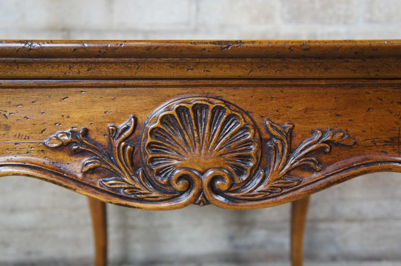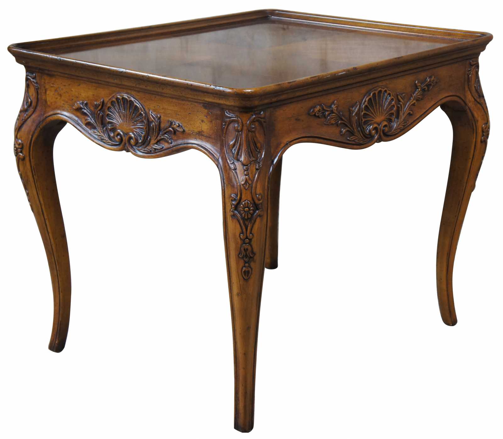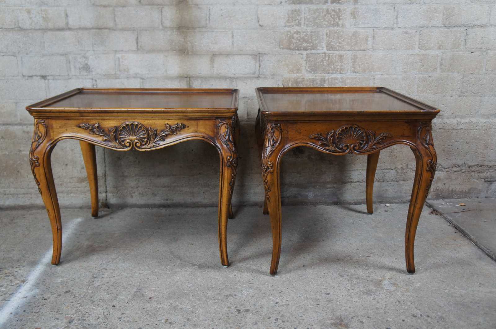 Pair of Henredon French Country side tables. Circa 1987. Made from Walnut with an inset bookmatched walnut top over a carved and scalloped arpon. The tables are supported by cabriole legs with shell and cartouche carvings. Style No 3201-41