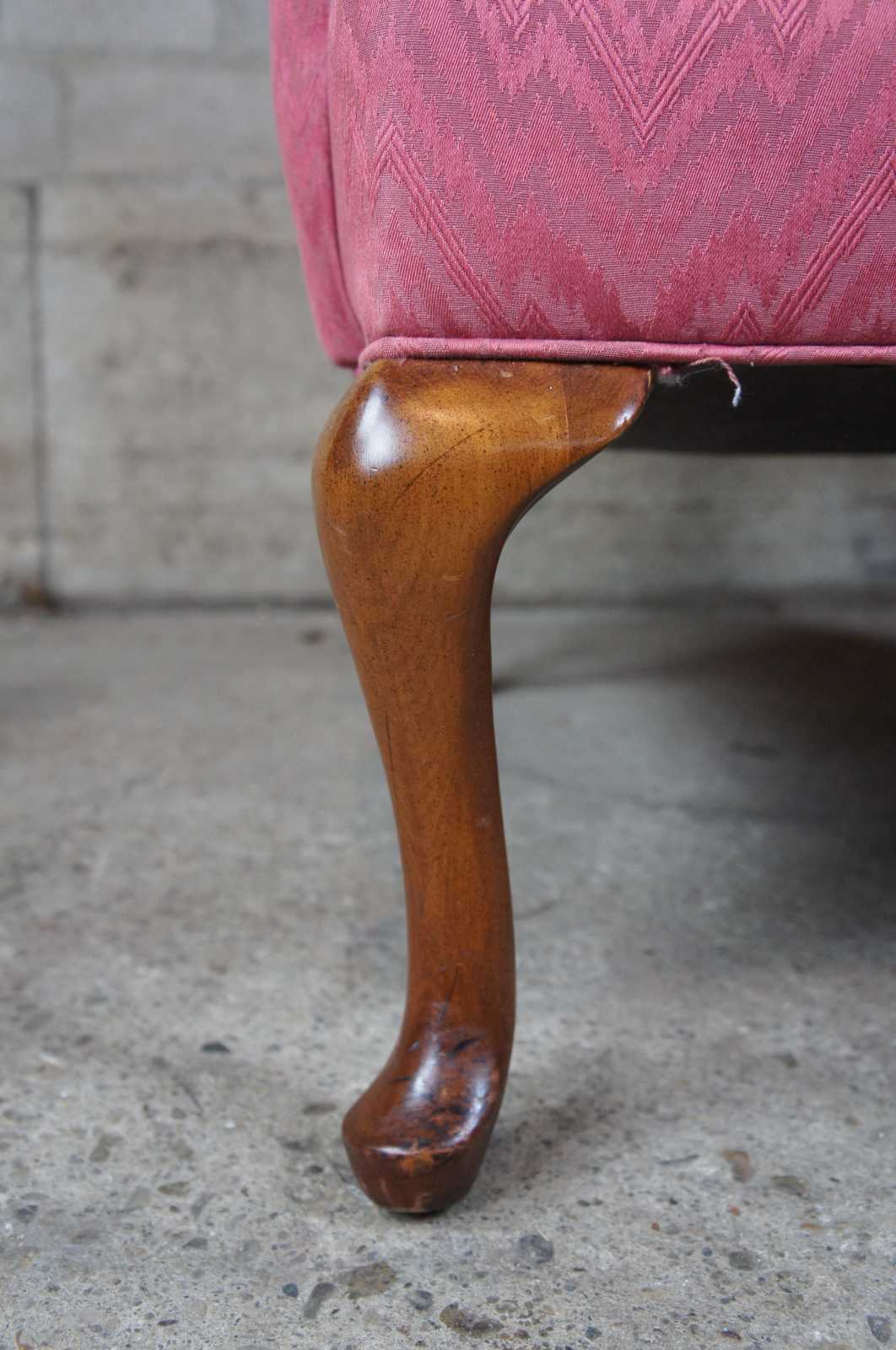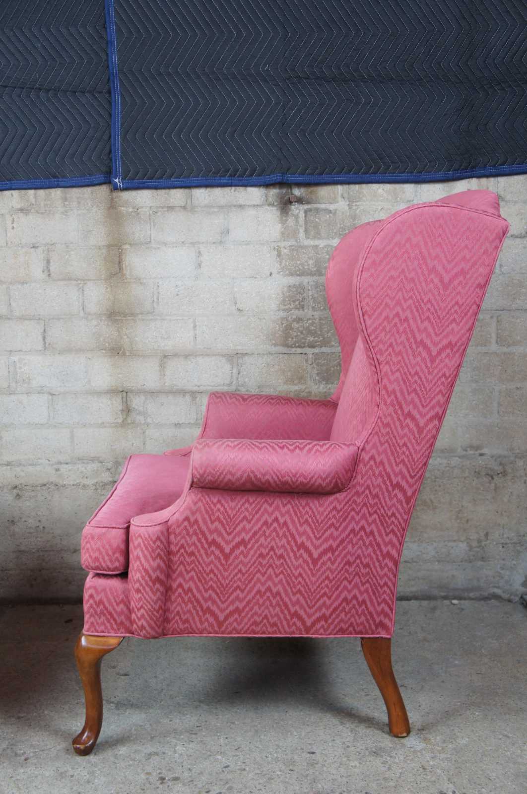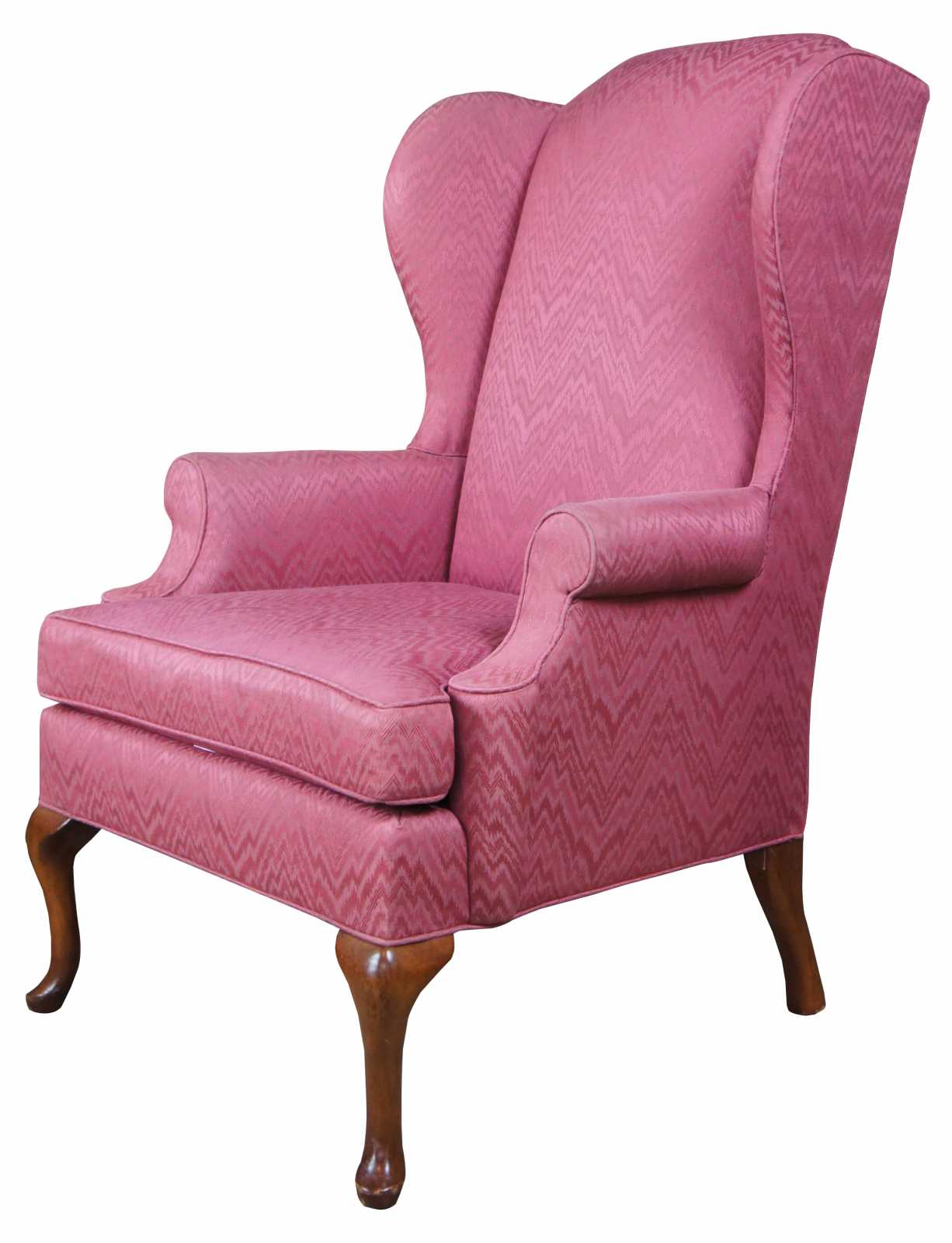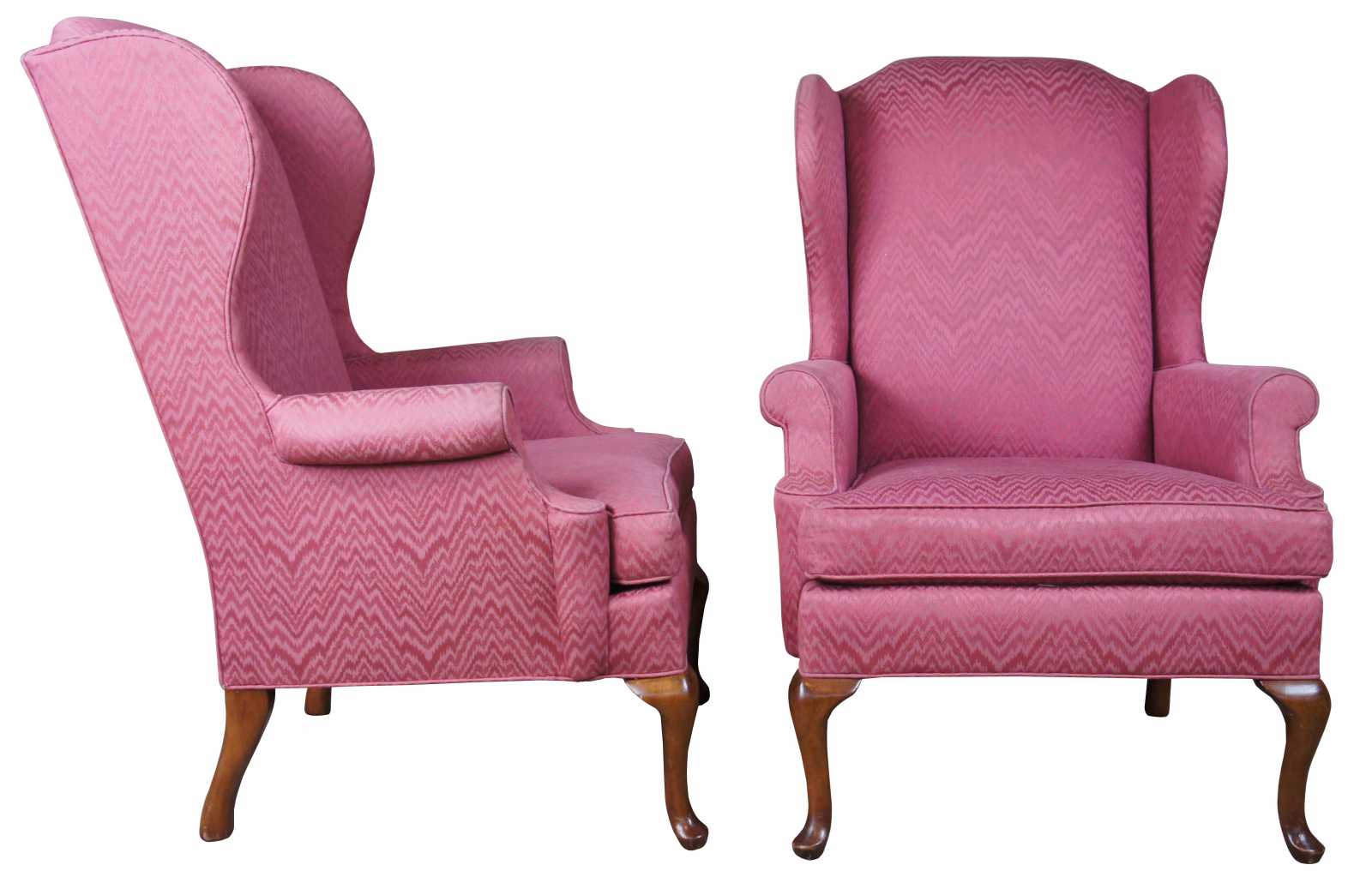 Circa 1980s Thomasville wingback chairs. Queen Anne style with a pink upholstery over carbriole legs.