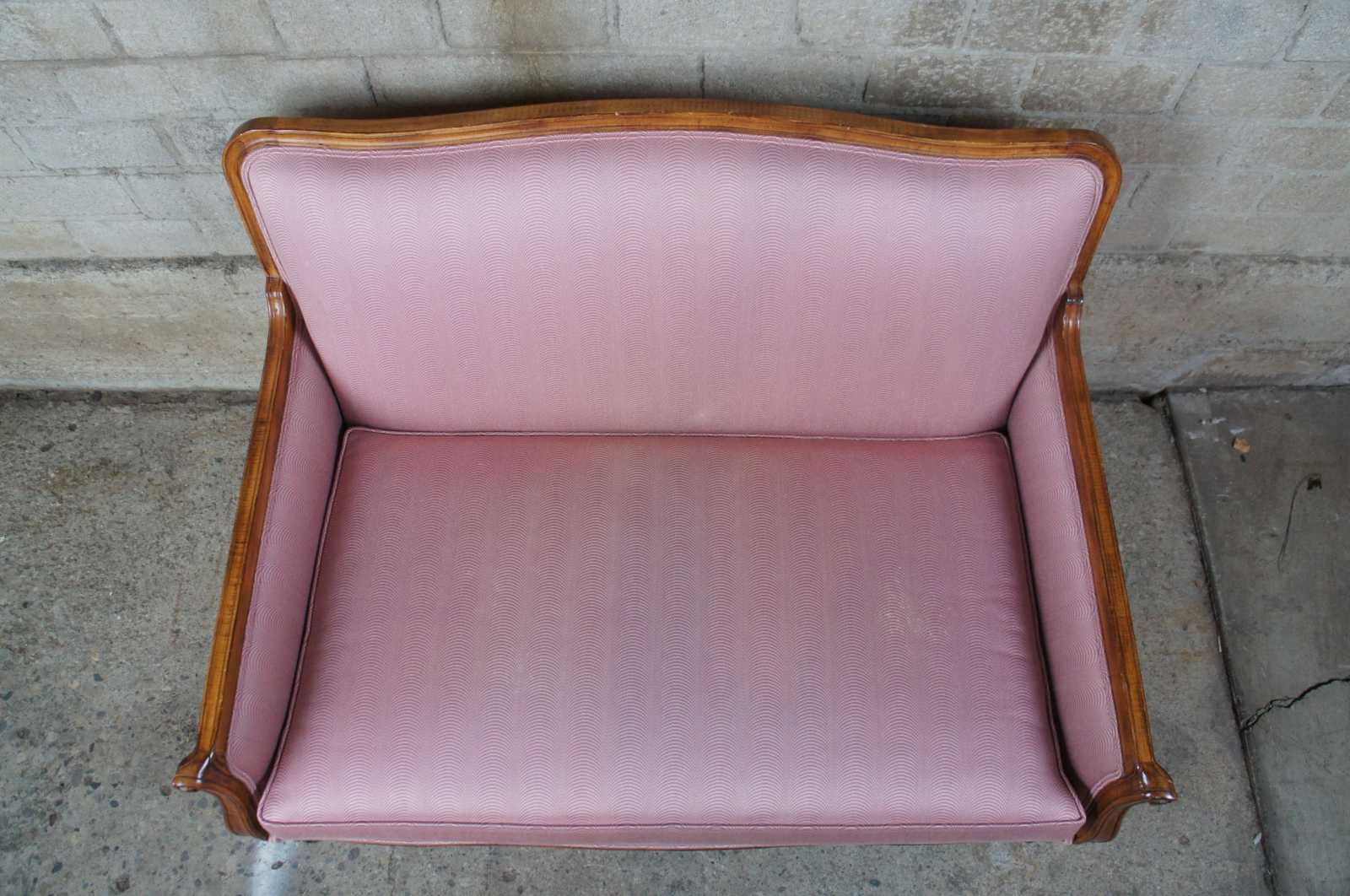 20th Century Country French camelback settee. Made from walnut scrolled and flared arms. Upholstered in pink.