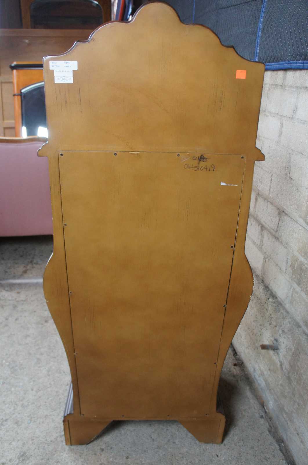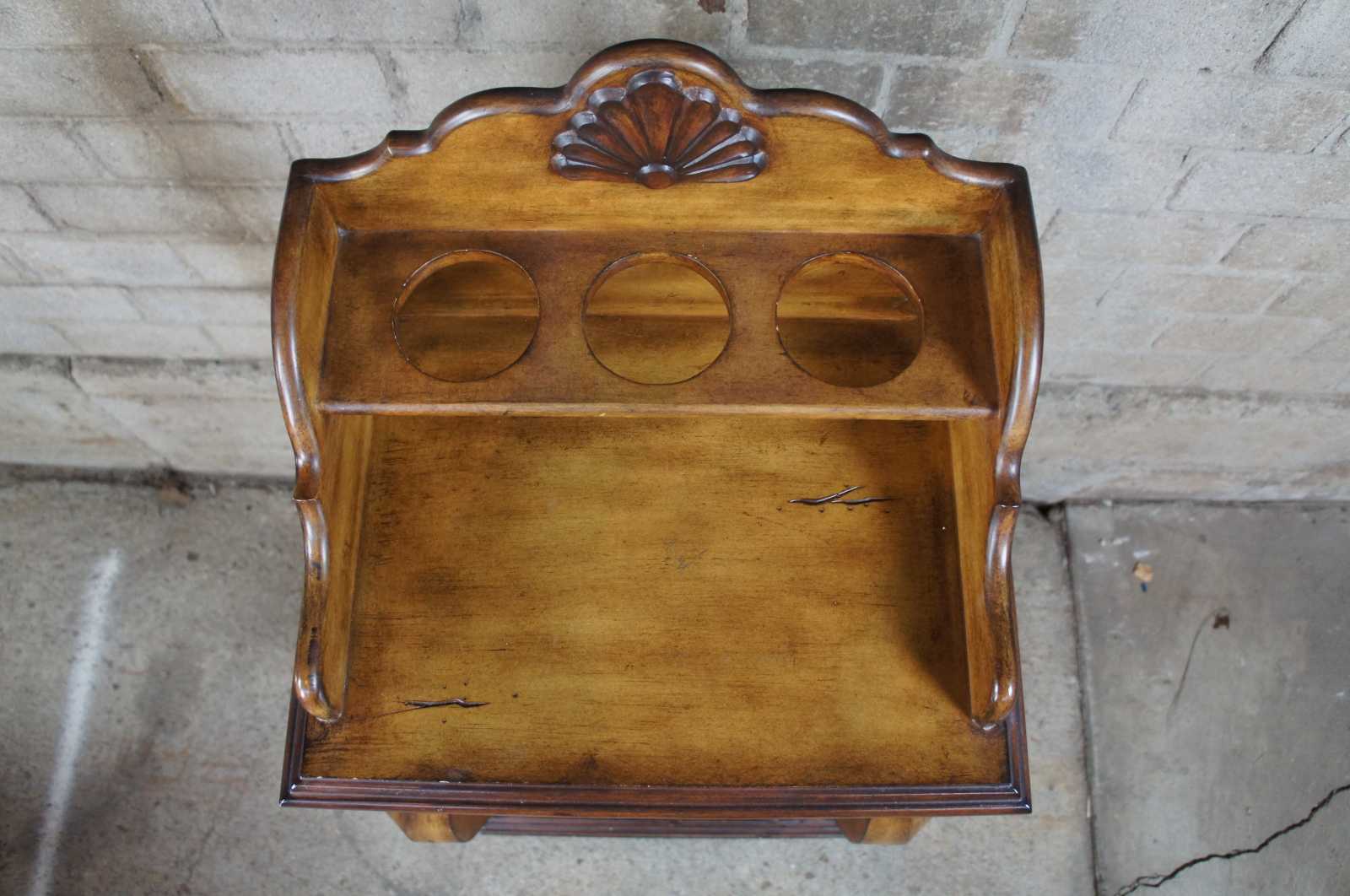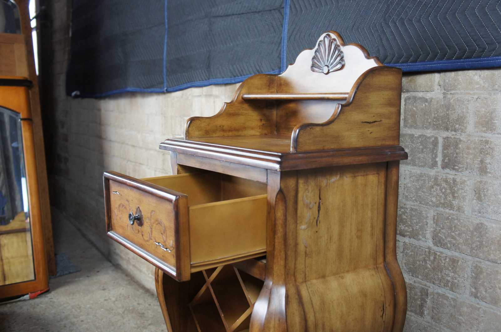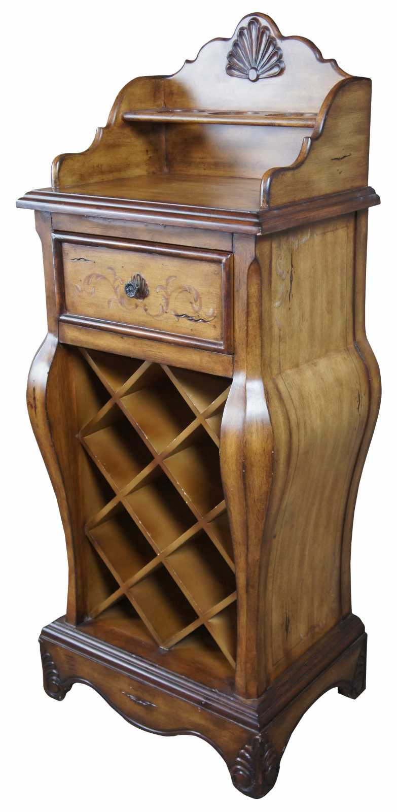 Vintage French Country wine rack. Features hand painted florentine design with bombe or sepentine shaping with a cartouche shell backsplash. One drawer for storage.
