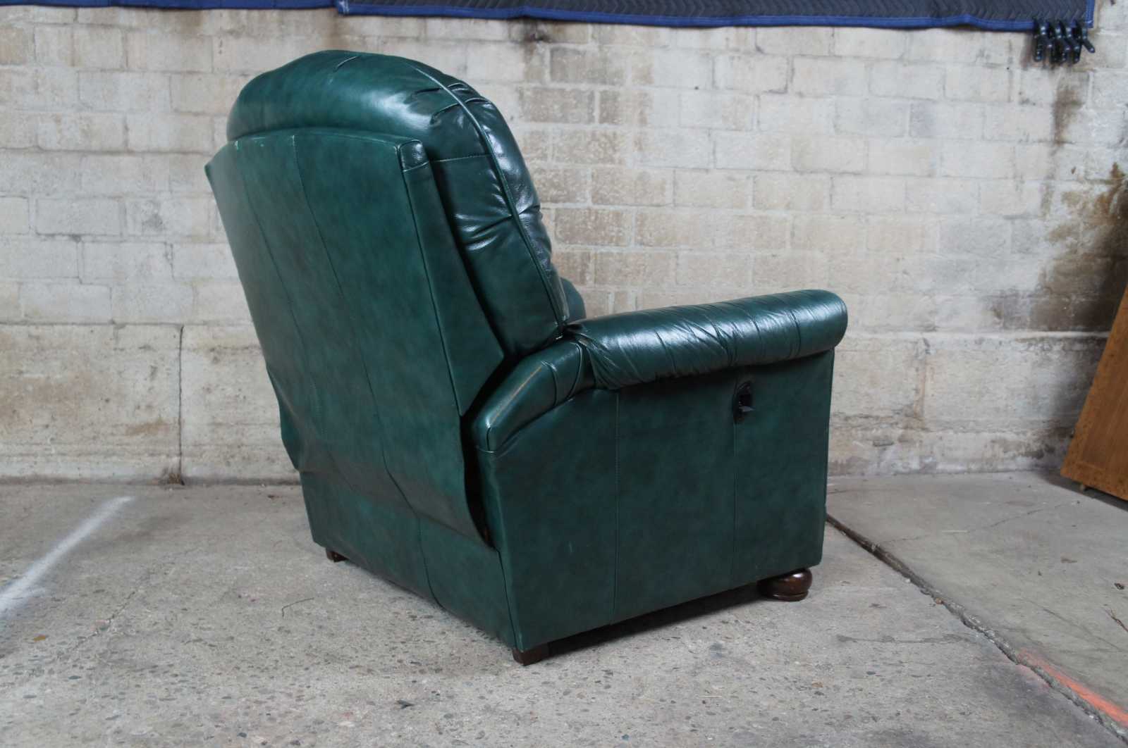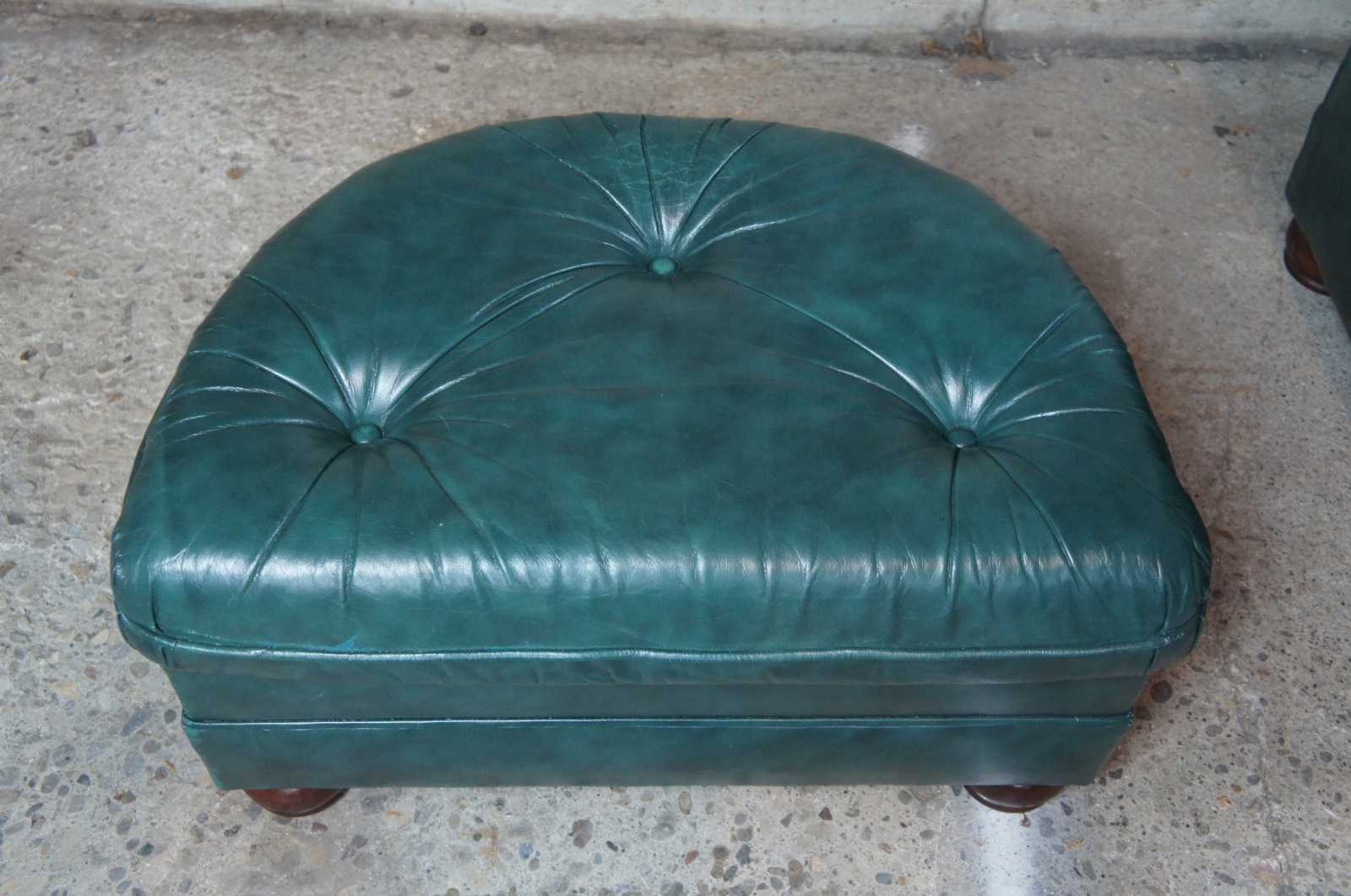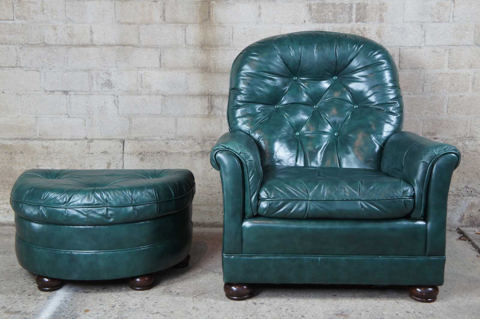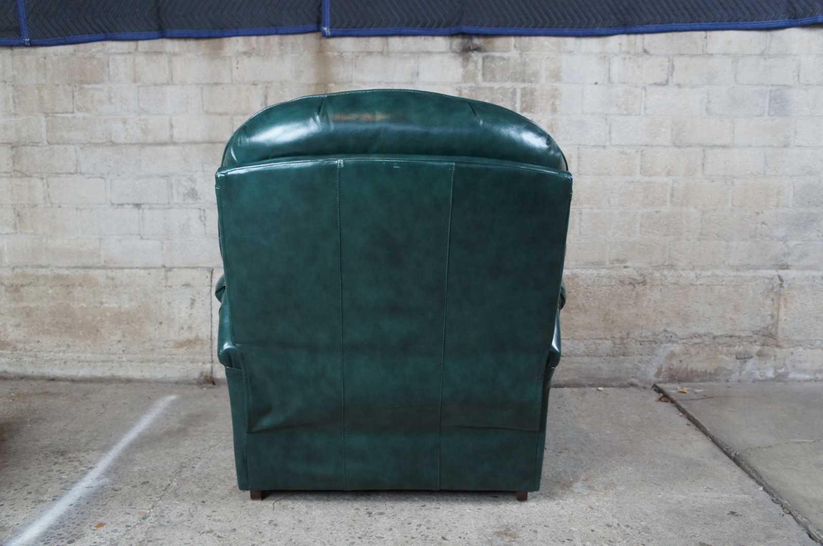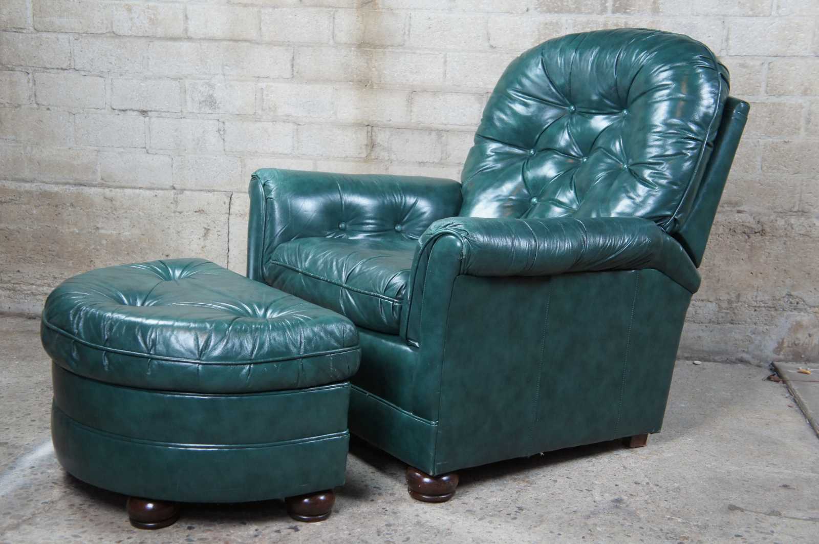 Vintage green leather Rockwell Recliner by Bradington Young. This set includes an armchair with curved crest rail and padded, button-tufted back joining flared armrests. The chair includes a removable seat cushion over a front apron terminating on rounded wooden feet. Also includes a demilune shaped ottoman.