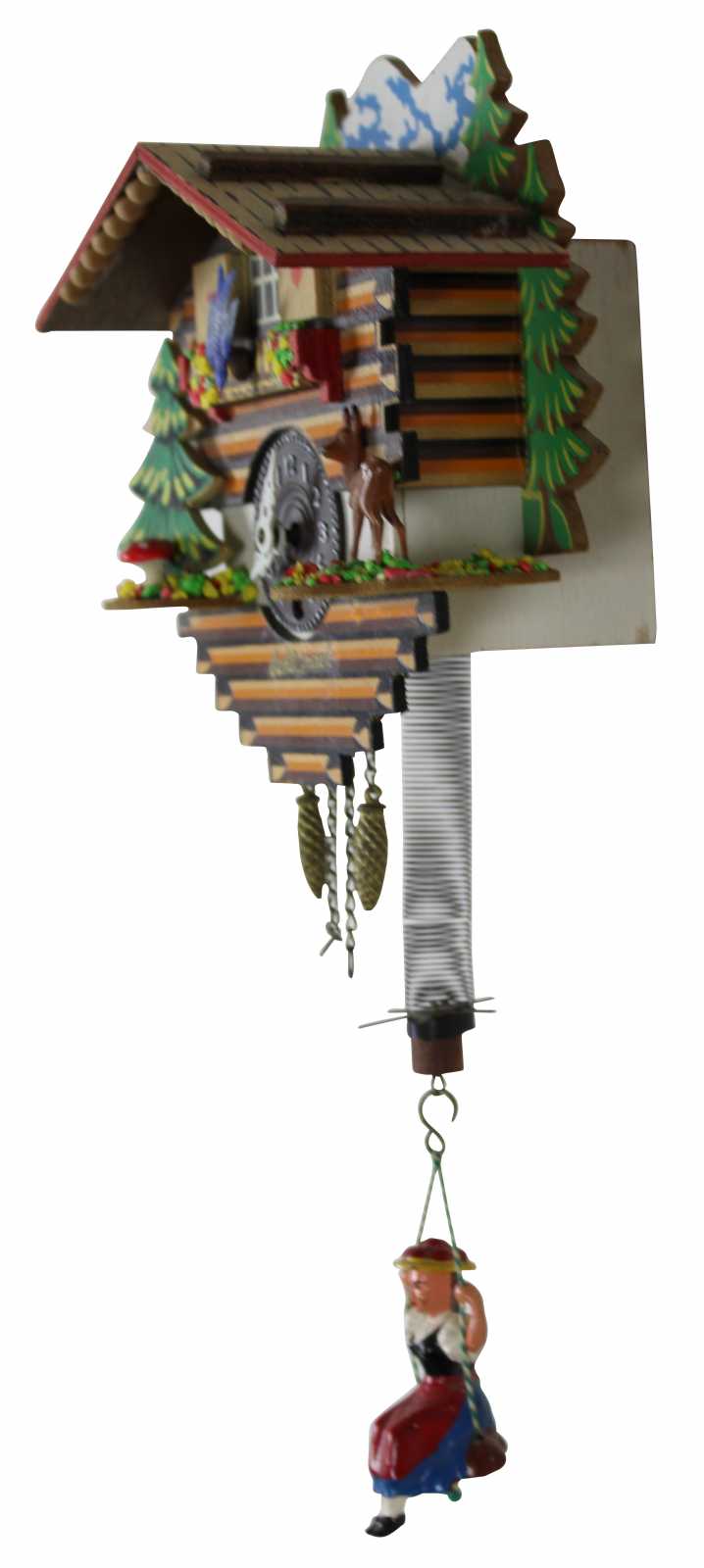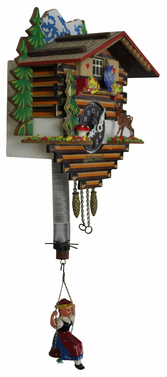 Vintage Echternach black forest wall clock. Purchased in Echternach, Germany. Features a cottage with deer bird. Marked Echternach along the front. Pendulum bounces up and down to keep time.