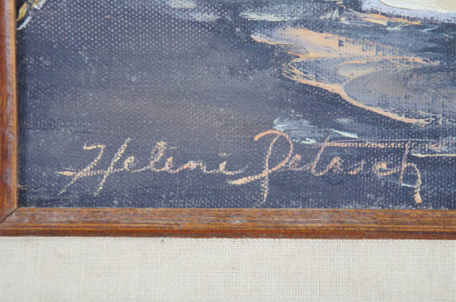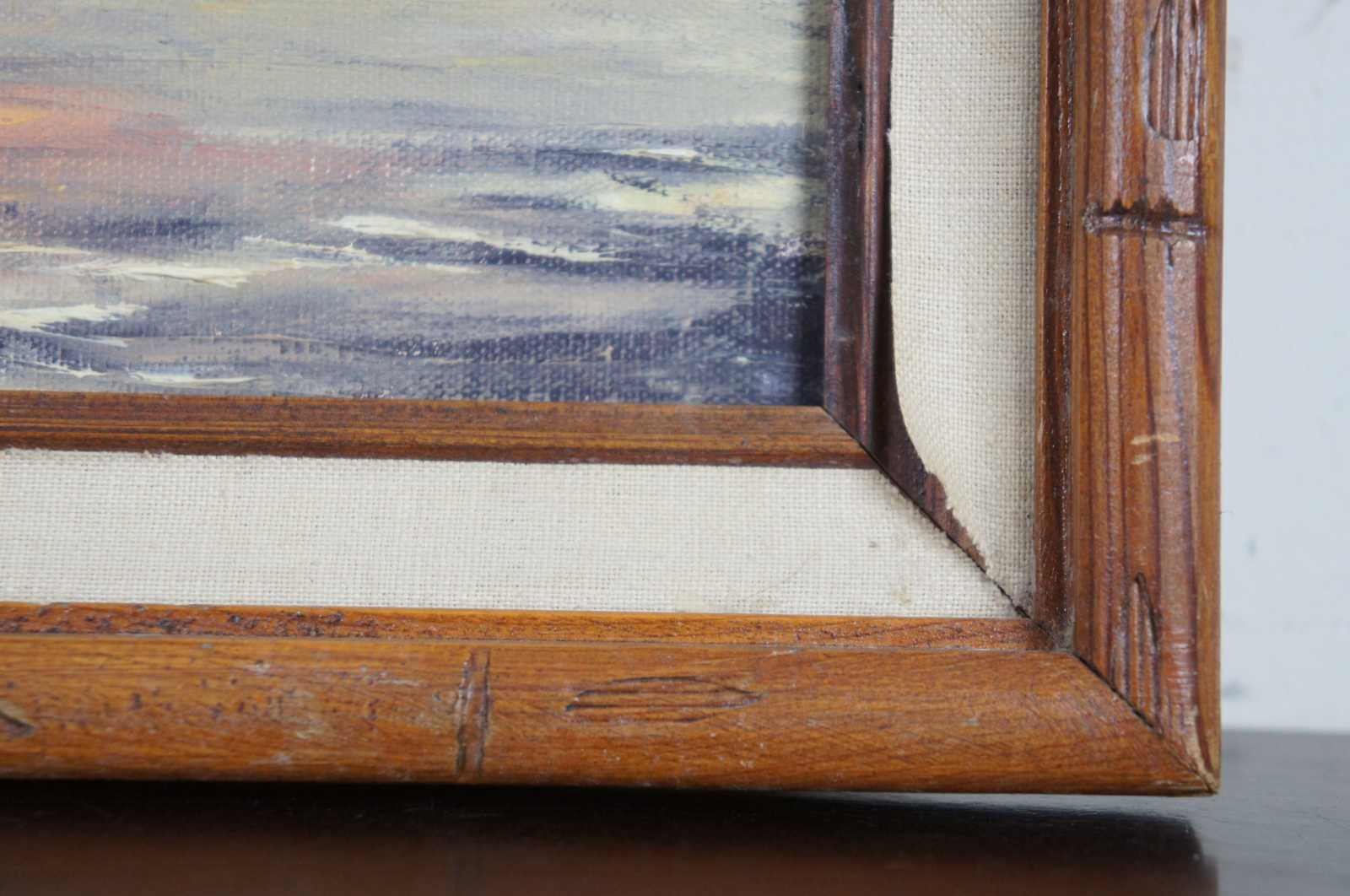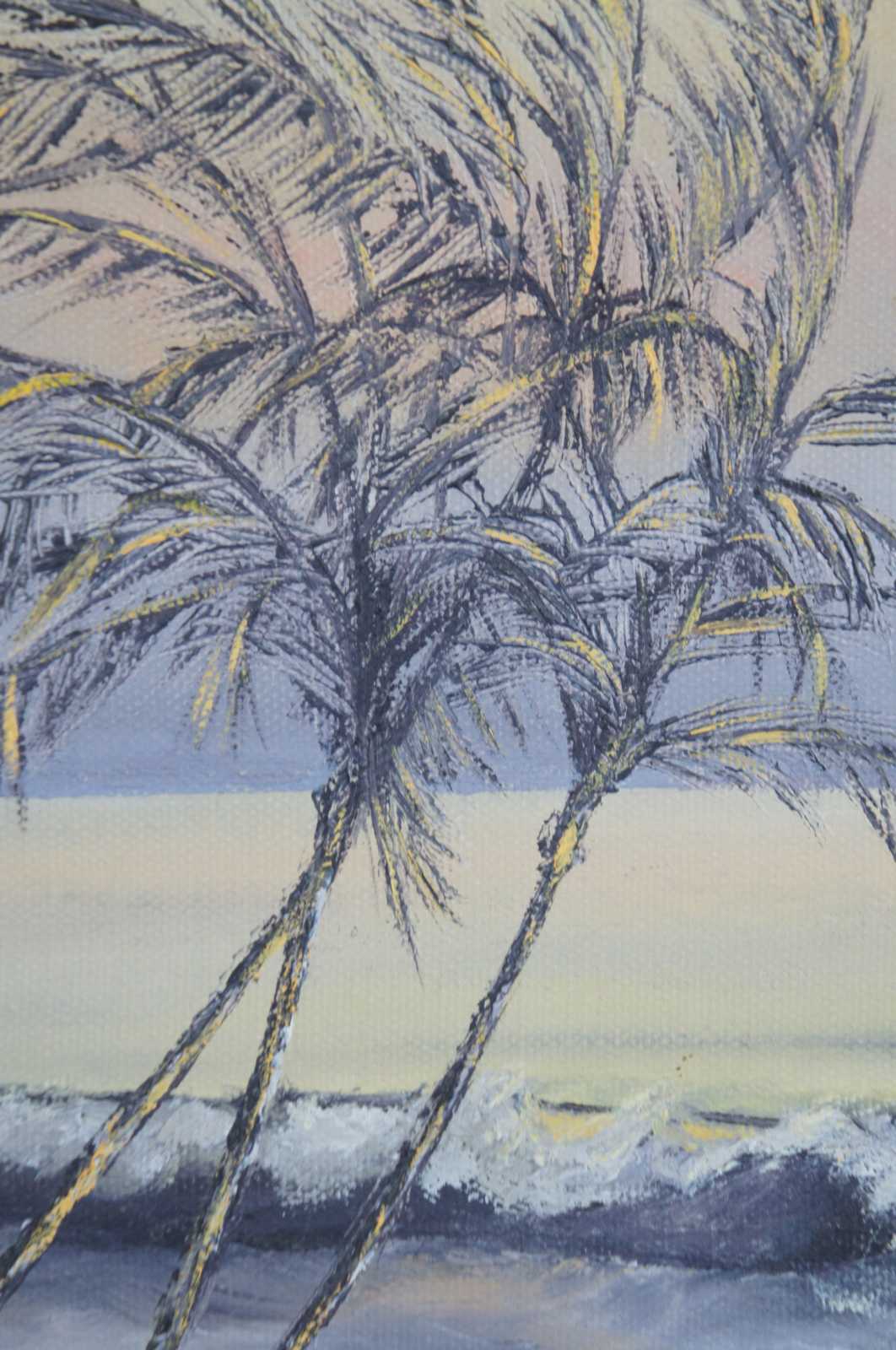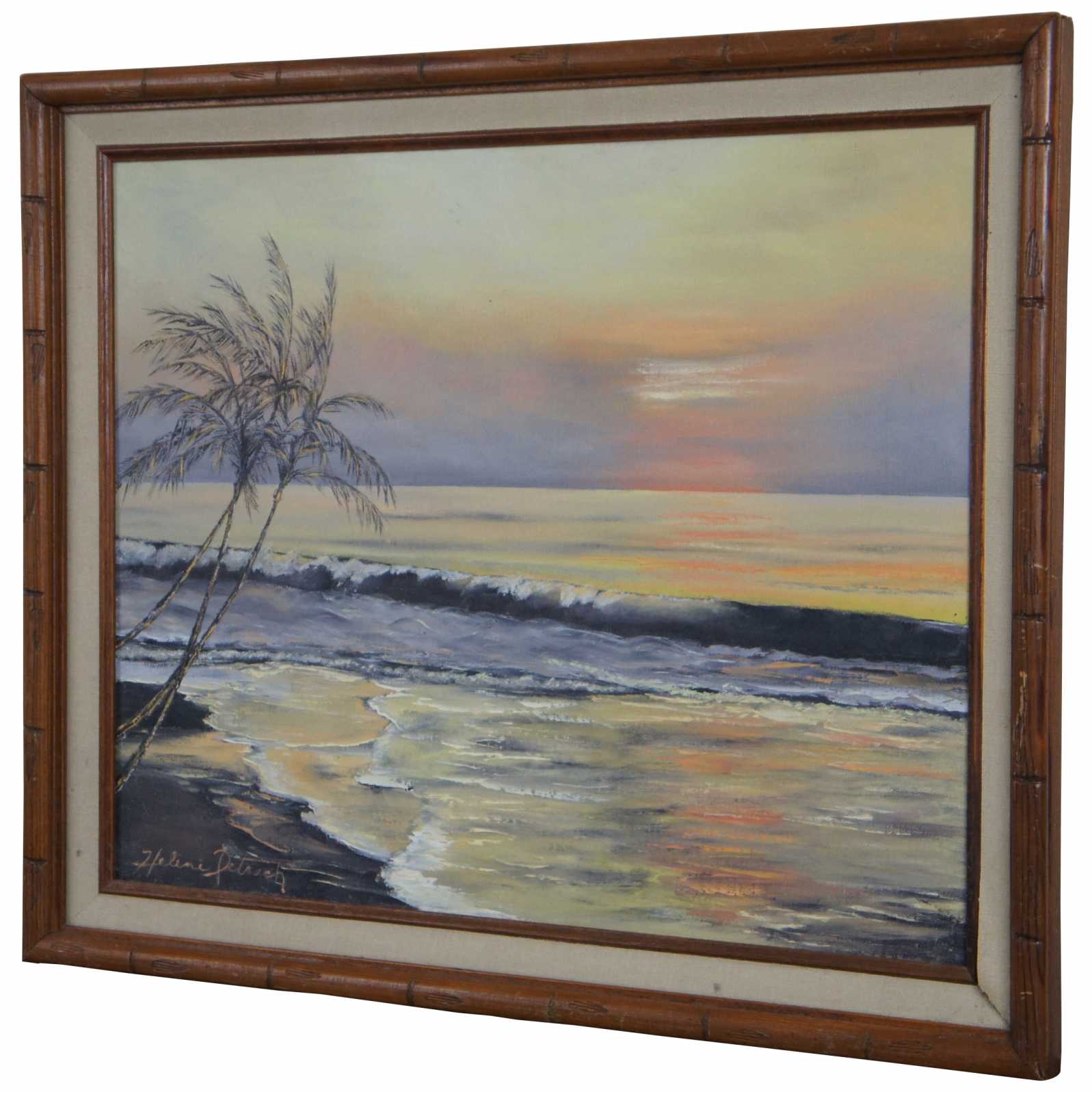 1983 oil on canvas seascape painting by Helene Petrich titled “Jamaican Sunrise.” Features a beach or ocean horizon view with crashing waves and a palm trees in a bamboo style frame. Signed lower left. Helene Pertrich has created artwork for over 40 years; she is active with the Abbotsford Arts Council of Abbotsford, British Columbia.