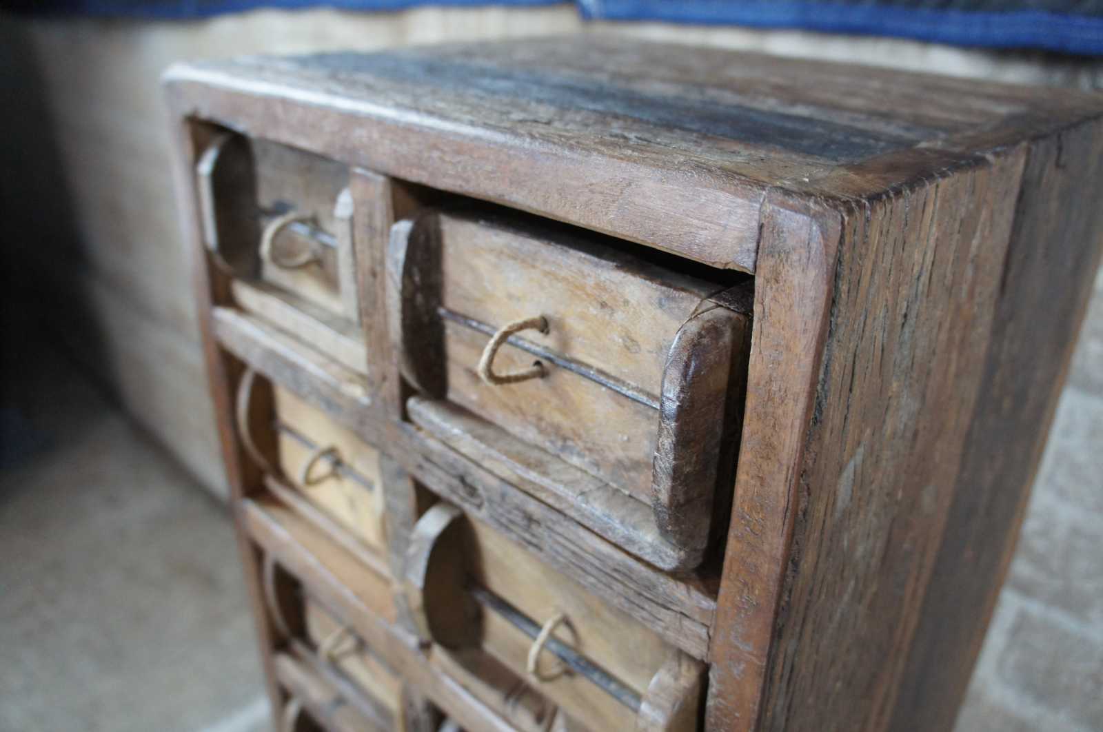 20th Century rustic 18 drawer apothecary cabinet. Made from heavy wood with iron accented drawers featuring a unique rope pull design.