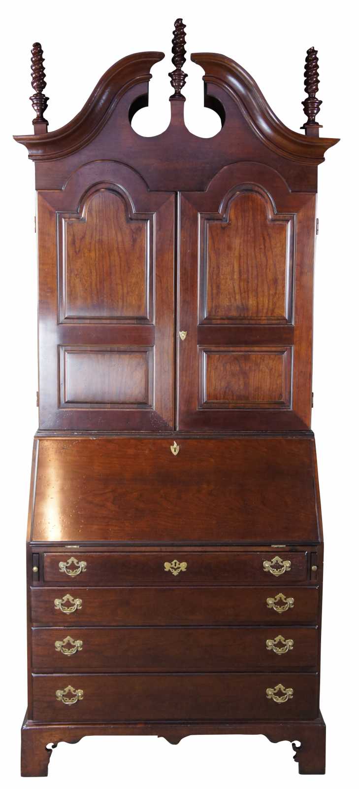 A Monumental New England style secretary desk from Wright Table Company. Made from solid cherry wood and veneers. Features a broken pediment with three flame turned trophy finials. The arched doors open to pigeon holes,shelves and a raised scalloped comparments. The desk portion features a drop front with multiple shelves and compartments. Graduated drawers below have brass tone batwing plates; and rest upon ogee bracket feet.
