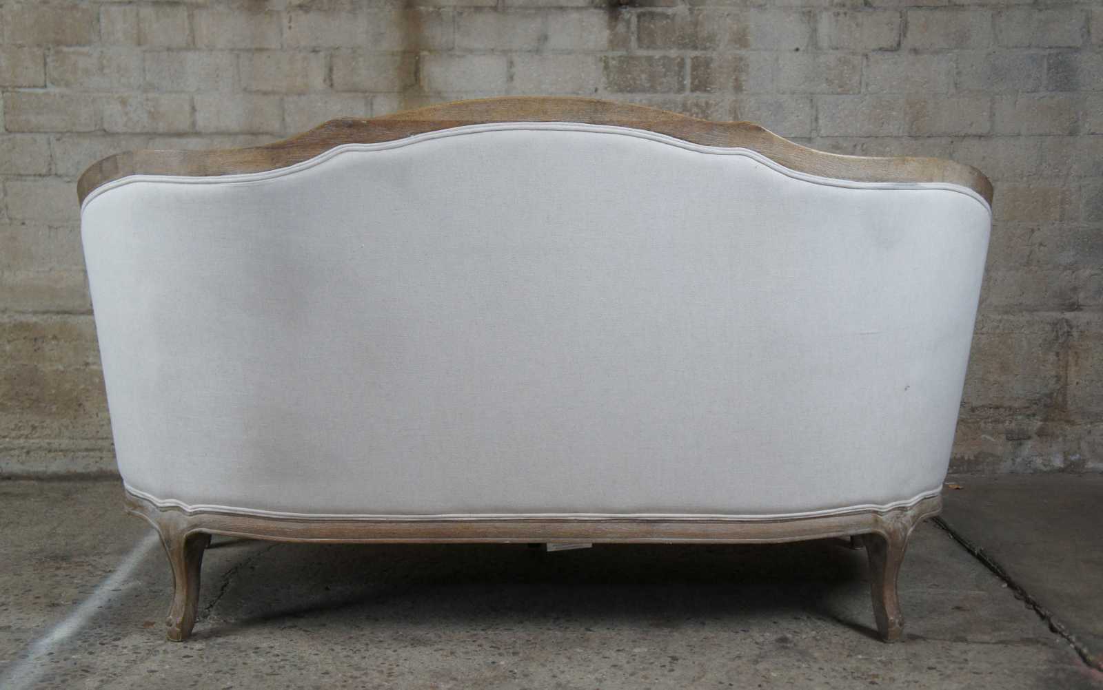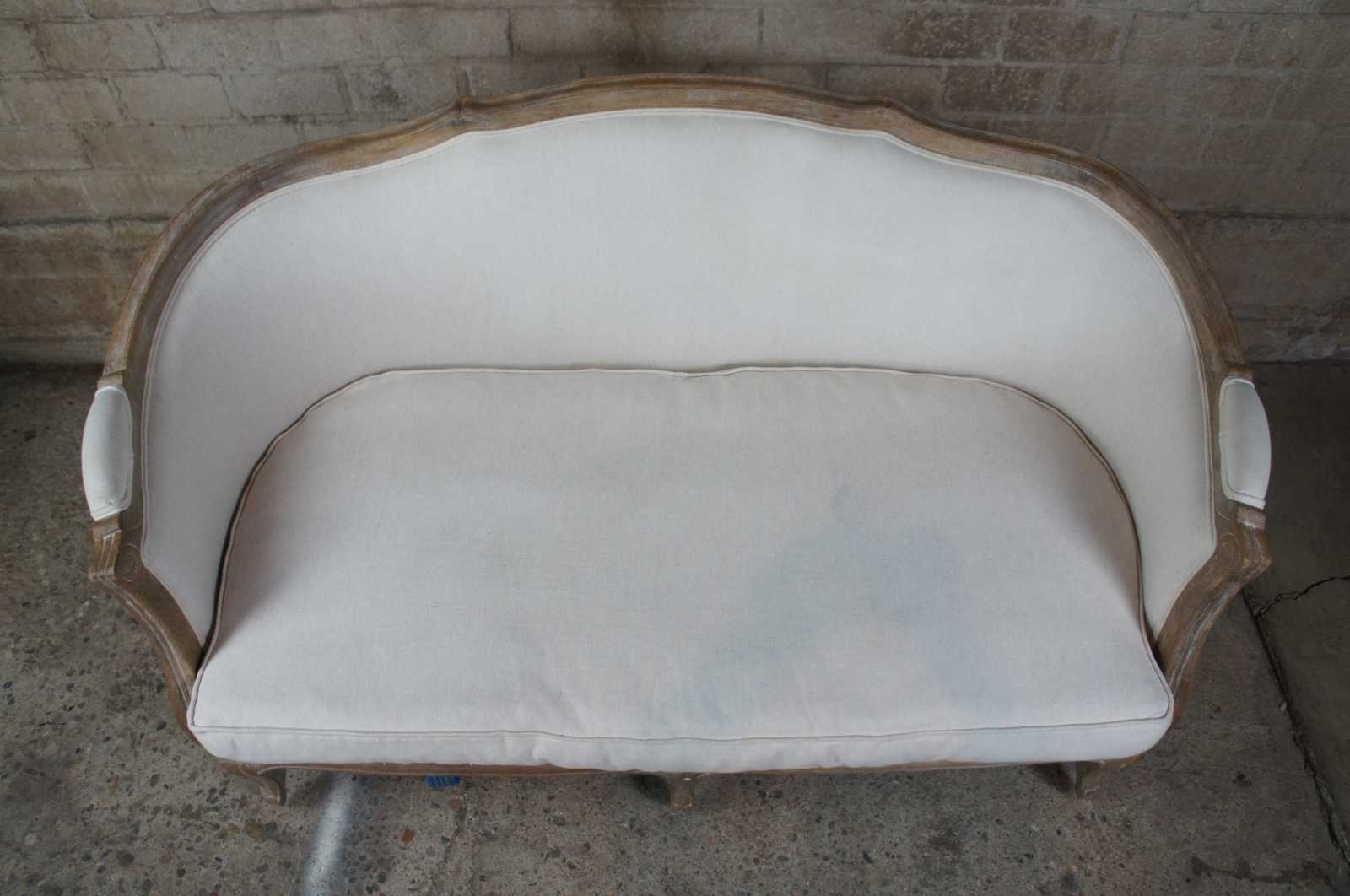 With its perfect proportions and cushioned, wrap-around back, this French settee creates a cozy retreat for a bedroom or sitting room. Limed finished, solid oak frame is crafted in the classic Louis XV style with fluted scrolling arms, serpentine skirt and cabriole legs. Circa 2010