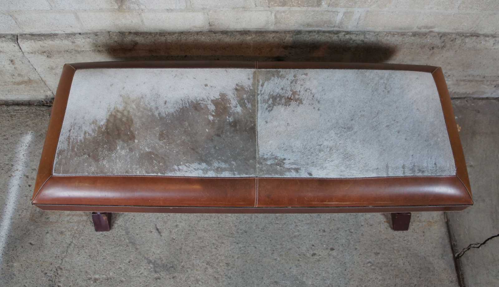 Frontgate X frame French Empire inspired bench. Upholstered in a brown leather with cowhid along the top.