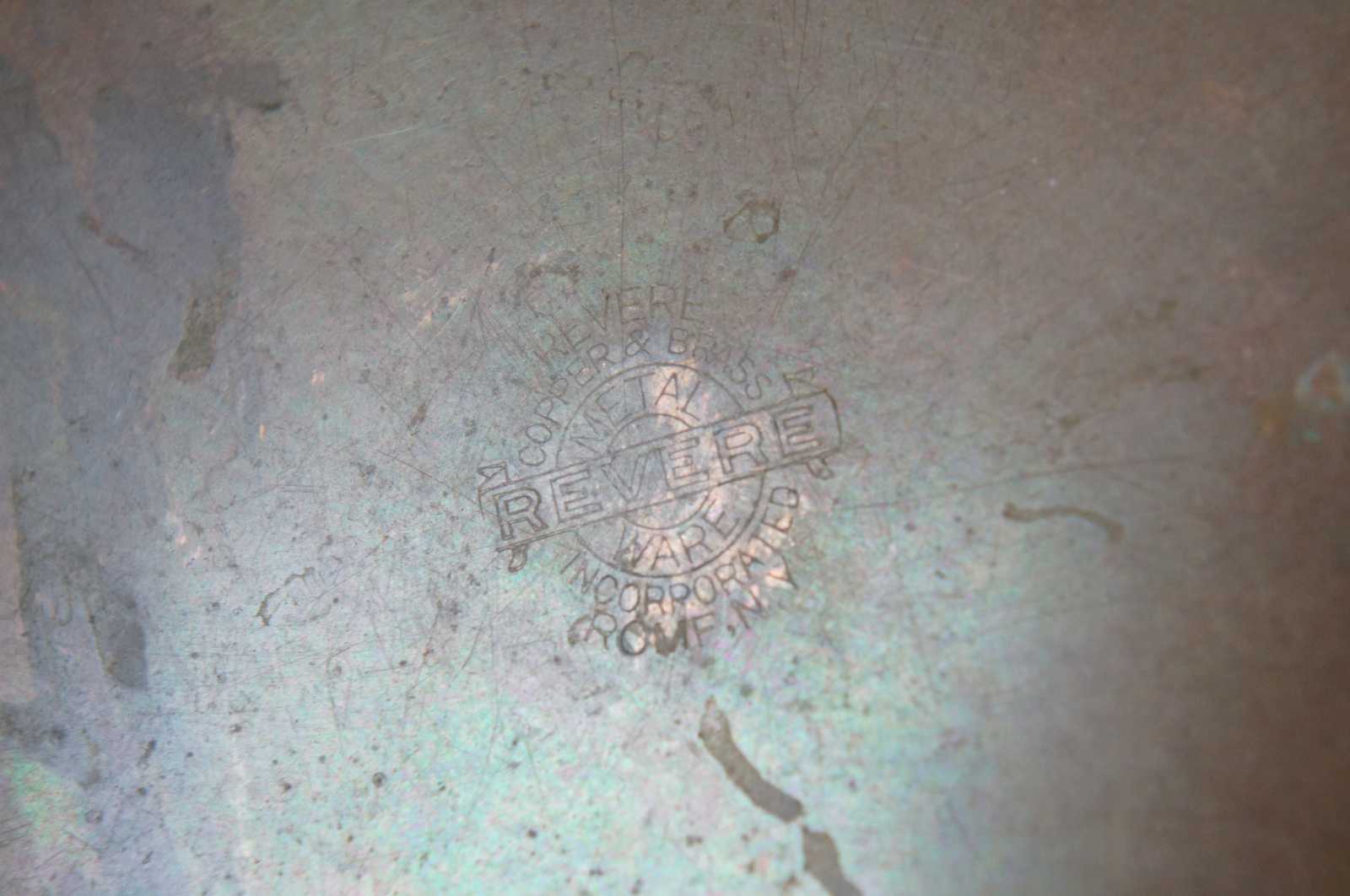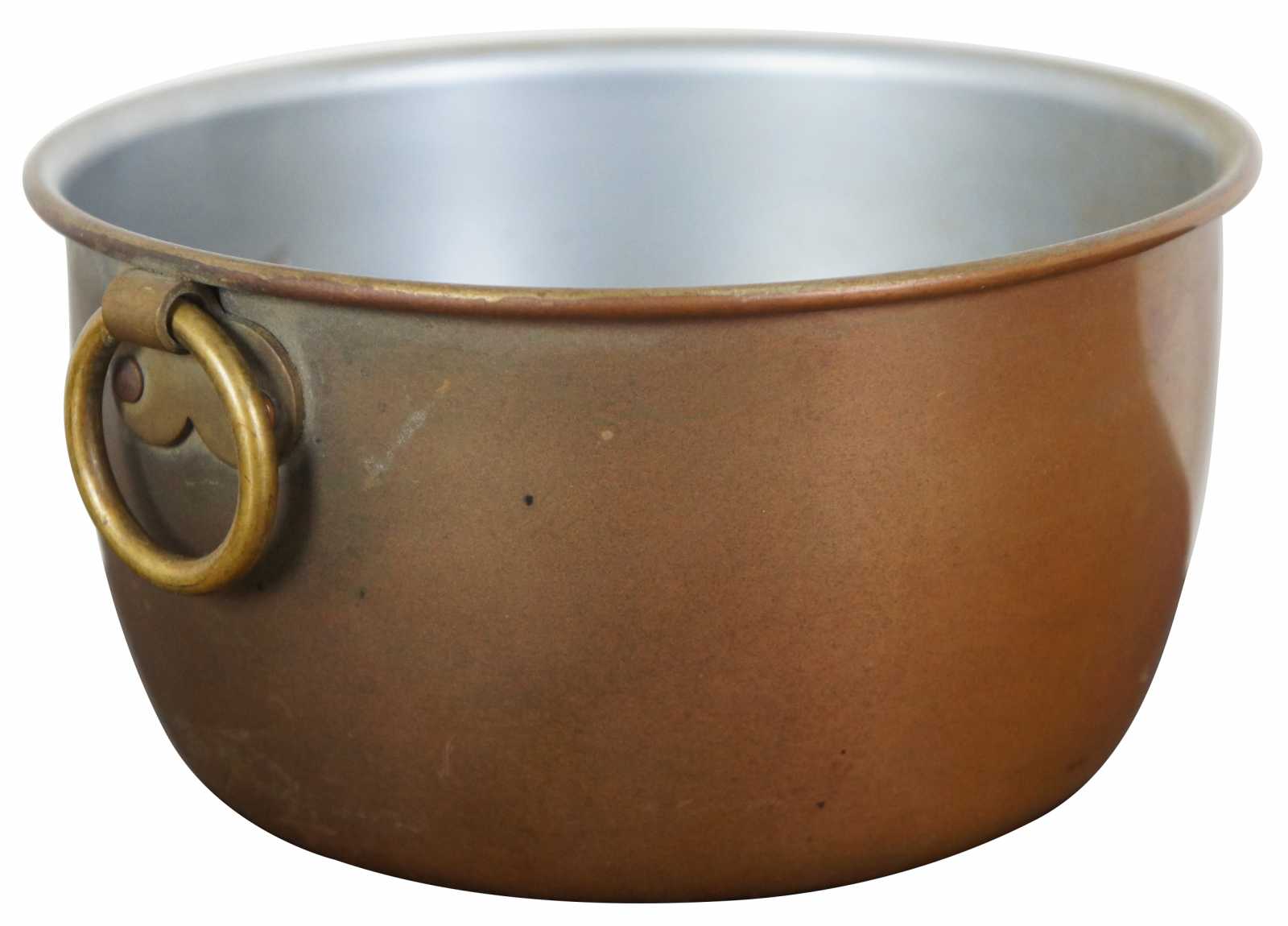 Vintage Revere metal ware copper pot with brass ring on one side for hanging and no handles.