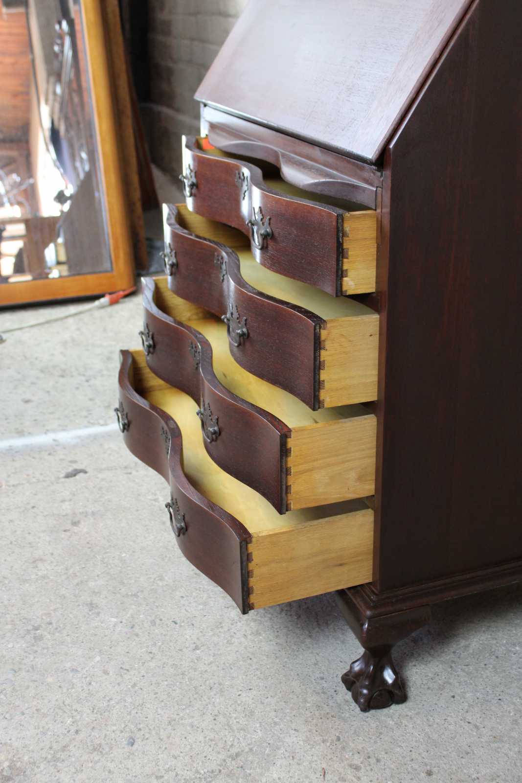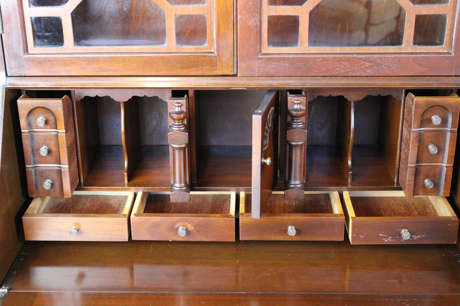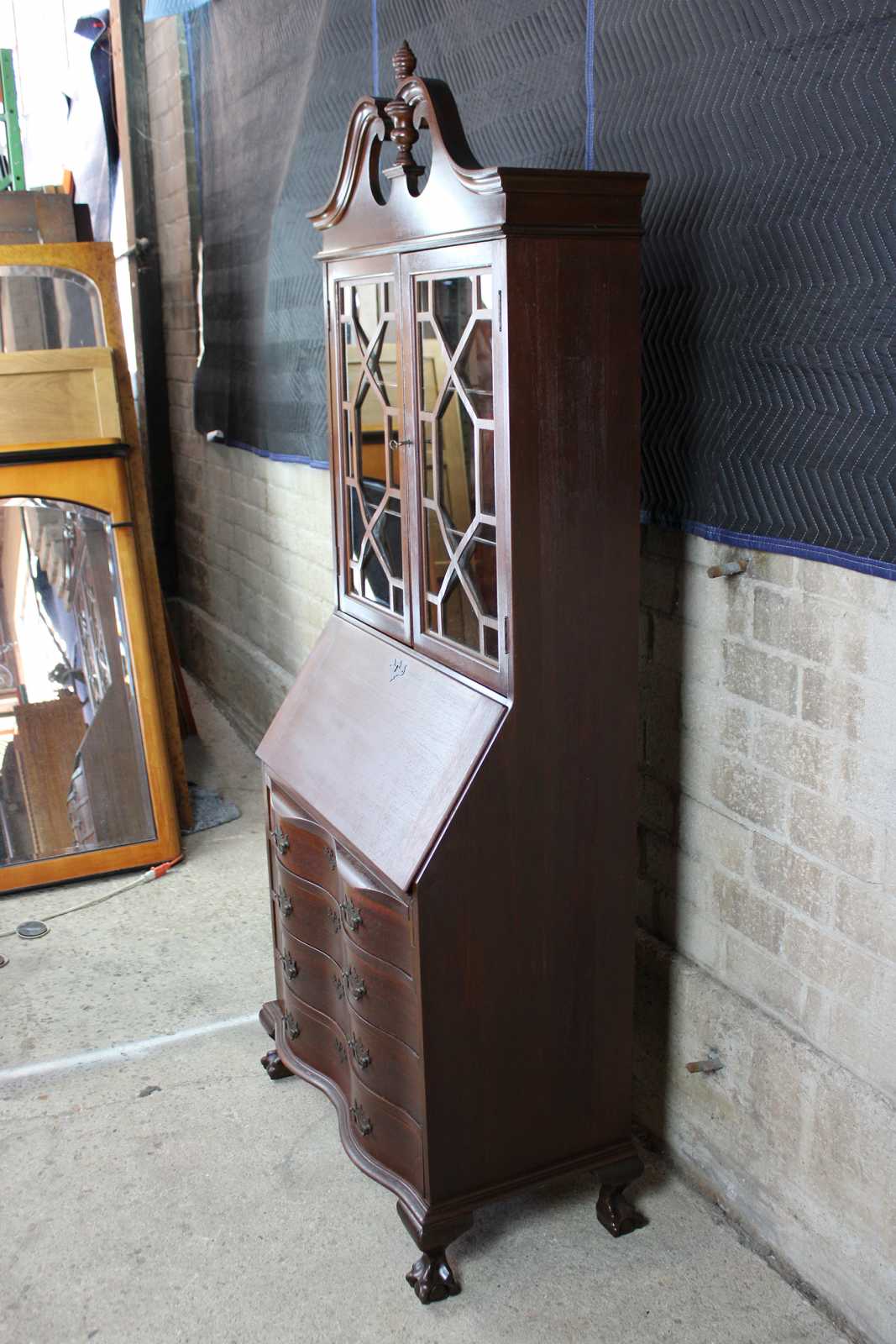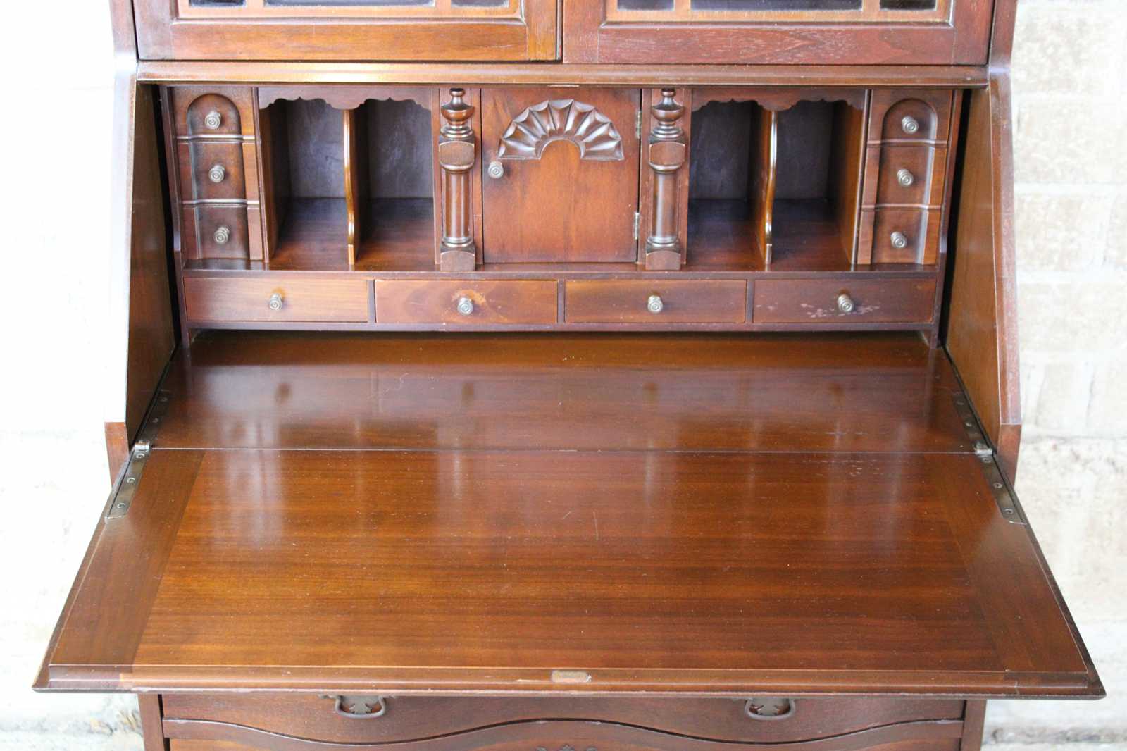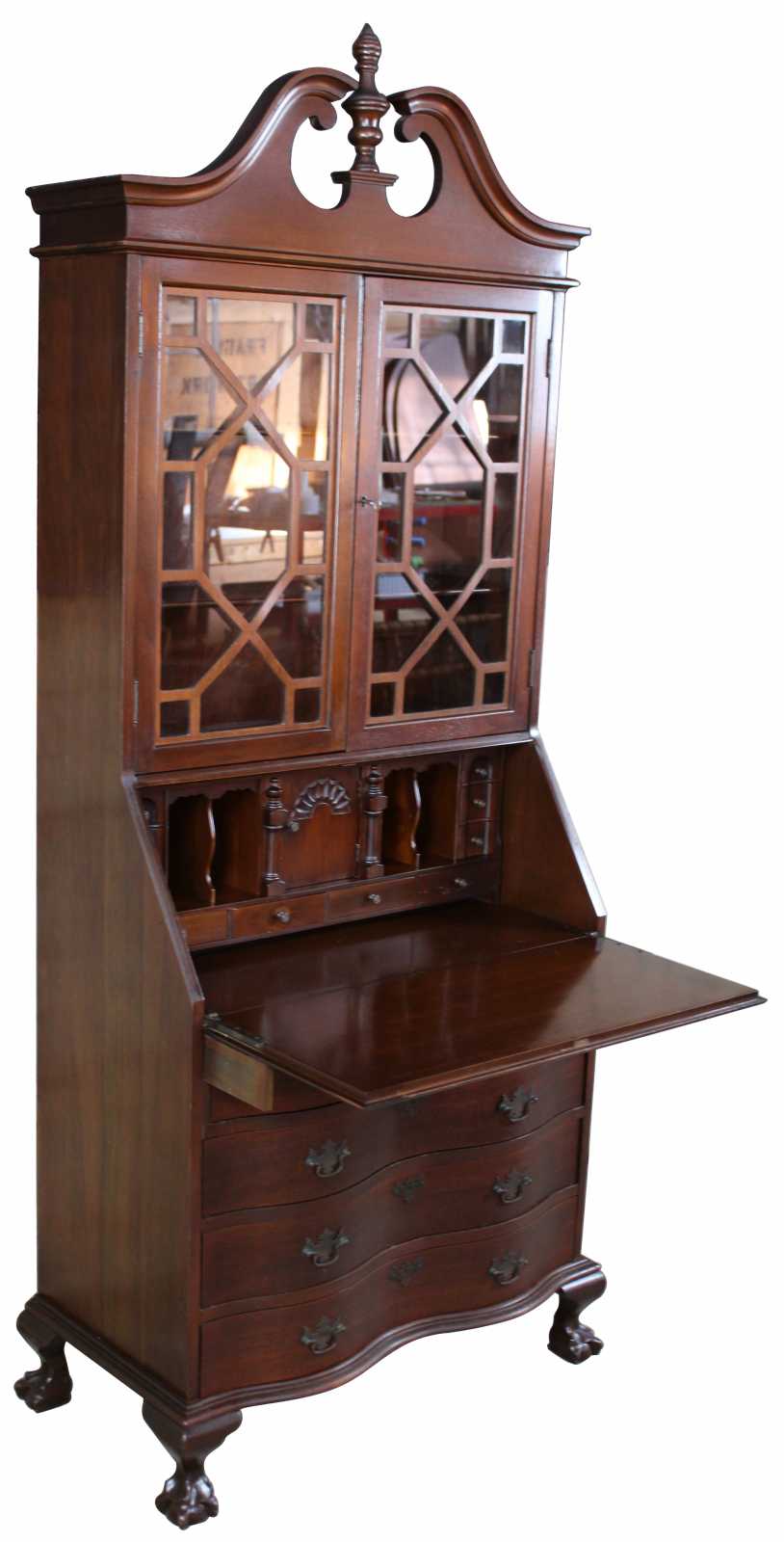 A gorgeous serpentine front one piece secretary desk. Made from American walnut. Interior opens to four drawers, pigeon holes and hidden compartments. Upper bookcase portion shows an open pediment with turned finial. Doors are glass with fretwork. There are 2 interior bookcase shelves. Hardware is made of brass in classic Chippendale fashion, circa 1940s.