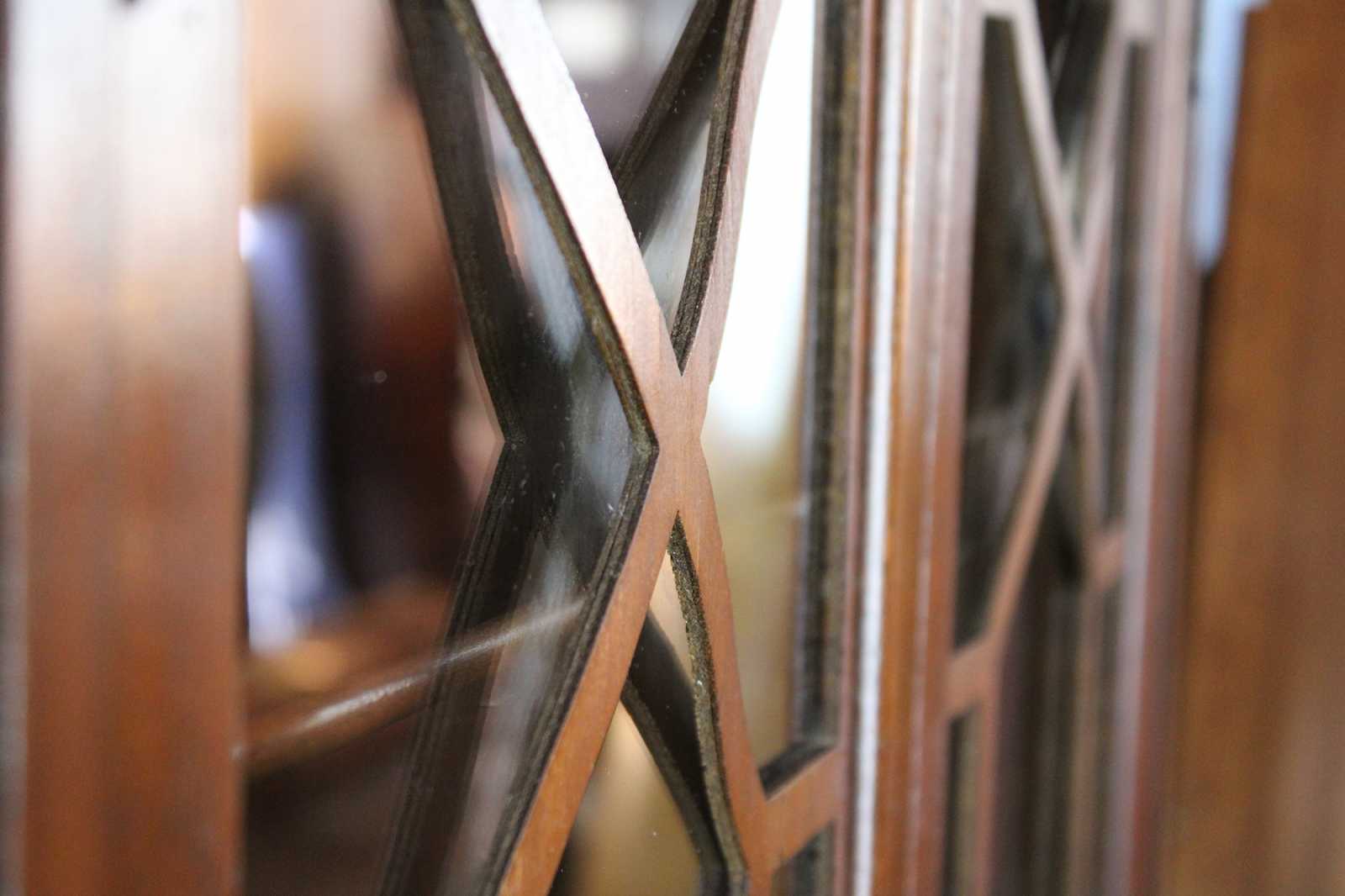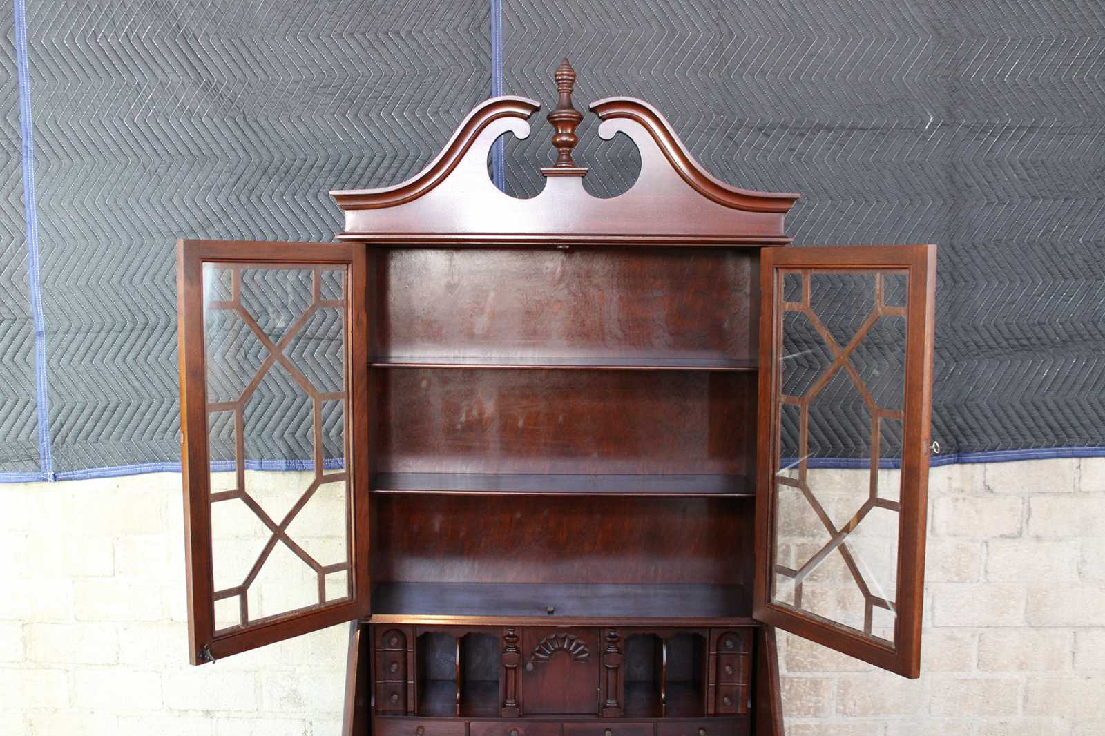 Good Antique Condition; Some finish wear to doors and finial. Fretwork is bowing/ slightly raised from surface. See Pictures
