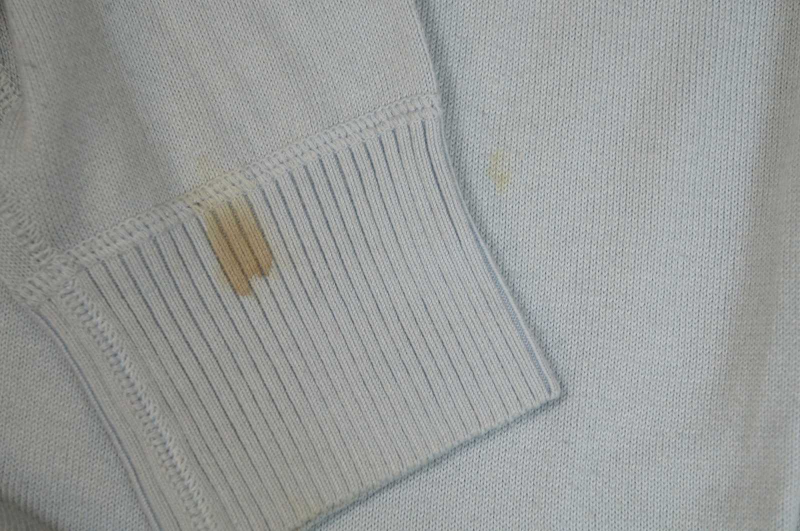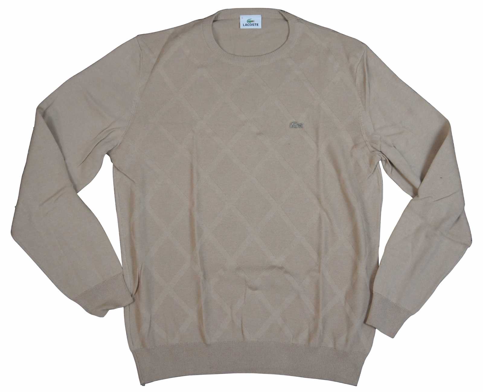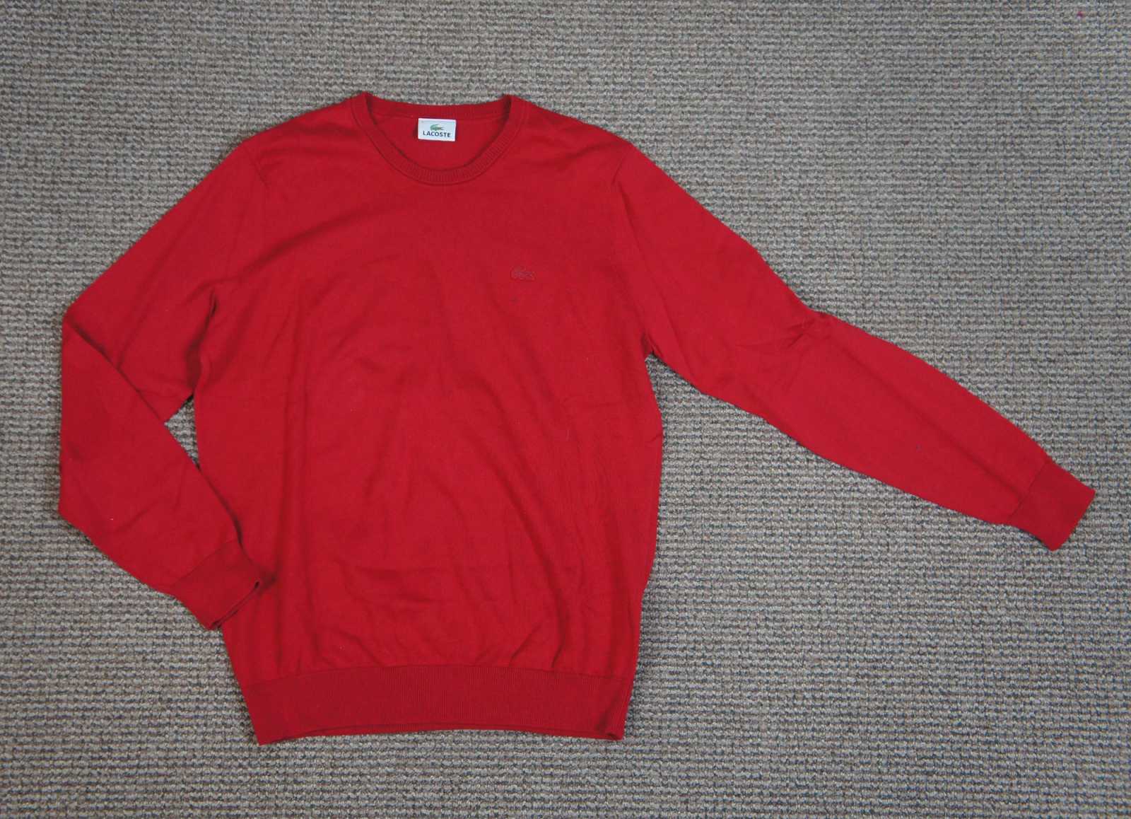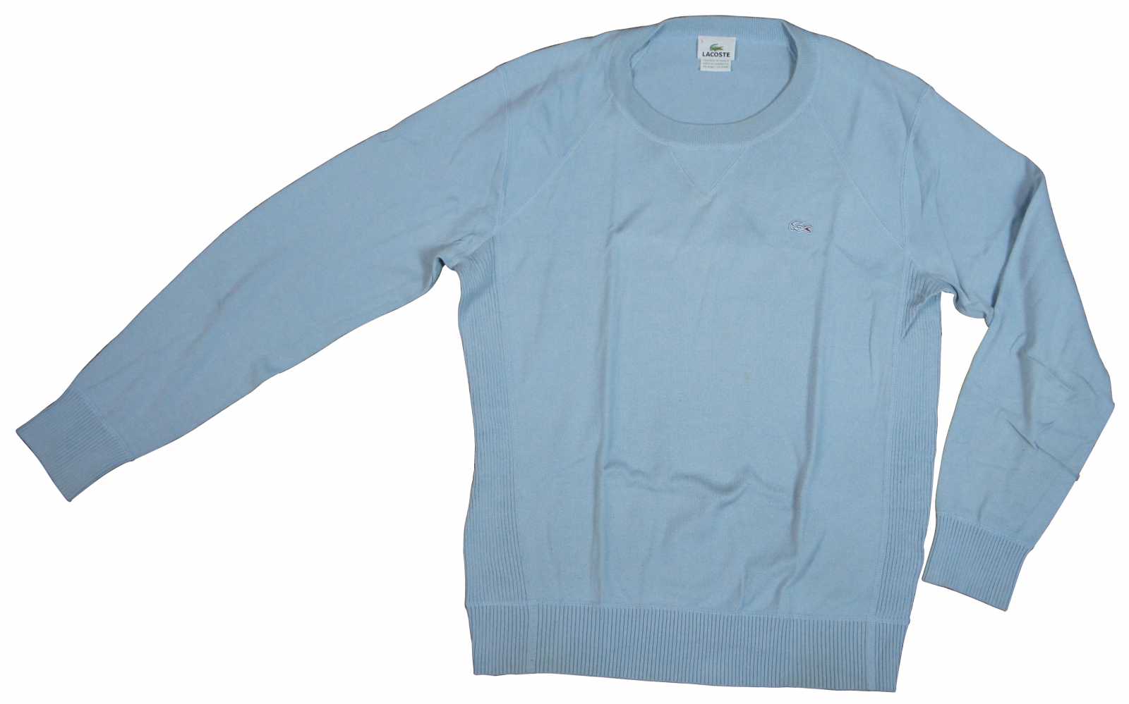 Tan, powder blue and red Lacoste men’s long sleeve, crew neck pull over sweaters.