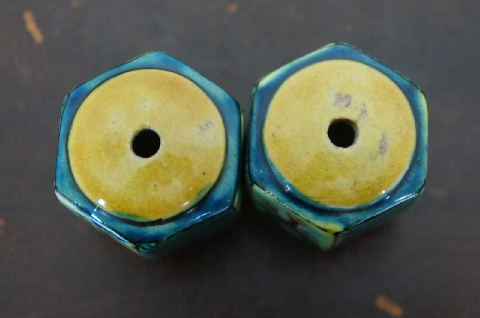 Vintage Asian hand painted porcelain fuchin scroll weights with yellow and blue tops and alternating side panels of green patterns and flowering plants.