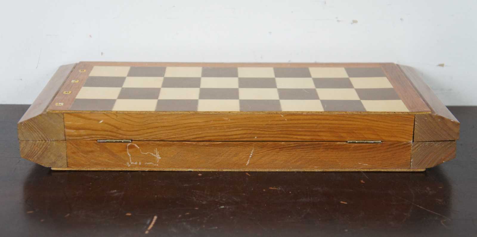 Vintage folding chess board with full set of wood pieces and felt lined inner compartment for storage and magnetic closure.